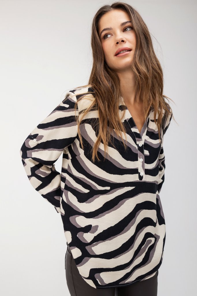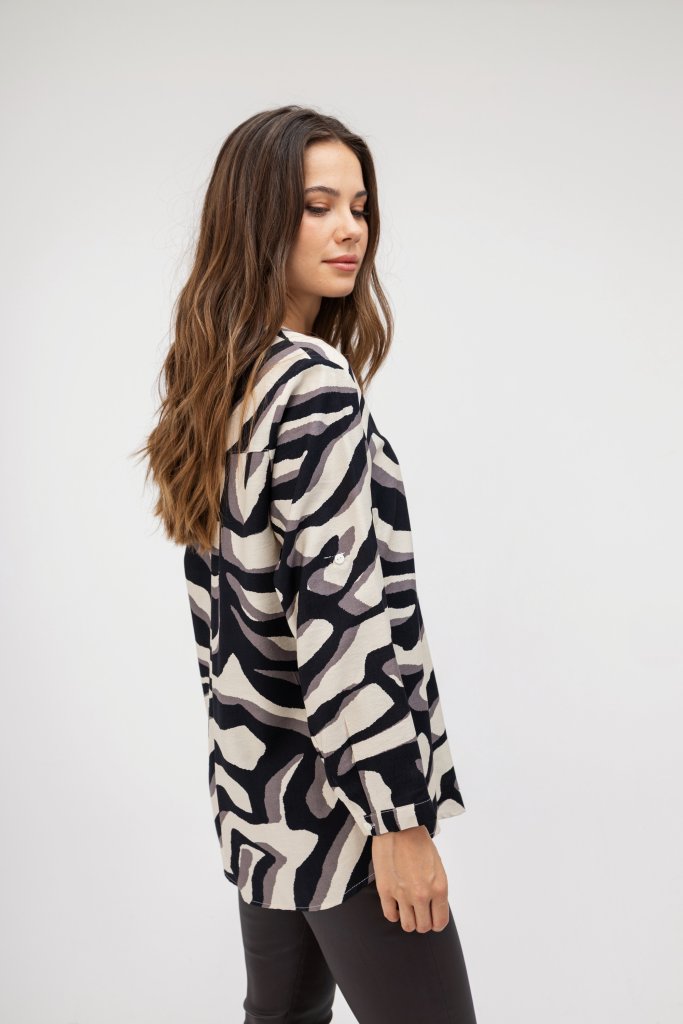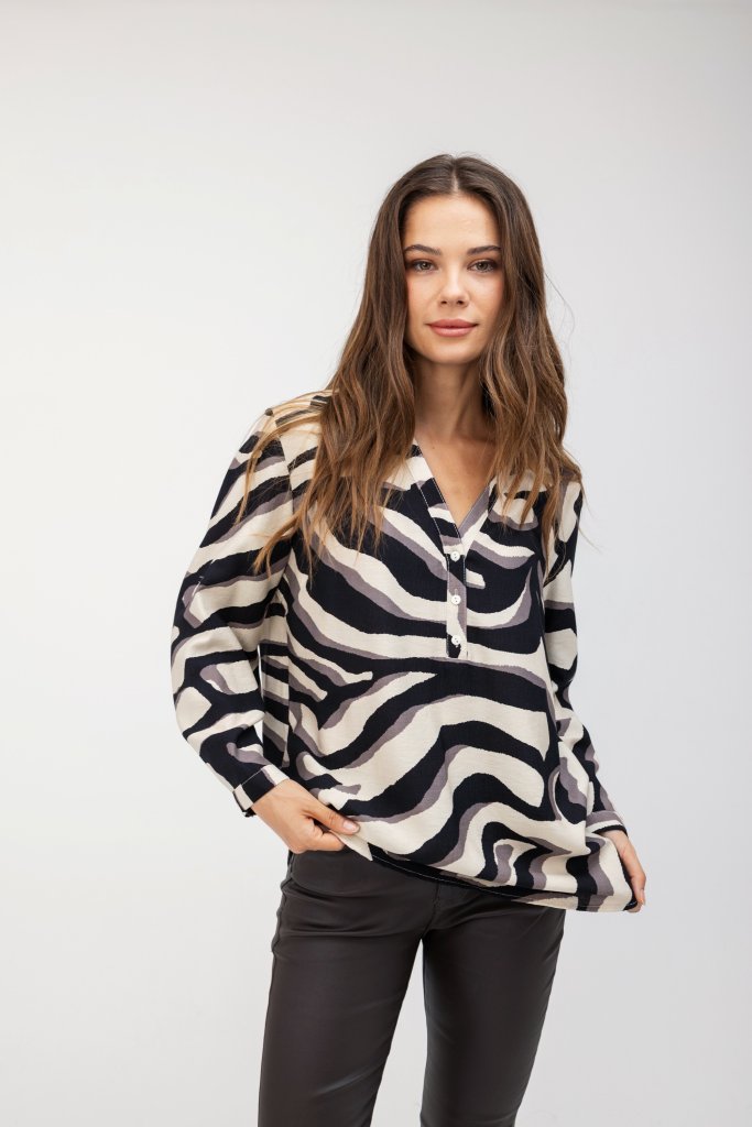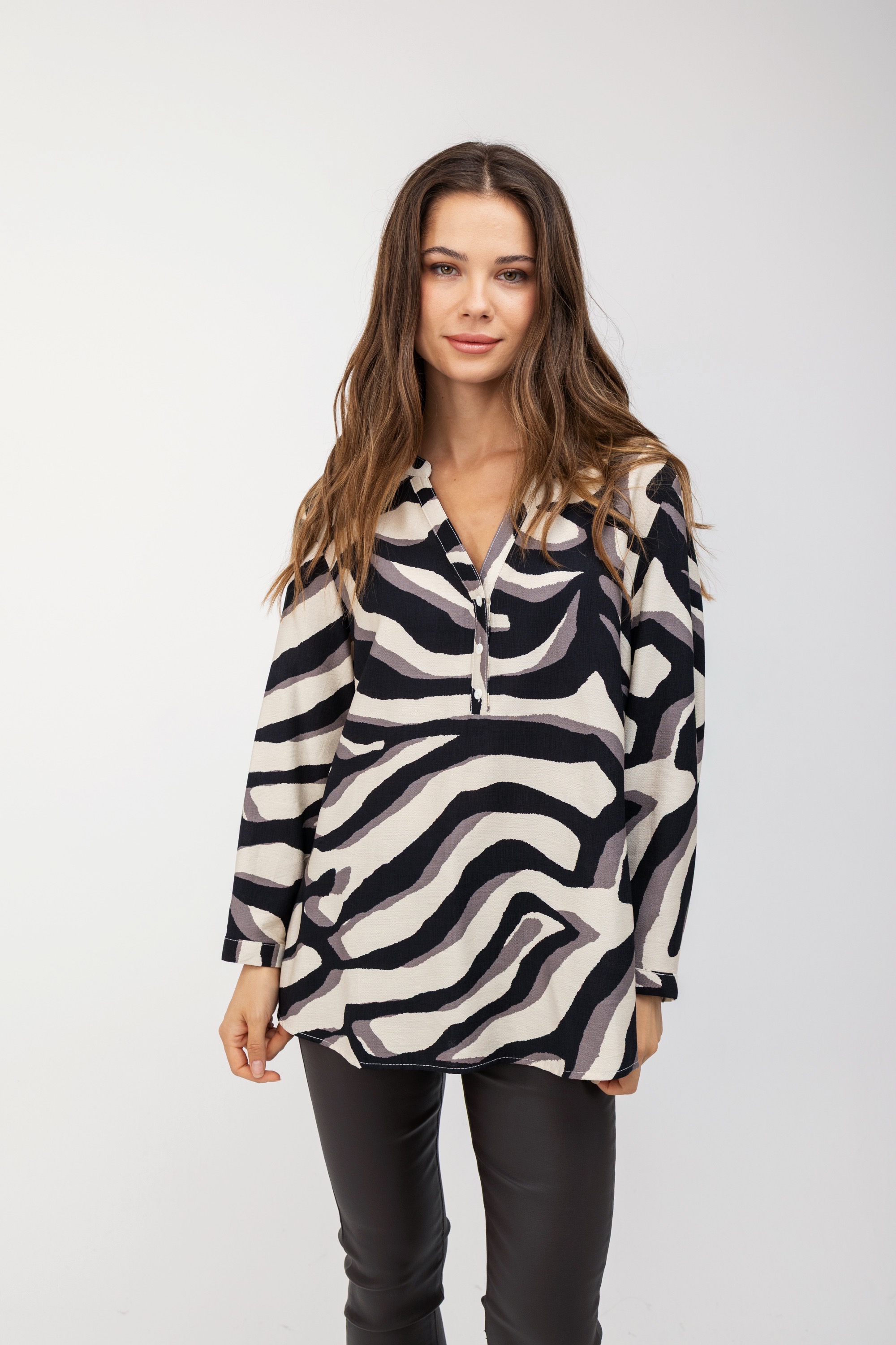 Γυναικείο πουκάμισο σε μπεζ χρώμα με μαύρα και γκρι εμπριμέ σχέδια. Κλείσιμο με κουμπιά. Ένα κομψό σχέδιο για elegant εμφανίσεις στο γραφείο ή στη βόλτα. Το συγκεκριμένο μοντέλο έχει φαρδιά εφαρμογή.