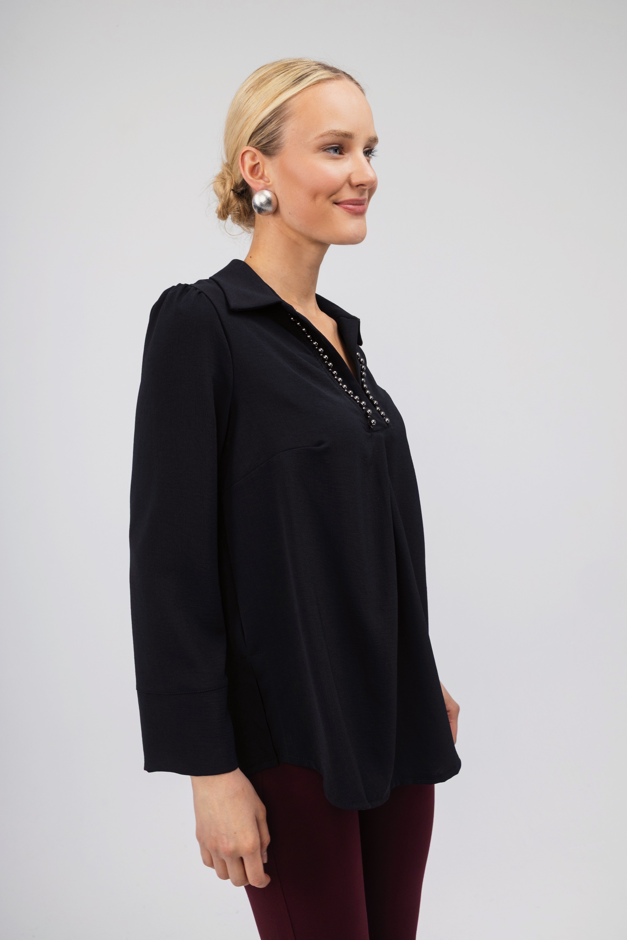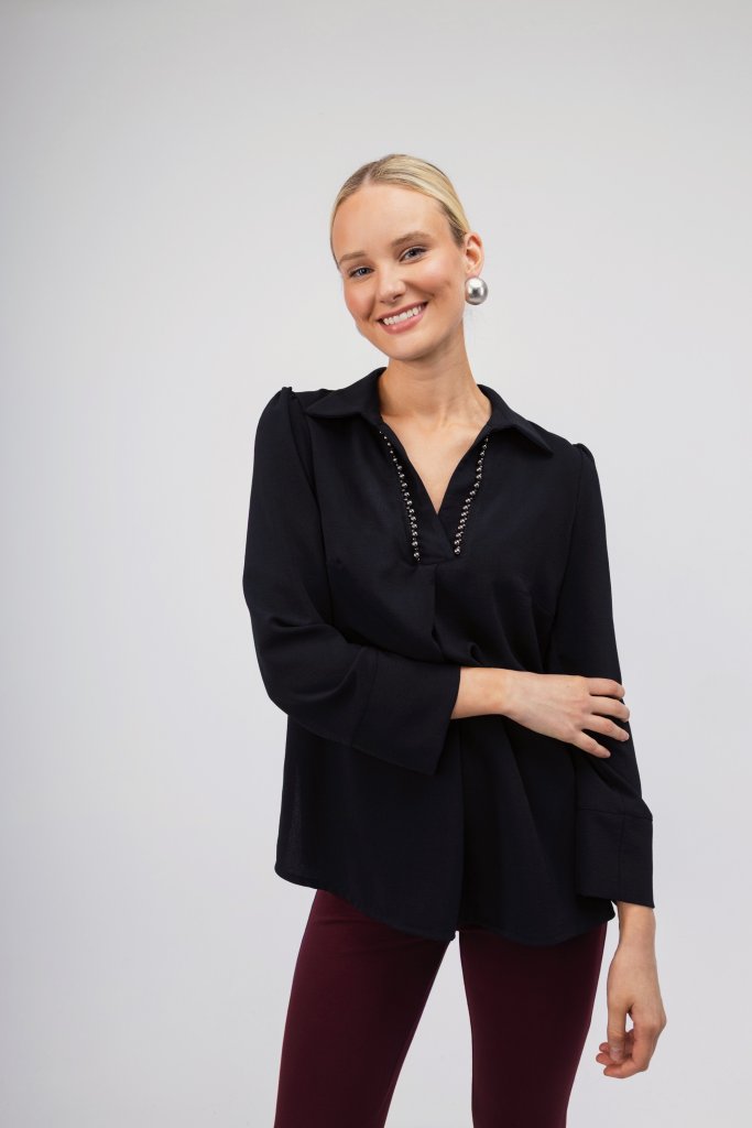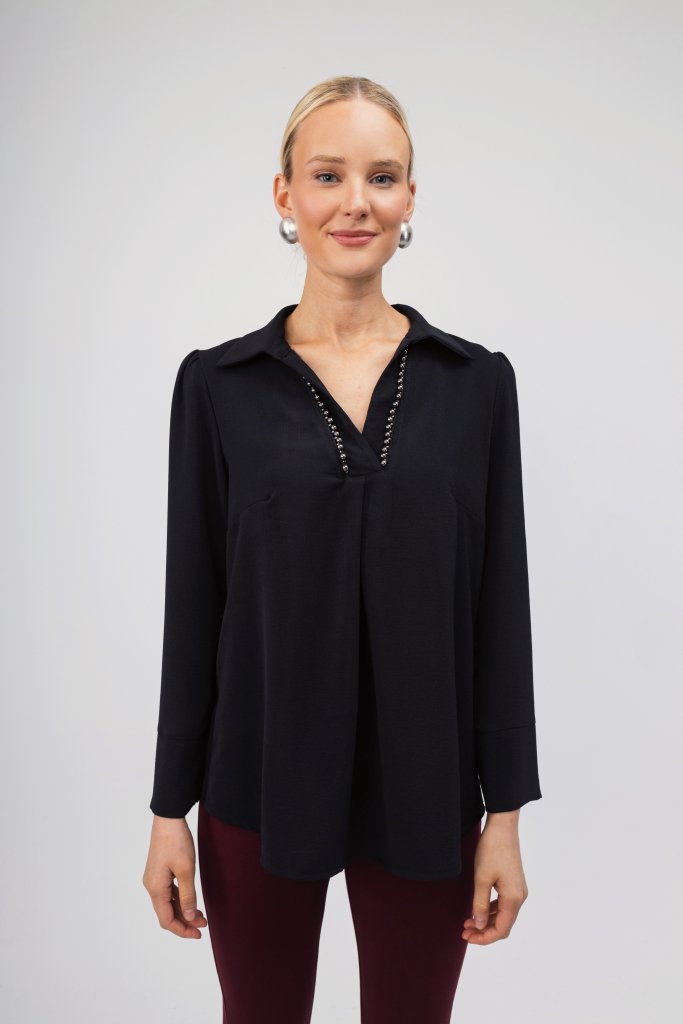 Γυναικείο πουκάμισο σε μαύρο χρώμα διακοσμημένο με διακριτικές πέρλες. Διαθέτει ανοιχτή λαιμόκοψη και γιακά. Μια κομψή επιλογή που μπορεί να συνδυαστεί με πολλά σύνολα σε κάθε στιγμή της ημέρας.