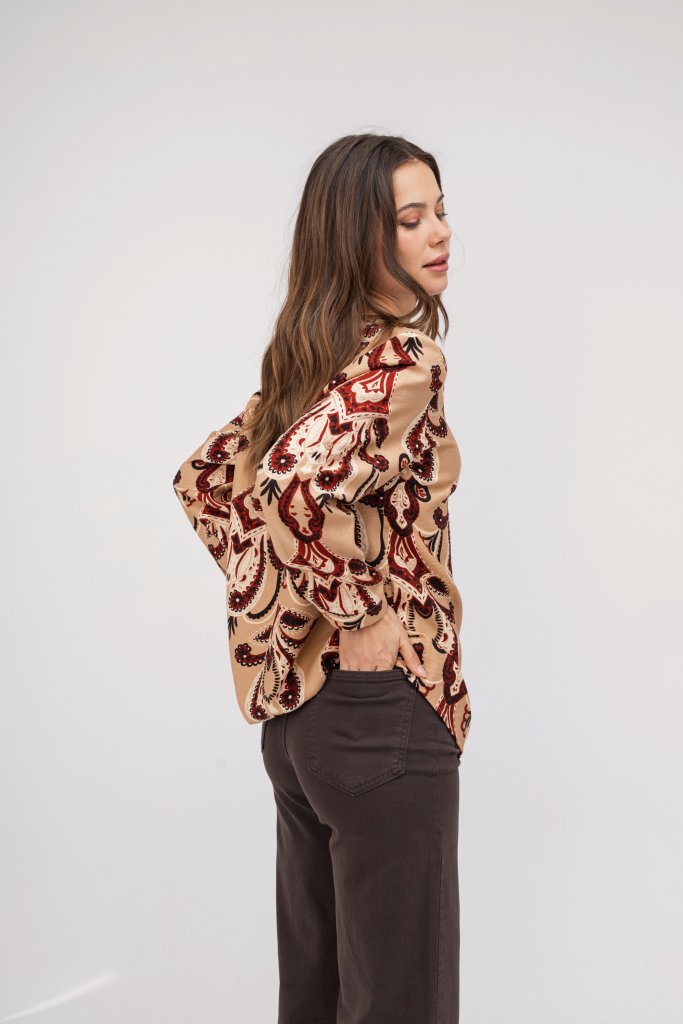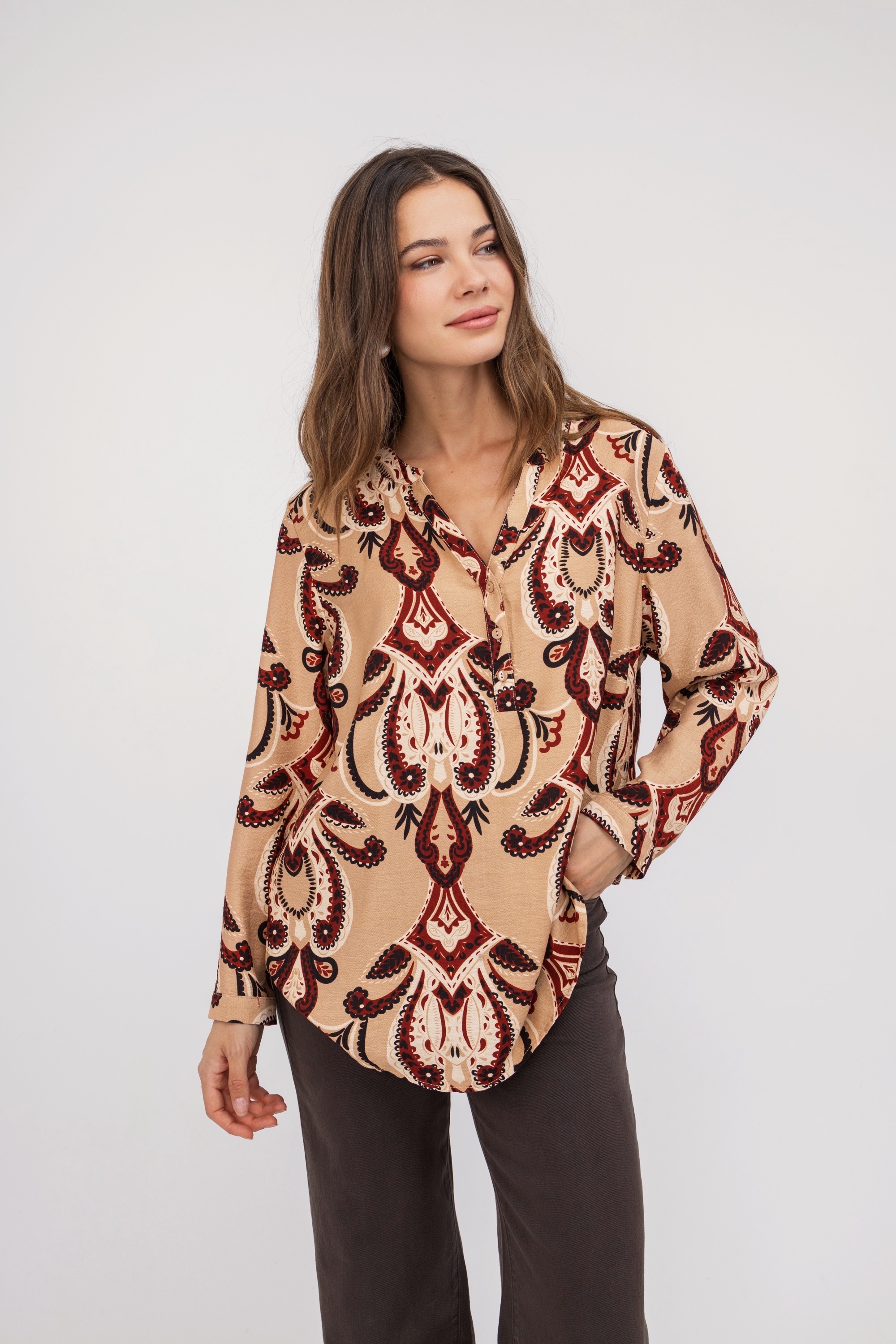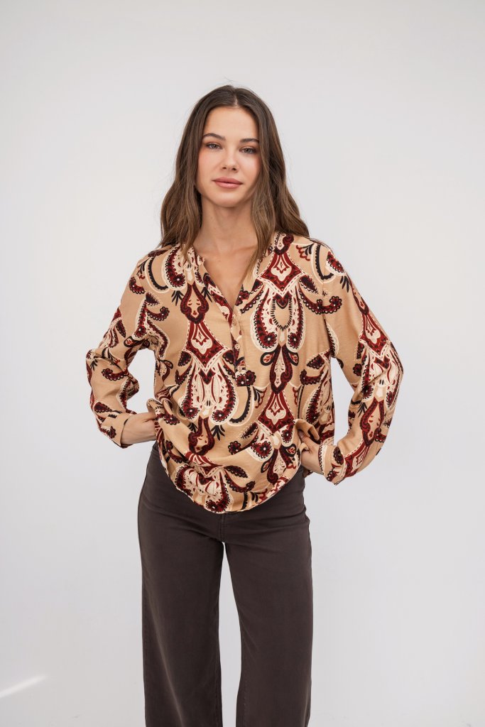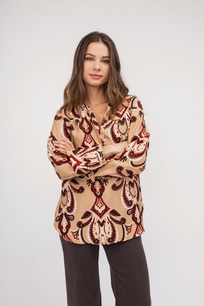 Γυναικείο πουκάμισο σε μπορντώ απόχρωση με μοντέρνο σχέδιο από λαχούρια. Κλείσιμο με μικρά κουμπιά . Μια chic επιλογή για να φορεθεί σε κάθε στιγμή της ημέρας.