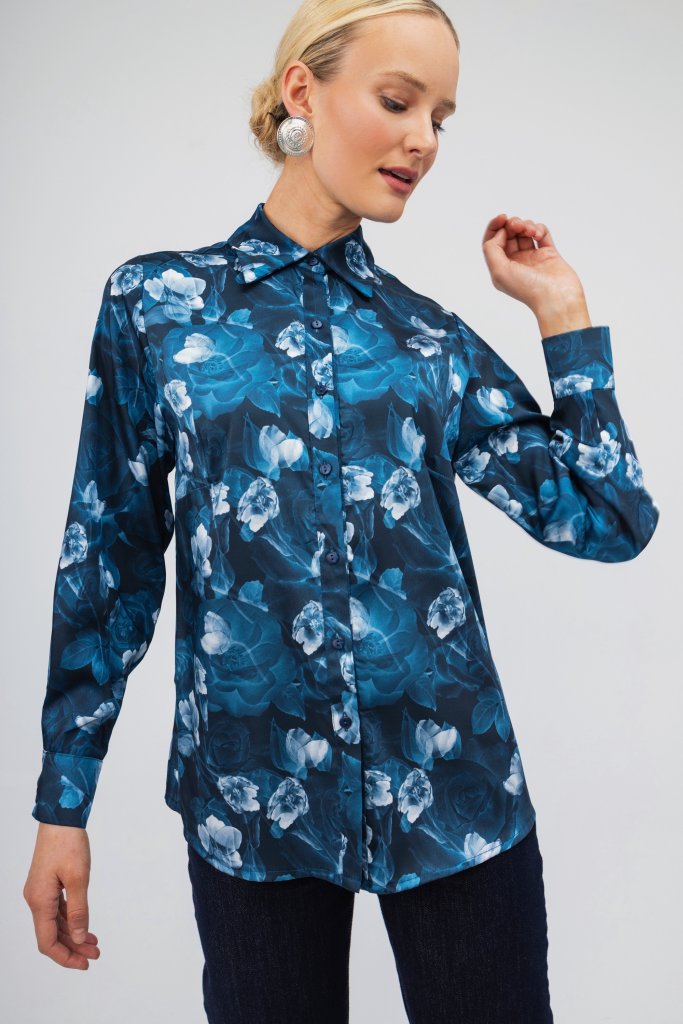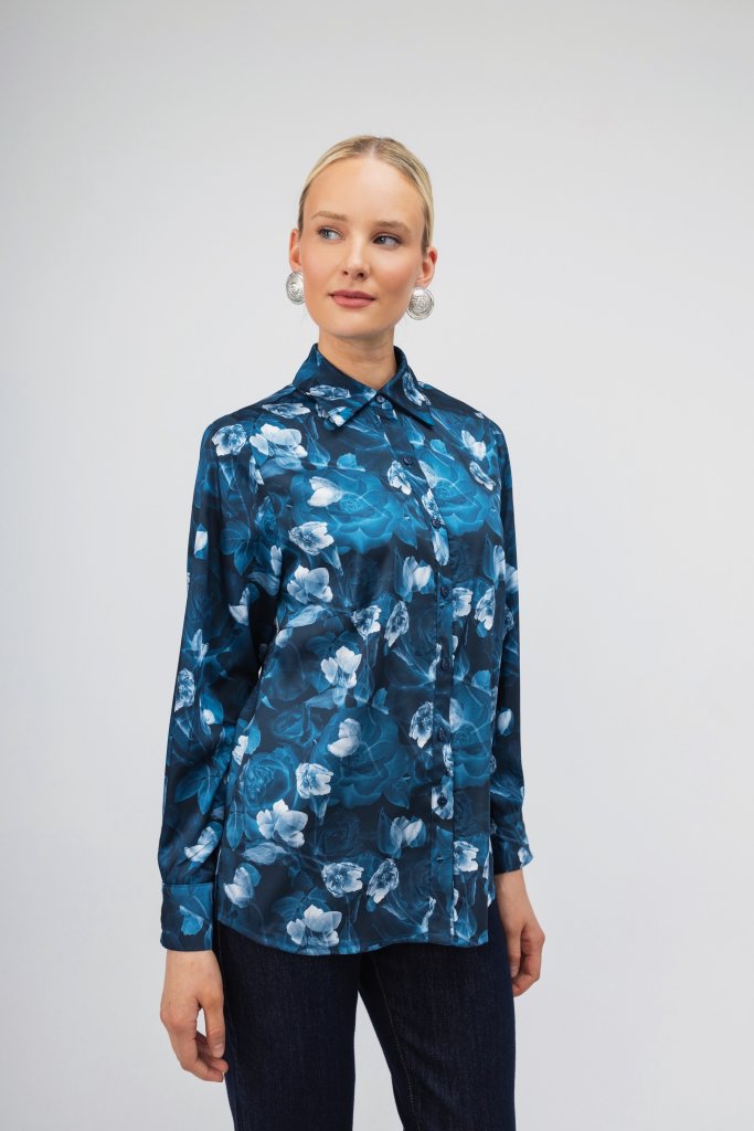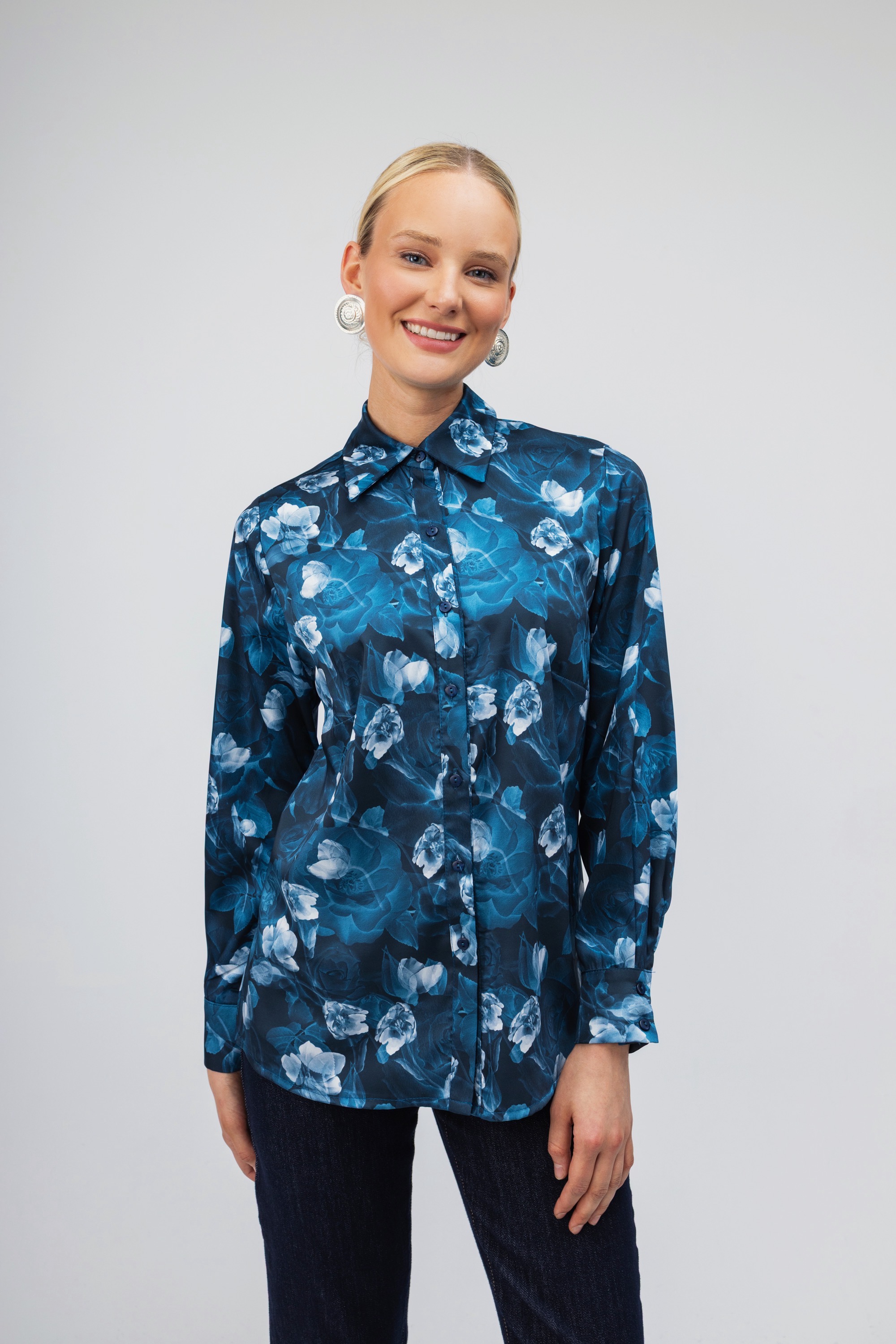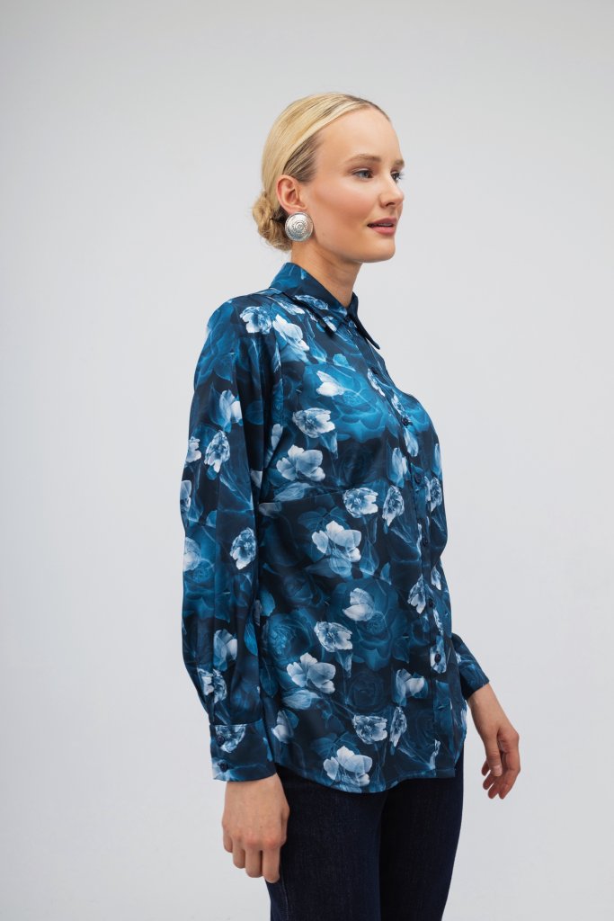 Πουκάμισο μπλε φλοράλ για εντυπωσιακές εμφανίσεις. Κλείσιμο με κουμπιά. Ένα γυναικείο σχέδιο που μπορεί να φορεθεί για το office look σας αλλά και για μια χαλαρή βόλτα με στυλ.