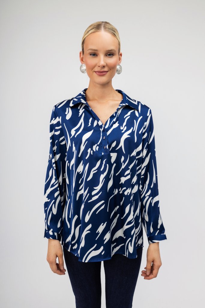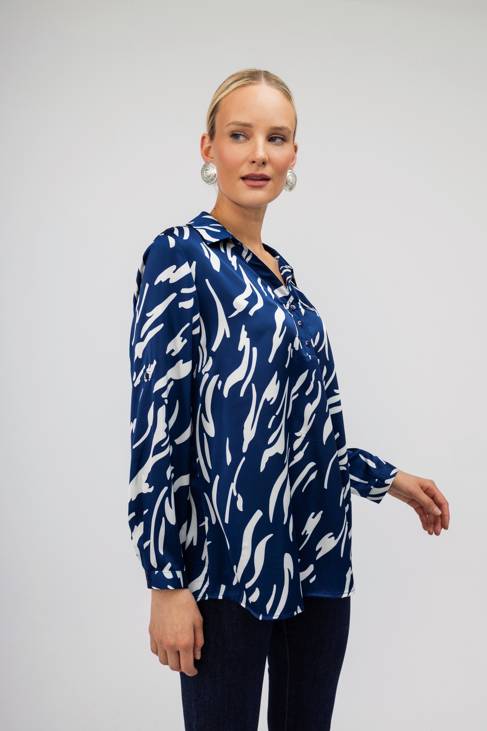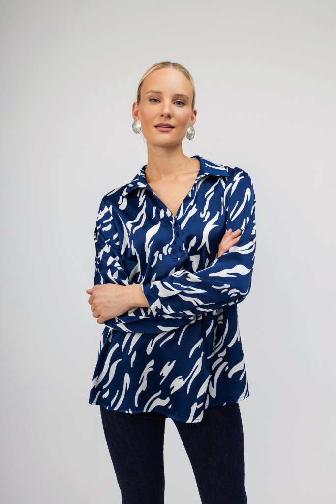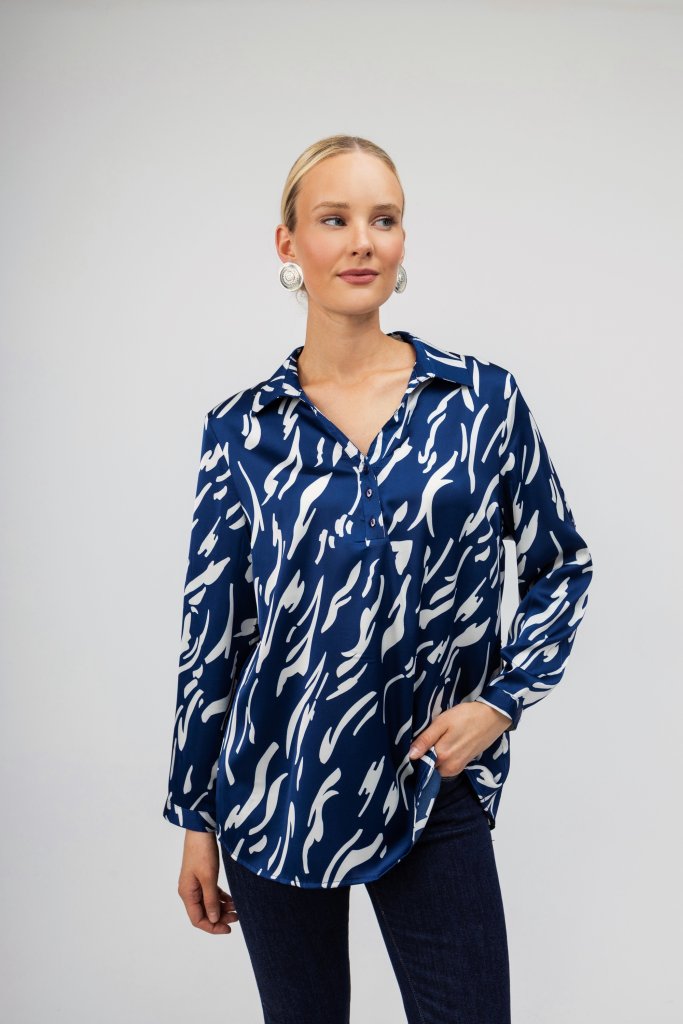 Γυναικείο Πουκάμισο μπλε με λευκά σχέδια στο μήκος του. Διαθέτει γιακά και κλείνει με κουμπιά. Μια μοντέρνα επιλογή που μπορεί να συνδυαστεί με ένα denim look αλλά και με ένα πιο επίσημομ ντύσιμο. To συγκεκριμένο σχέδιο έχει φαρδιά γραμμή.
