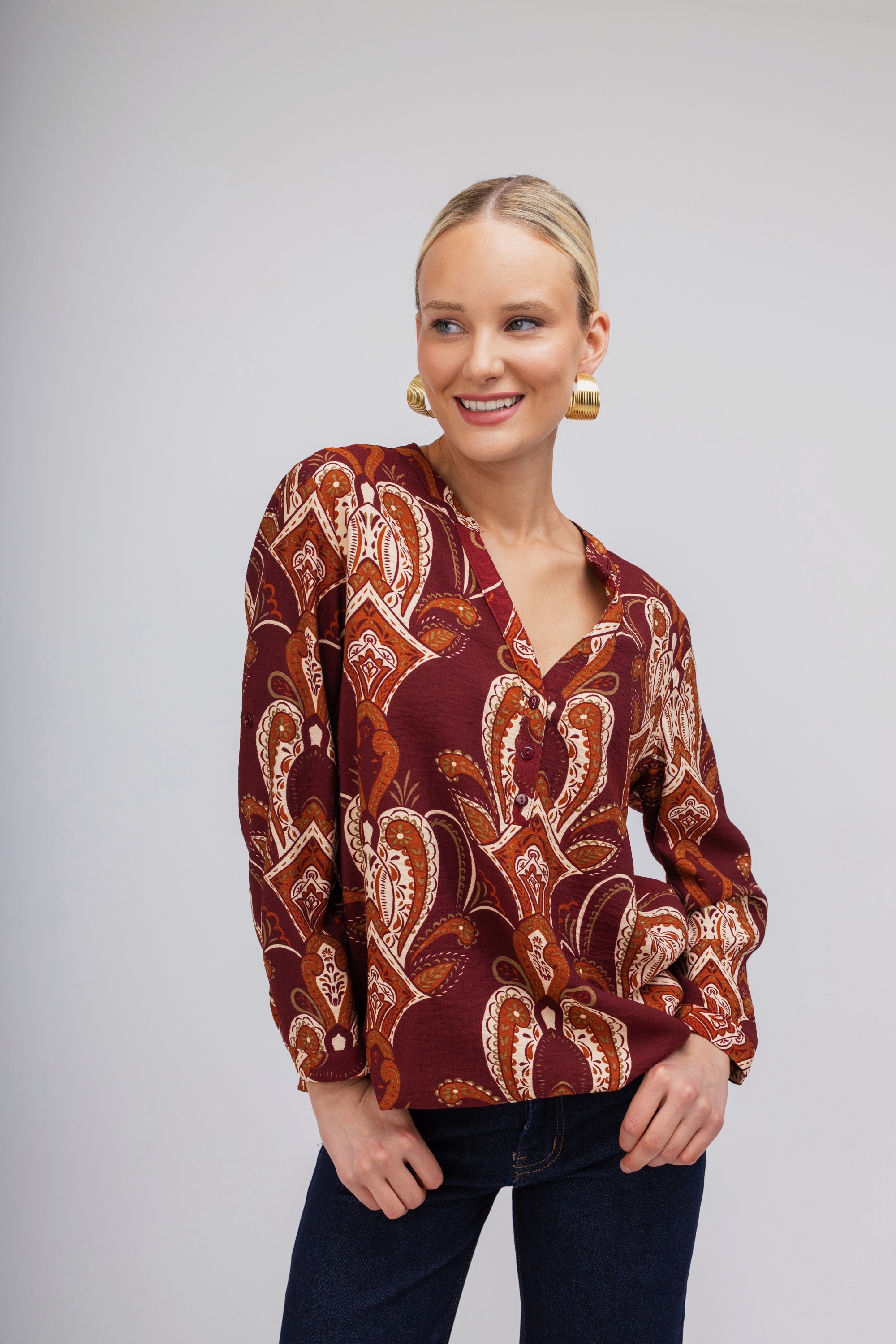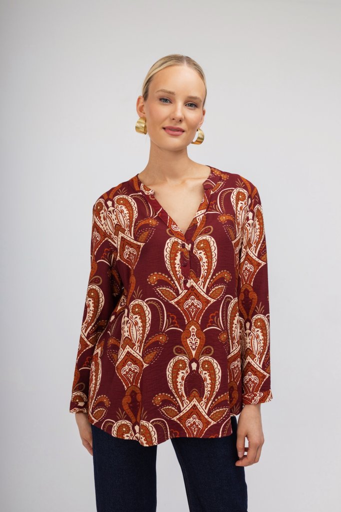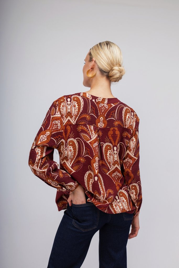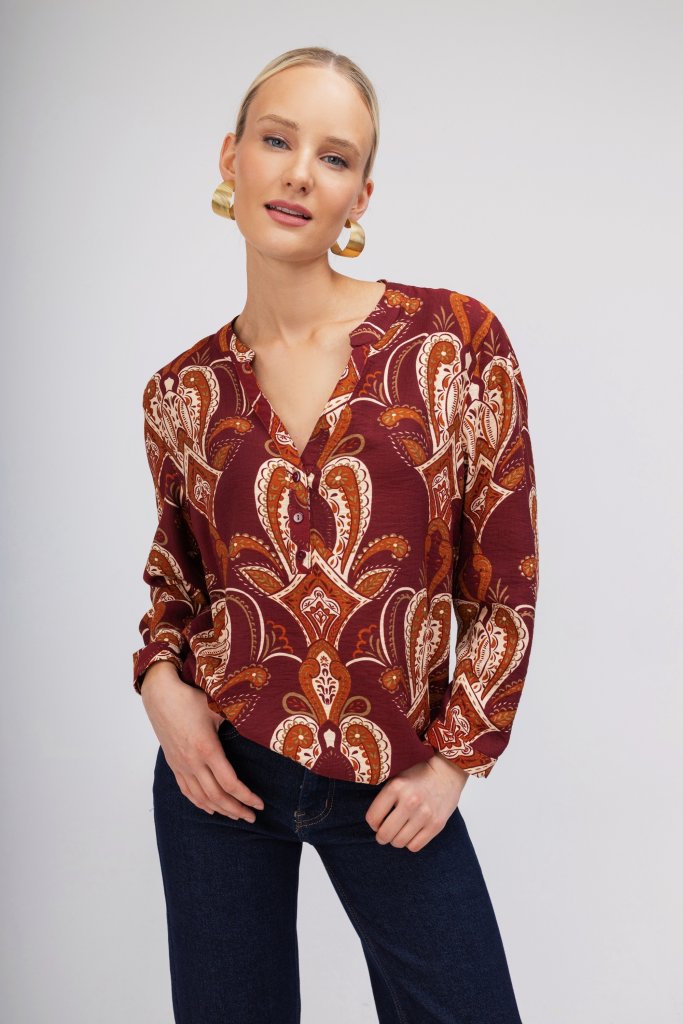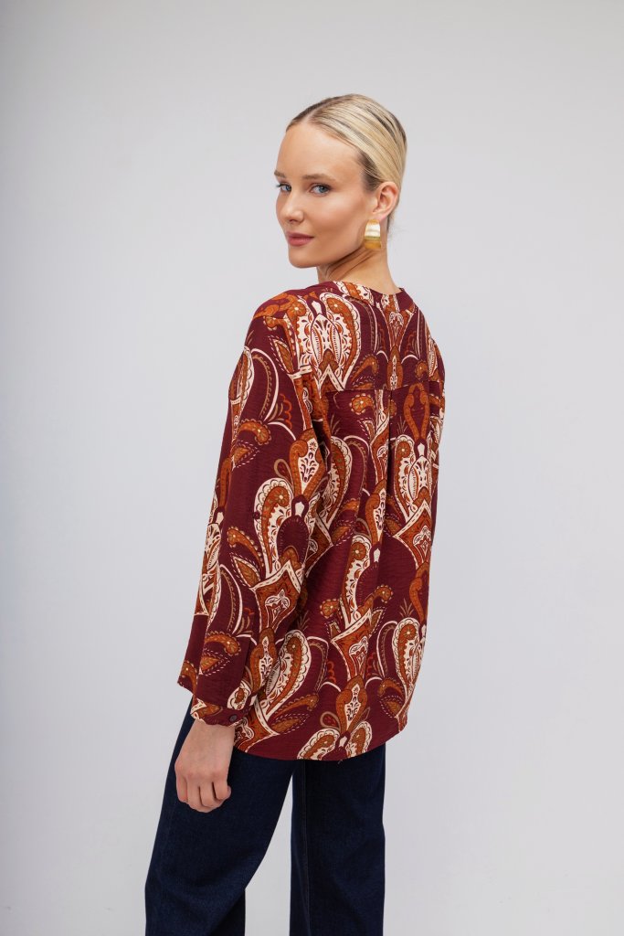 Γυναικείο πουκάμισο σε μπορντώ απόχρωση με μοντέρνο σχέδιο από λαχούρια. Κλείσιμο με μικρά κουμπιά . Μια chic επιλογή για να φορεθεί σε κάθε στιγμή της ημέρας.