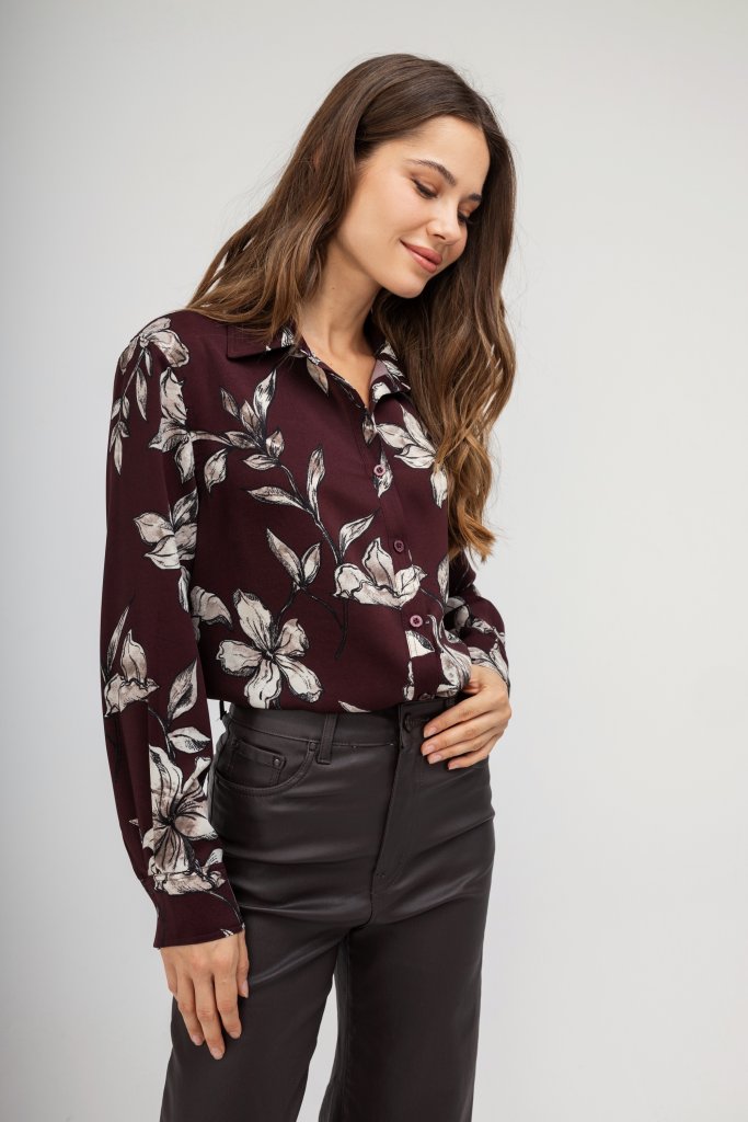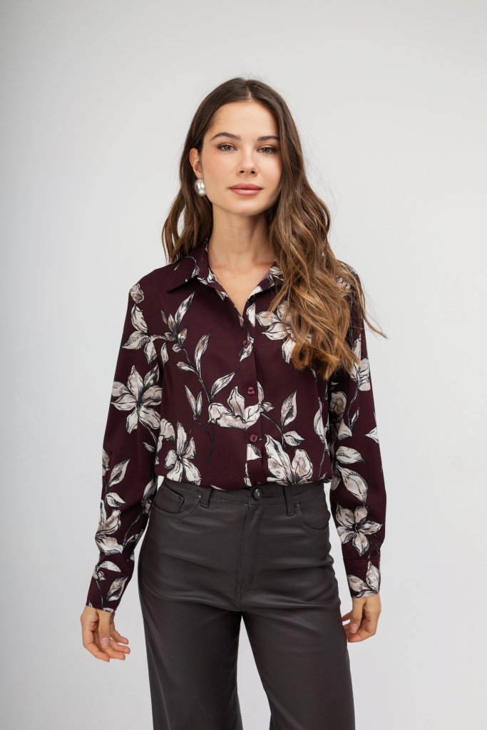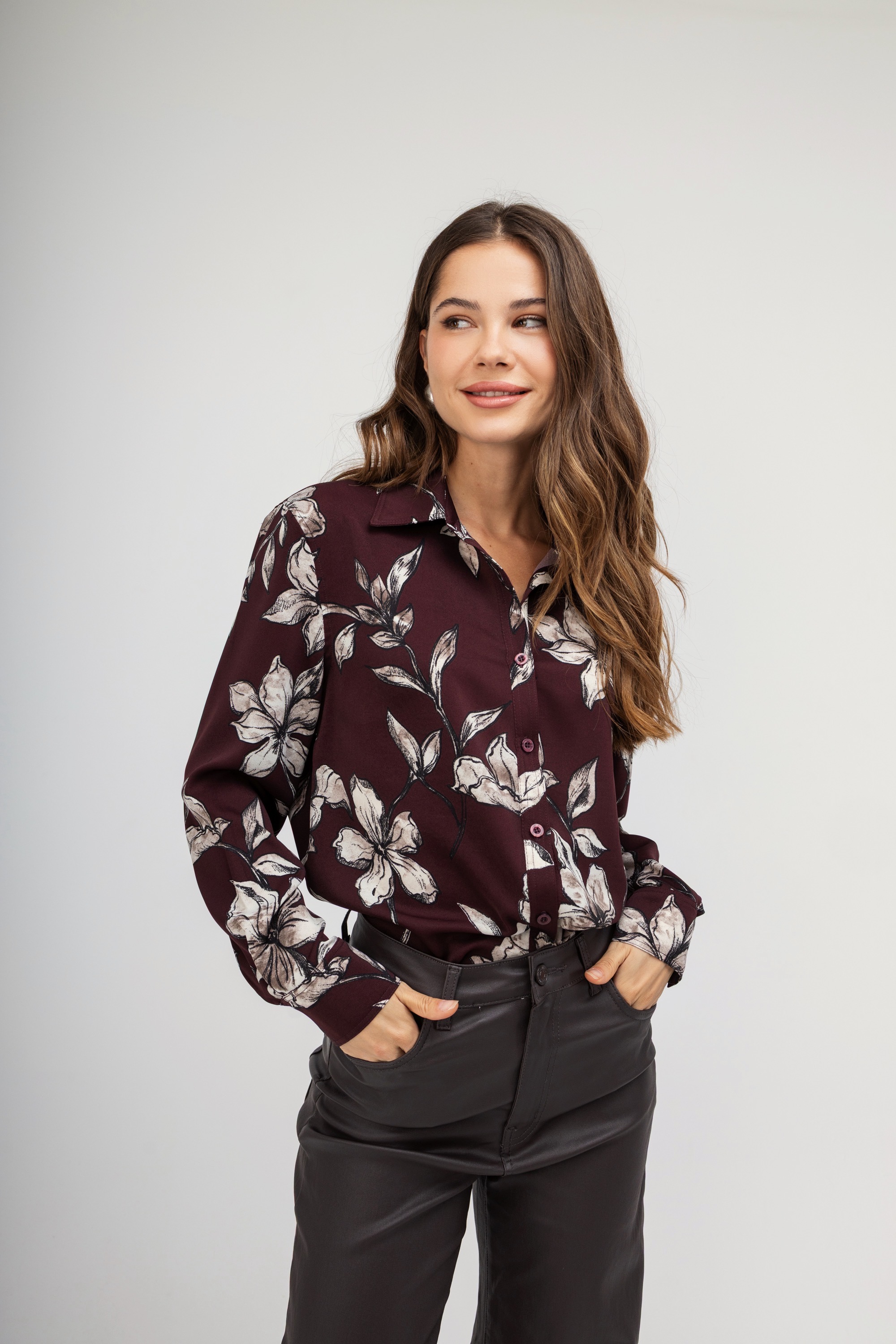 Άκρως εντυπωσιακό γυναικείο πουκάμισο σε μπορντώ χρώμα με μπεζ λουλούδια. Κλείσιμο με κουμπιά. Συνδυάστε το με ένα μονόχρωμο παντελόνι και δημιουργήστε το απόλυτο office look.