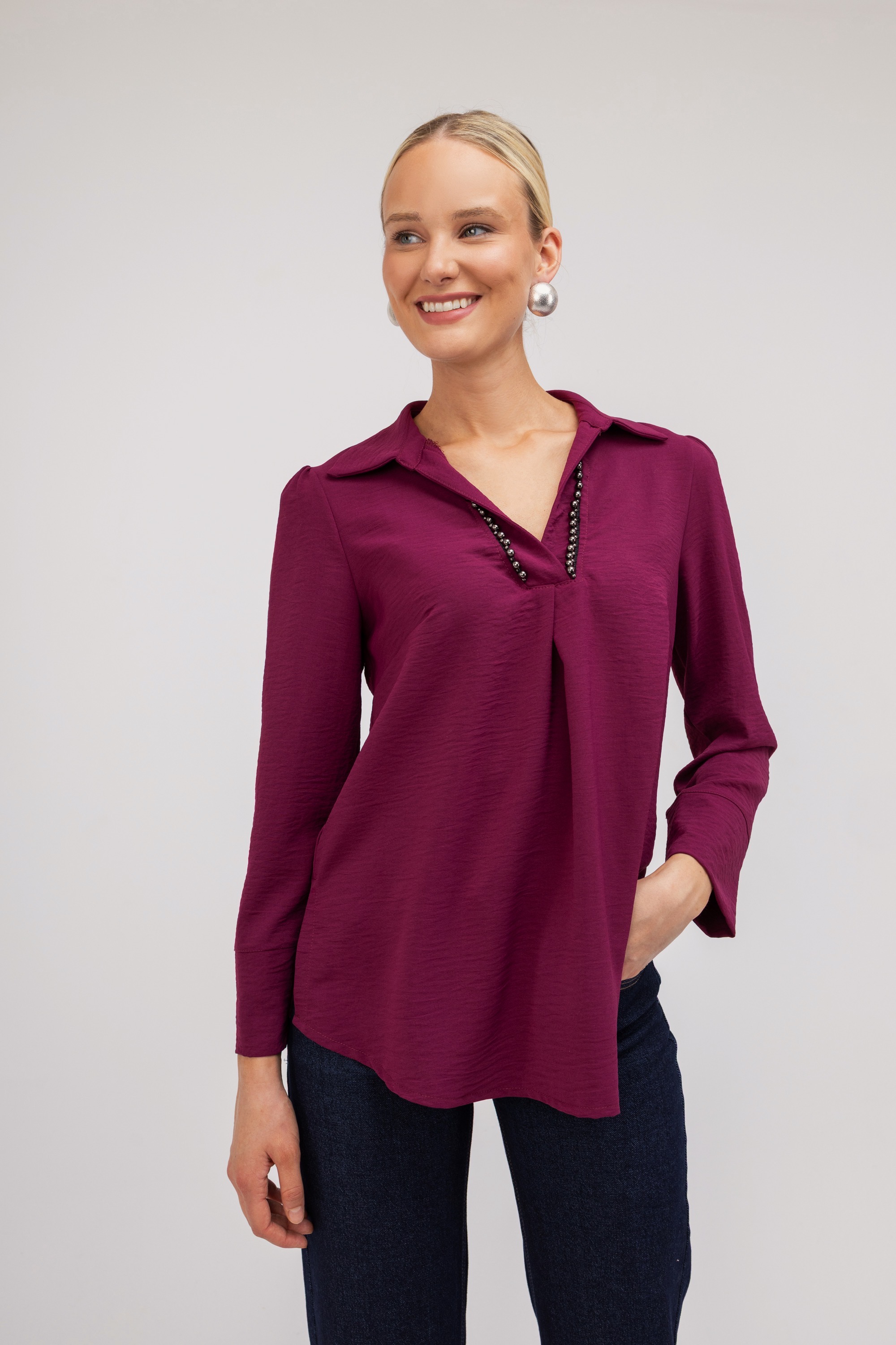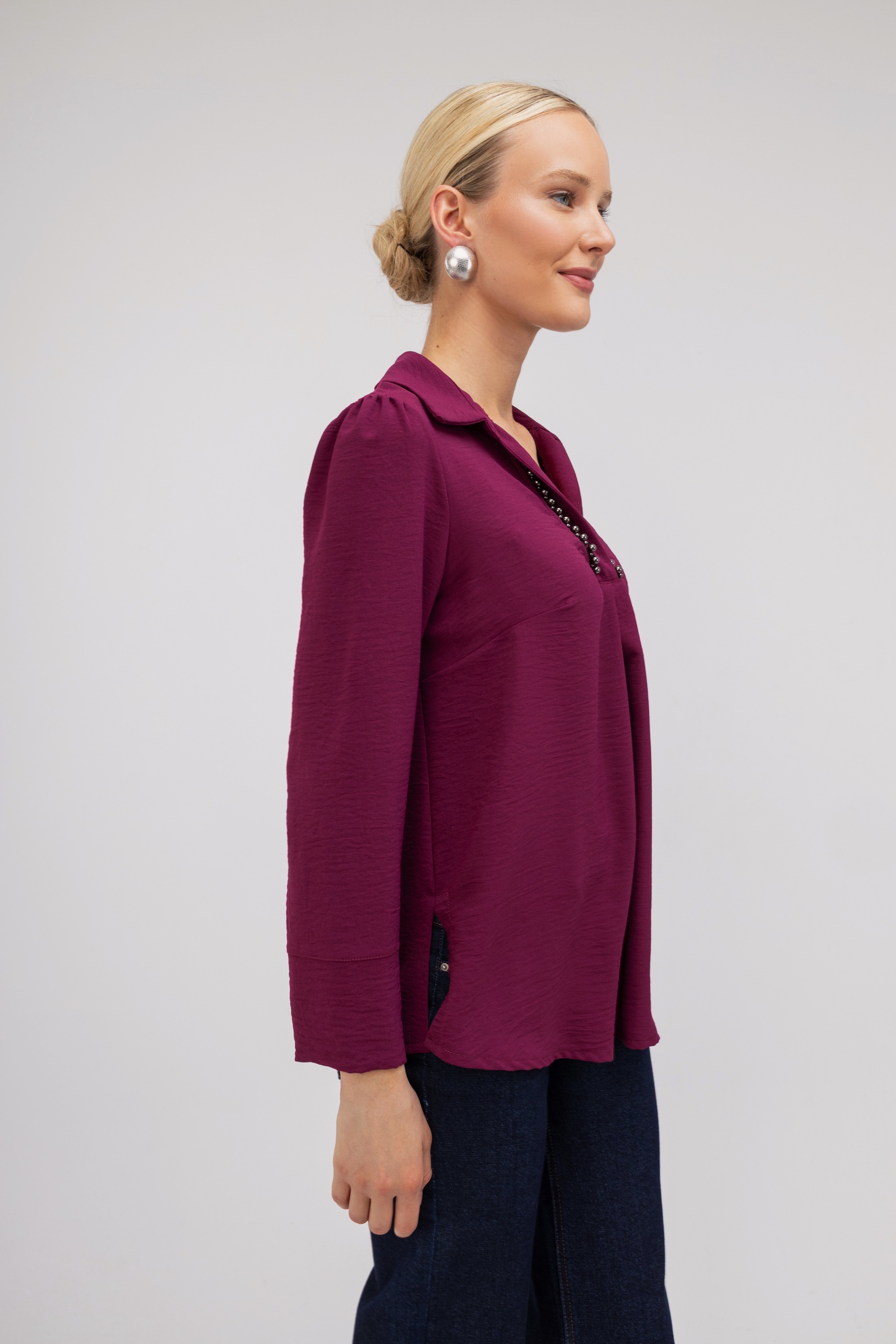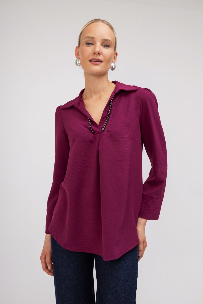 Γυναικείο πουκάμισο σε μπορντώ χρώμα διακοσμημένο με διακριτικές πέρλες. Διαθέτει ανοιχτή λαιμόκοψη και γιακά. Μια κομψή επιλογή που μπορεί να συνδυαστεί με πολλά σύνολα σε κάθε στιγμή της ημέρας.