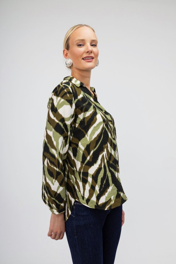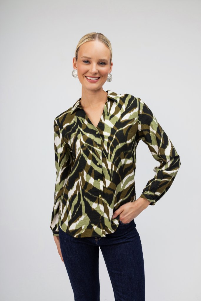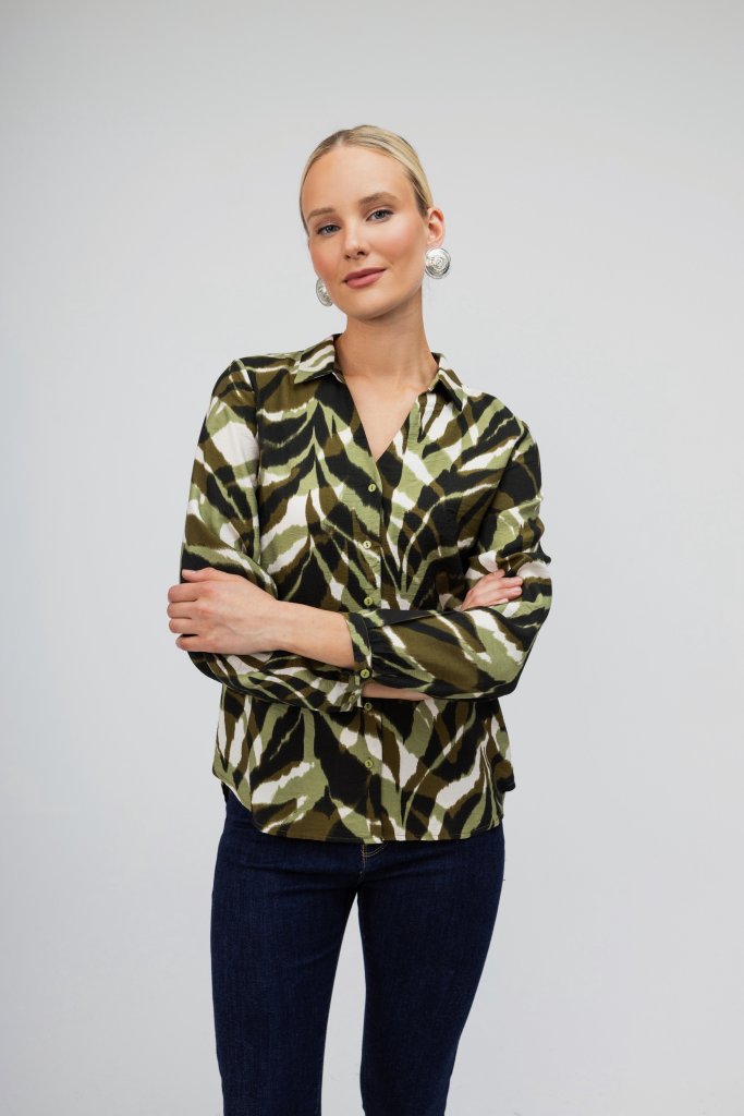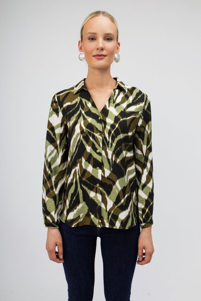 Γυναικείο πουκάμισο πράσινο εμπριμέ για ένα μοναδικό look με κομψό χαρακτήρα. Κλείσιμο με κουμπάκια. Συνδυάστε το με ένα μαύρο κουστούμι και δημιουργήστε το καλύτερο outfit.