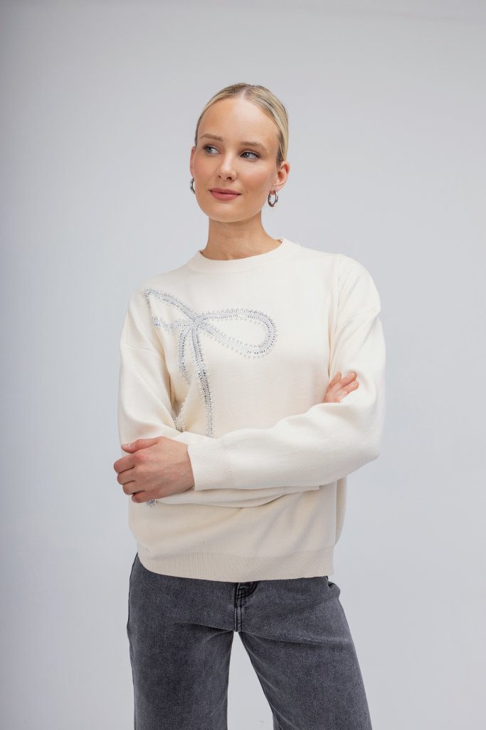 Γυναικείο εκρού πουλόβερ με εντυπωσιακό μεγάλο φιόγκο σχεδιασμένο από στρας και λευκές πέρλες. Διαθέτει κλειστή λαιμόκοψη και είναι ιδανικό να συνδυαστεί από το πρωί μέχρι το απόγευμα.