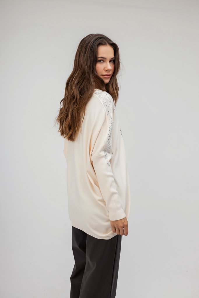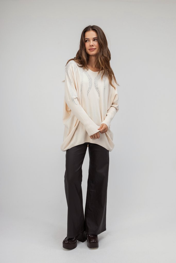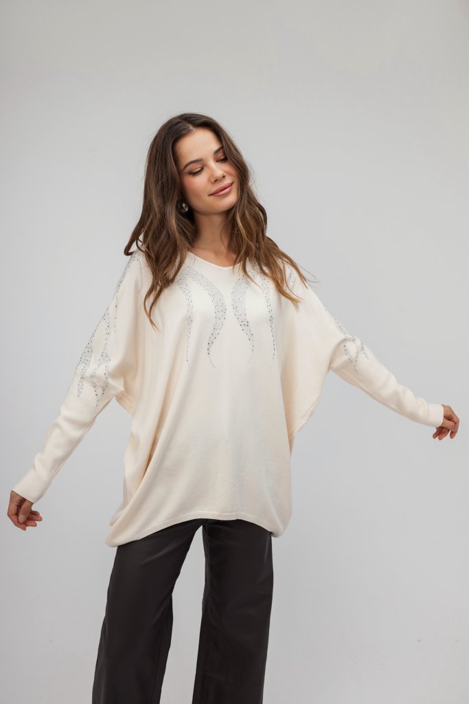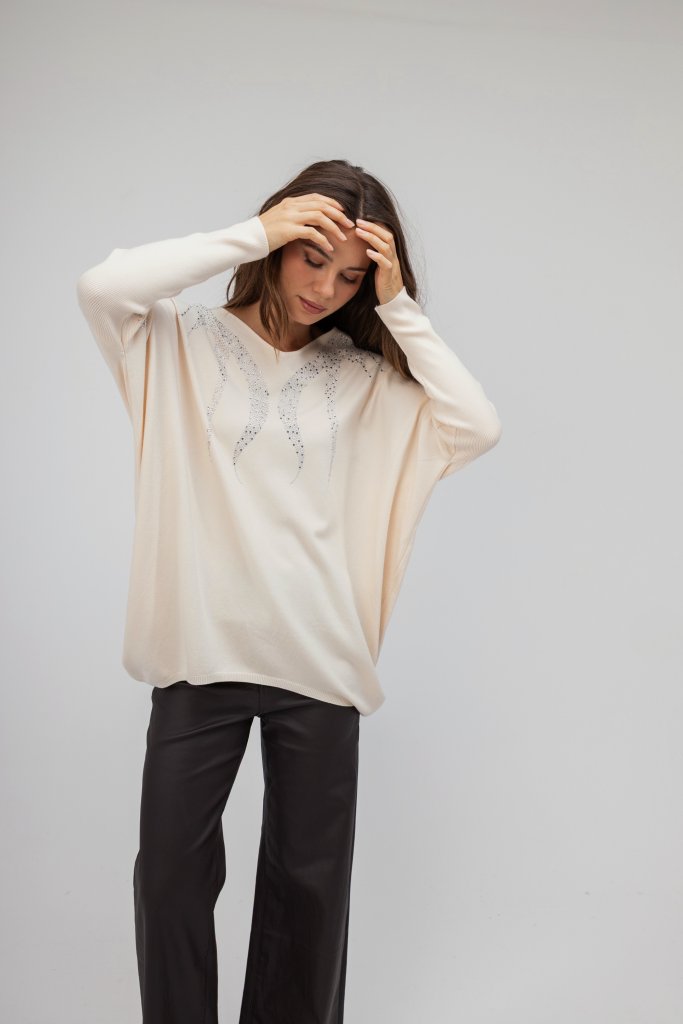 Άνετο πουλόβερ σε χρώμα εκρού, με μικρή V λαιμόκοψη και λεπτομέρειες από στρας. Μια χειμερινή δημιουργία που μπορεί να φορεθεί σε κάθε στιγμή της ημέρας.