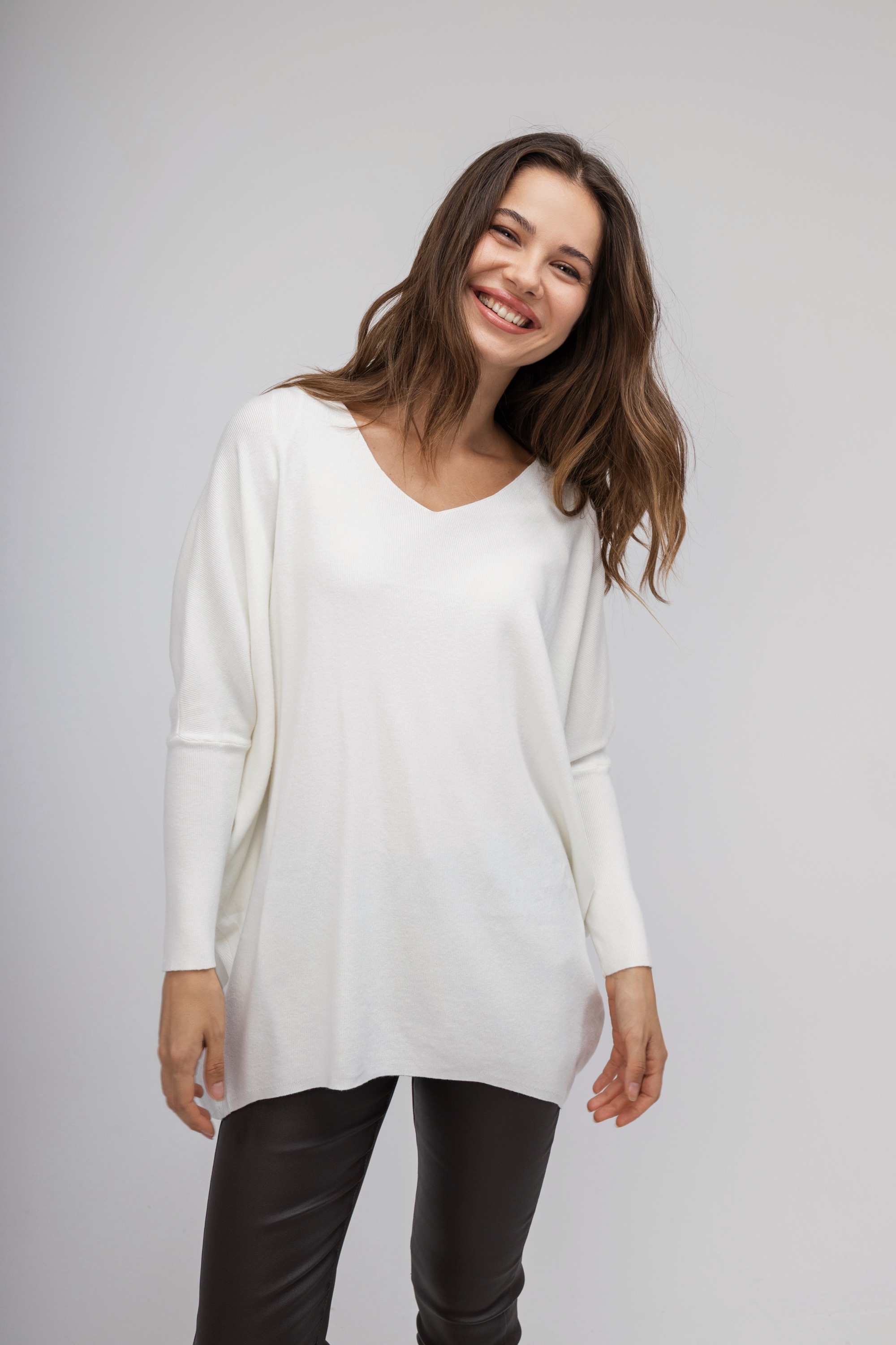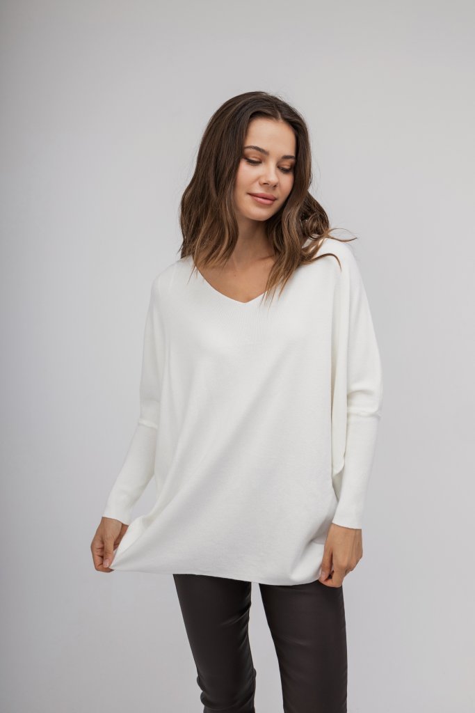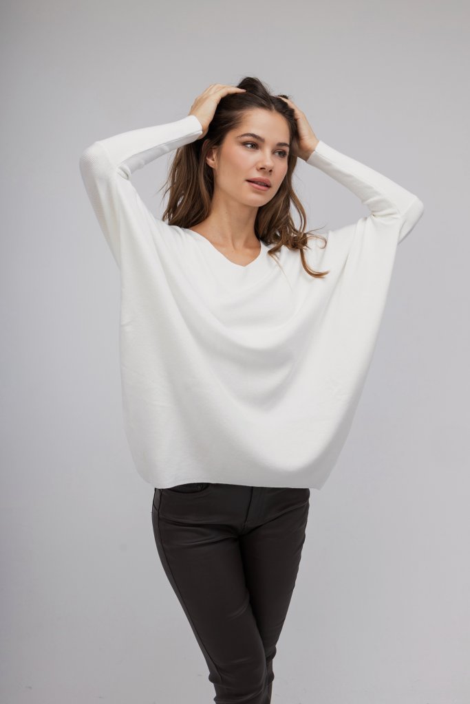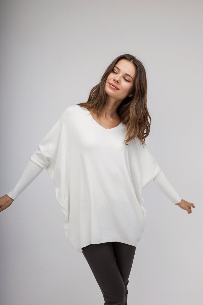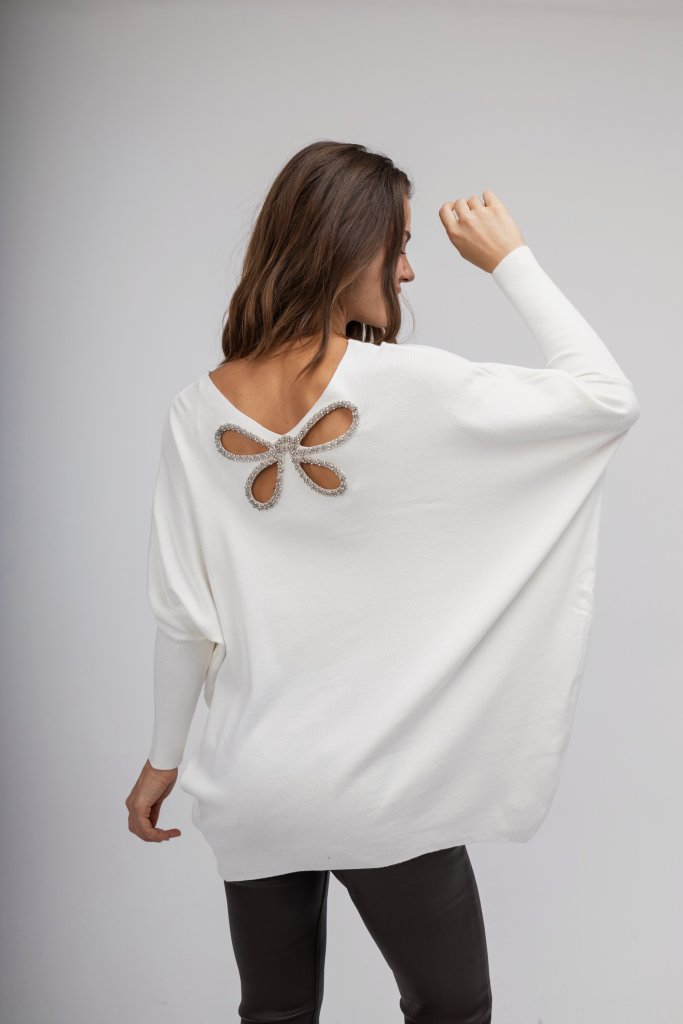 Γυναικείο πουλόβερ εκρού σε άνετη γραμμή διακοσμημένο με strass σε σχέδιο πεταλούδας στο πίσω μέρος. Μοντέρνος σχεδιασμός που θα ανανεώσει τα καθημερινά σας outfit.