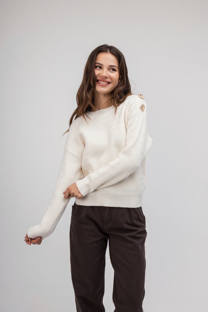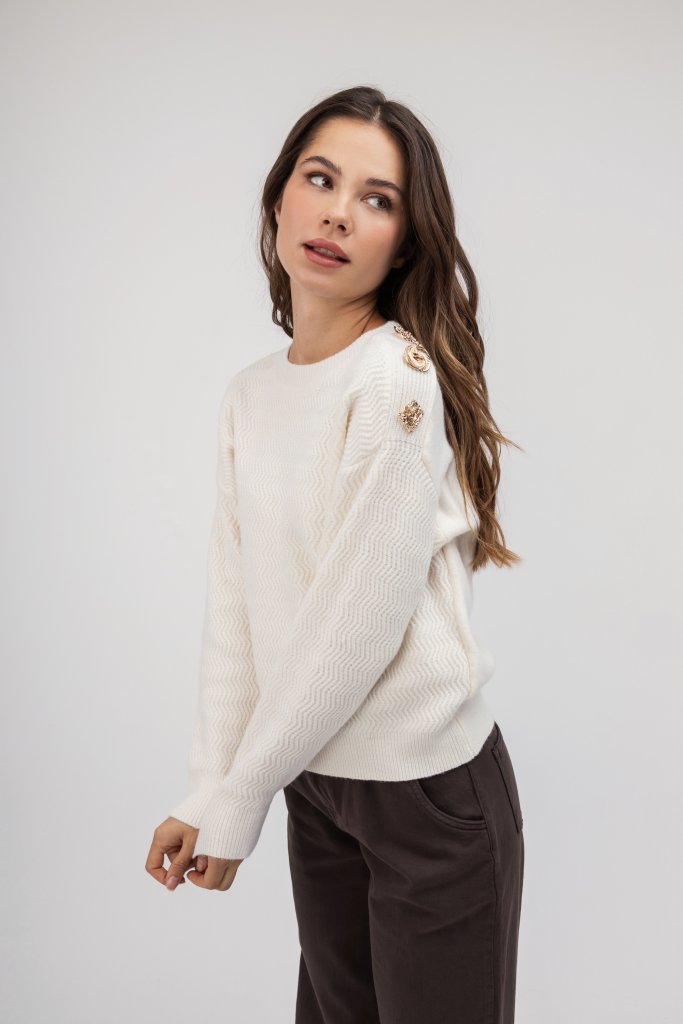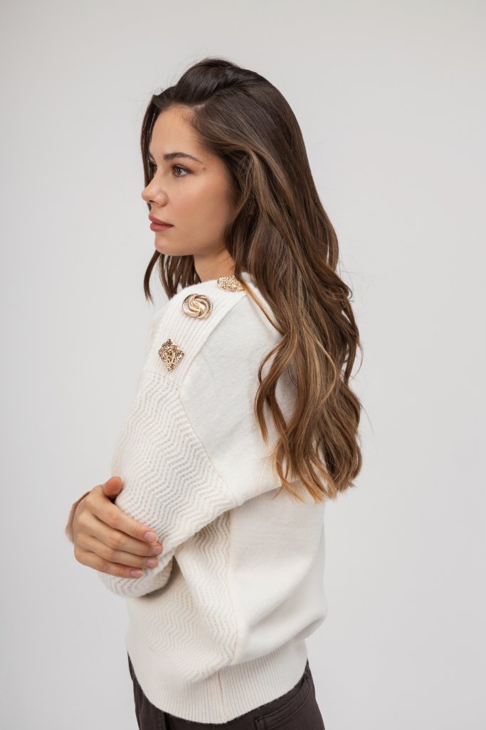 Γυναικείο Πουλόβερ εκρού με χρυσά διακοσμητικά κοχύλια στον ώμο. Διαθέτει κομψό σχεδιασμό και πολύ απαλό ύφασμα. Μια χειμερινή δημιουργία που μπορεί να φορεθεί σε κάθε στιγμή της ημέρας και να σας χαρίσει στυλ και στο πιο απλό look.