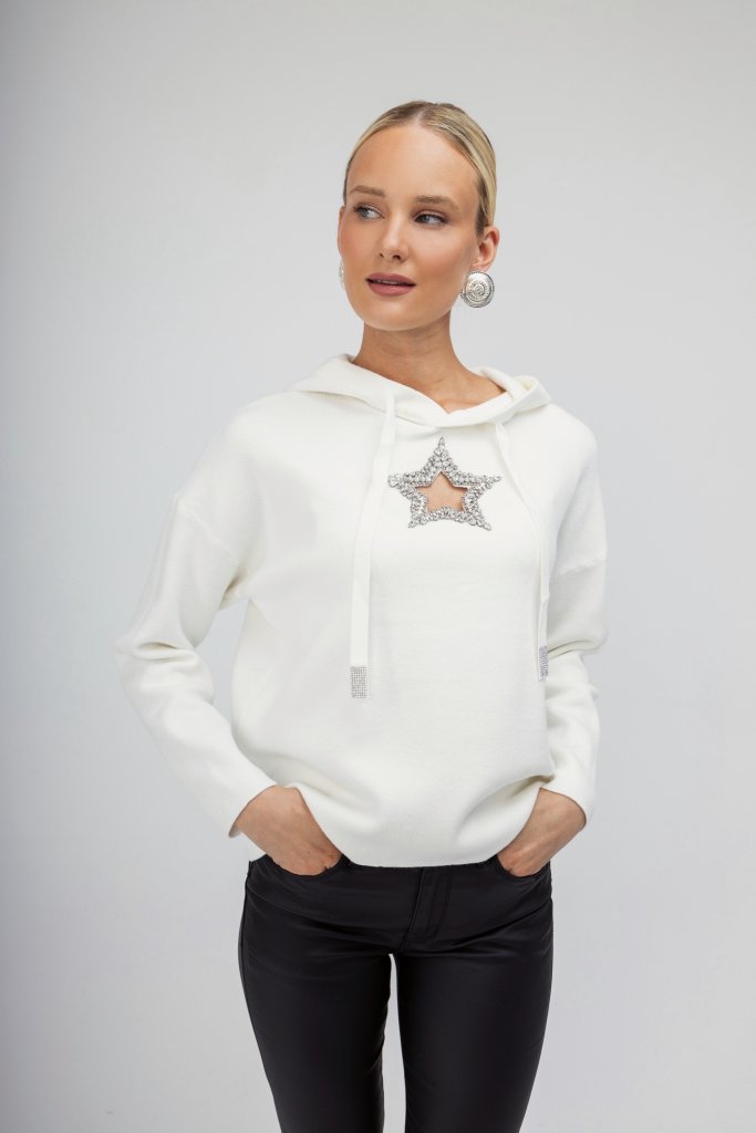 Γυναικείο Πουλόβερ - Φούτερ λευκό με αστέρι διακοσμημένο από ασημί rhinestones και κουκούλα. Ένα μοντέρνο σχέδιο που δεν περνά απαρατήρητο σε κάθε σας look. Συνδυάστε το με τζιν ή φόρμα και χαρίστε στον εαυτό σας ένα μοναδικό casual look.