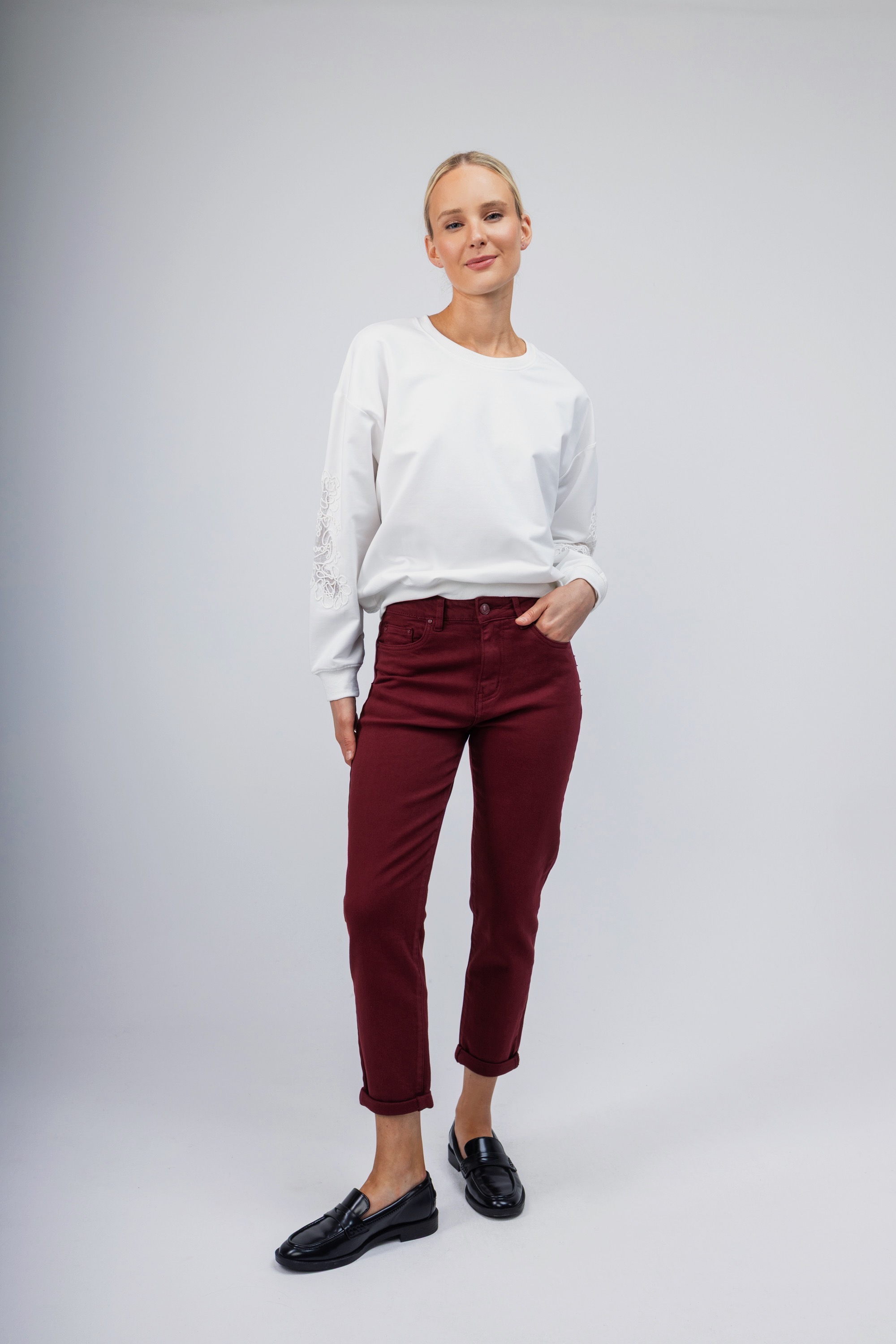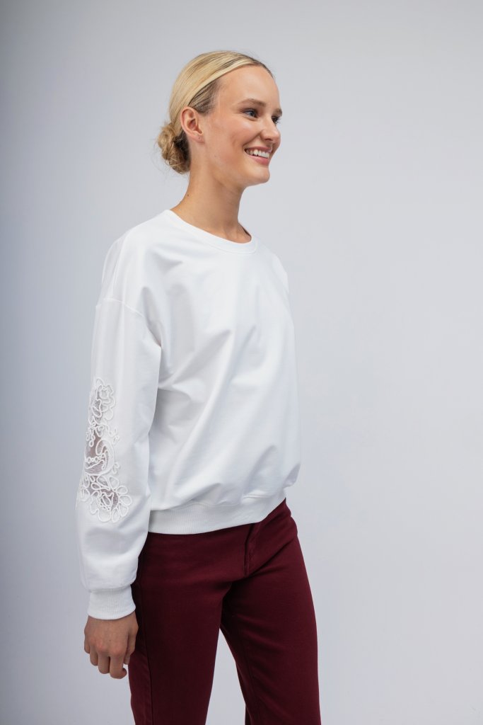 Γυναικείο πουλόβερ- φούτερ λευκό με κεντητό σχέδιο από λουλούδια στα μανίκια. Διαθέτει κλειστή λαιμόκοψη. Συνδυάστε το με ένα τζιν ή ένα απλό υφασμάτινο παντελόνι και αναβαθμίστε το casual στυλ σας.