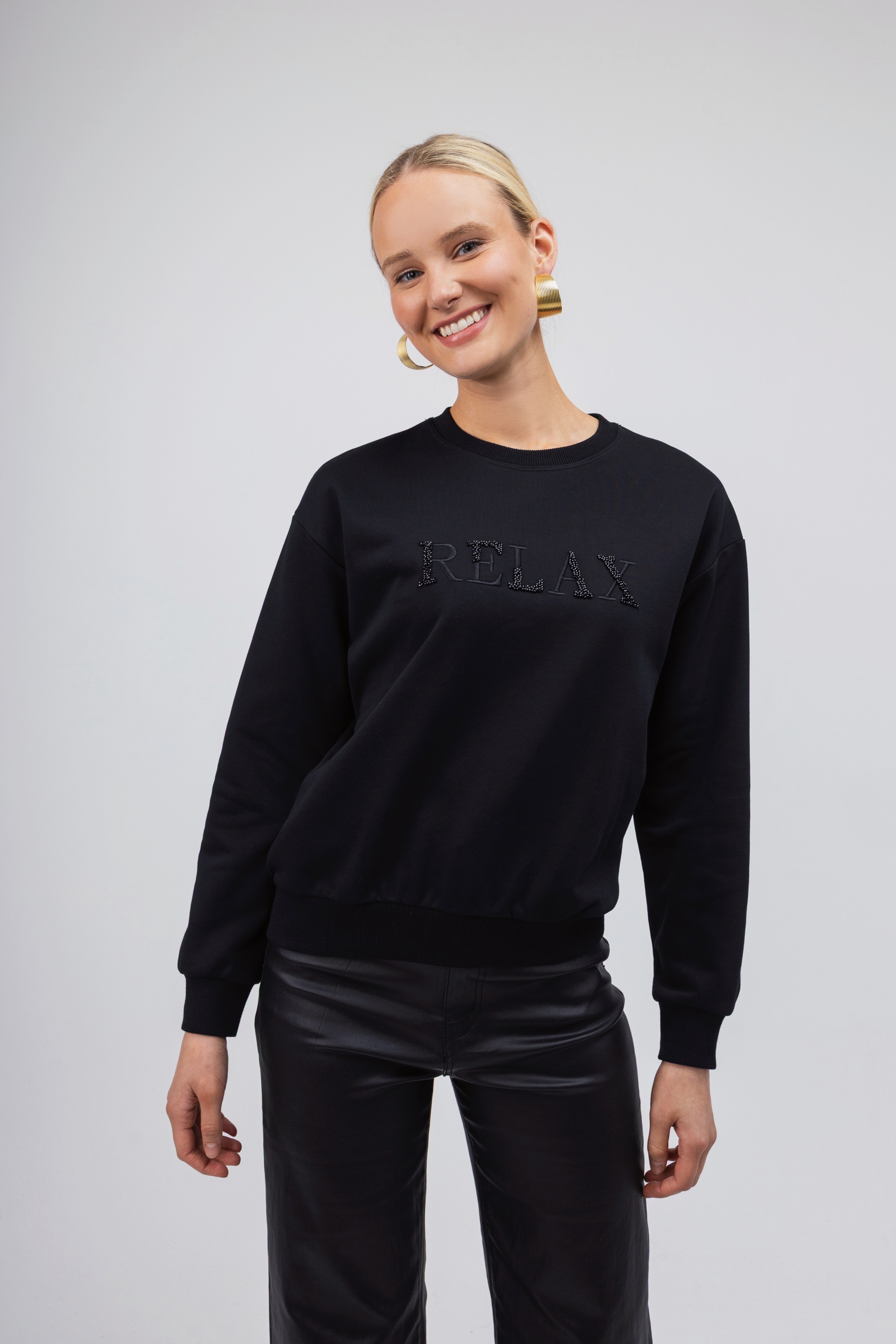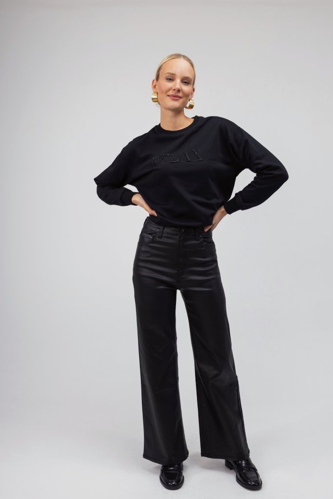 Γυναικείο πουλόβερ- φούτερ μαύρο με το λεκτικό Relax. Διαθέτει κλειστή λαιμόκοψη. Μια basic επιλογή που θα ολοκληρώσει με τον καλύτερο τρόπο το casual look σας.