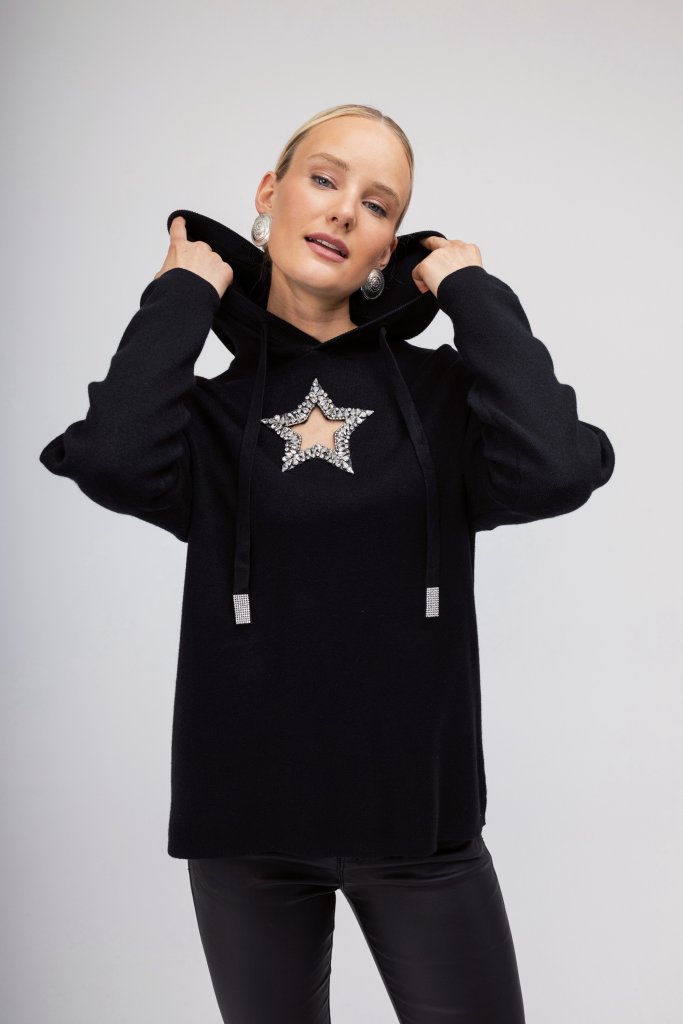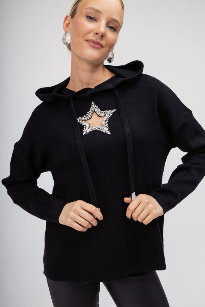 Γυναικείο Πουλόβερ - Φούτερ μαύρο με αστέρι διακοσμημένο από ασημί rhinestones και κουκούλα. Ένα μοντέρνο σχέδιο που δεν περνά απαρατήρητο σε κάθε σας look. Συνδυάστε το με τζιν ή φόρμα και χαρίστε στον εαυτό σας ένα μοναδικό casual look.