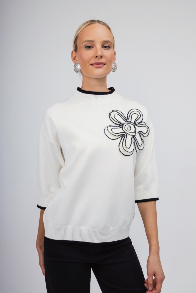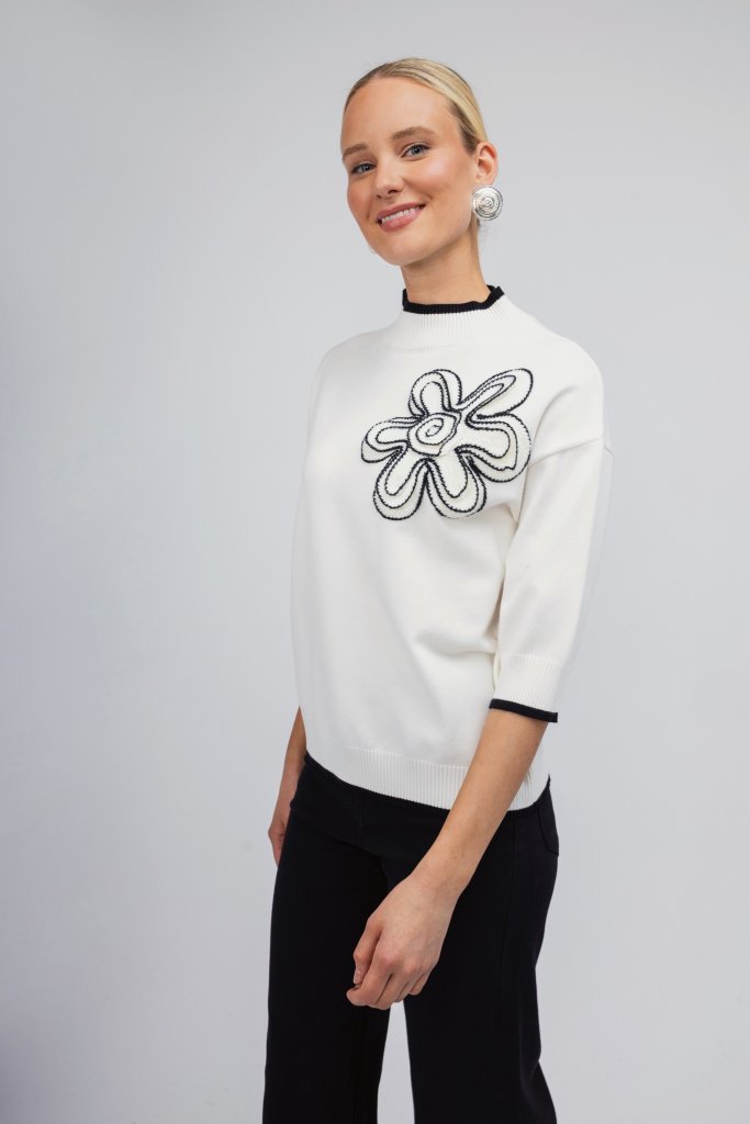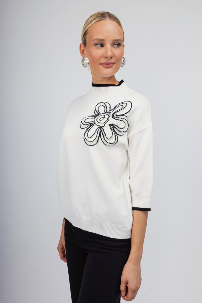 Γυναικείο πουλόβερ λευκό με σχέδιο κεντητό λουλούδι. Διαθέτει κοντά μανίκια και μαύρες διακριτικές λεπτομέρείες. Μια κομψή δημιουργία που θα αναβαθμίσειτο χειμερινό σας outfit.