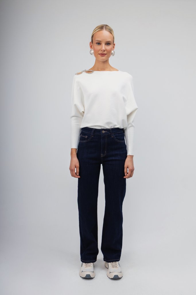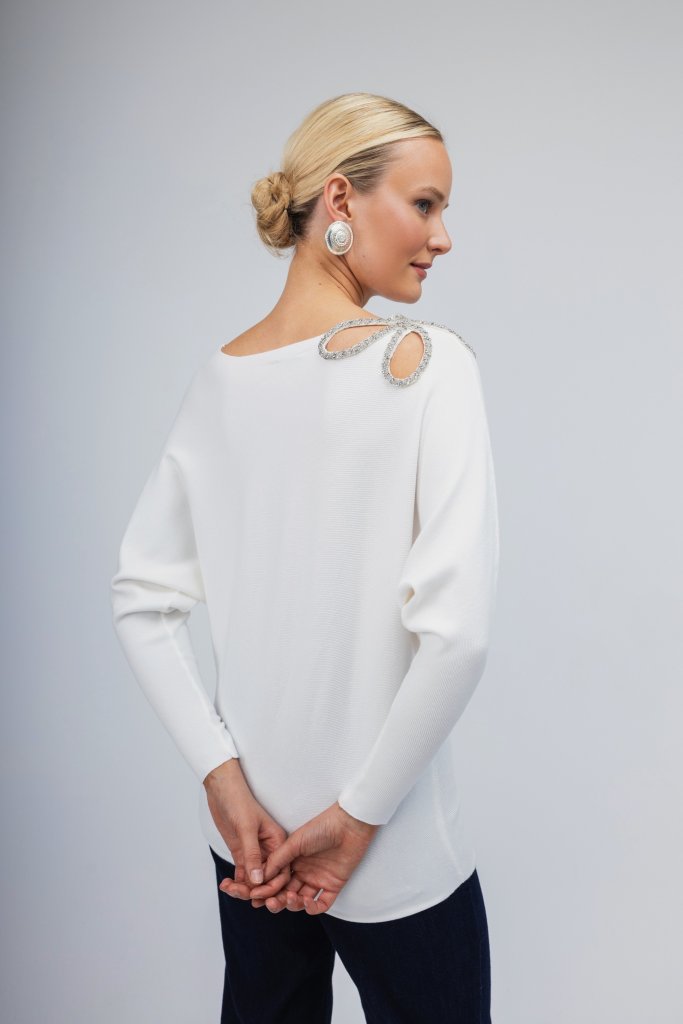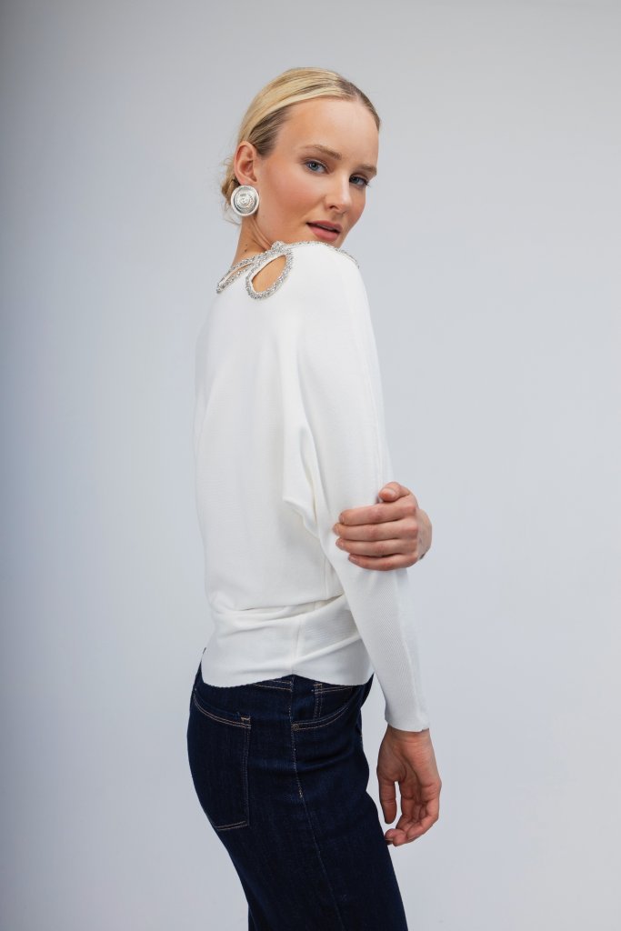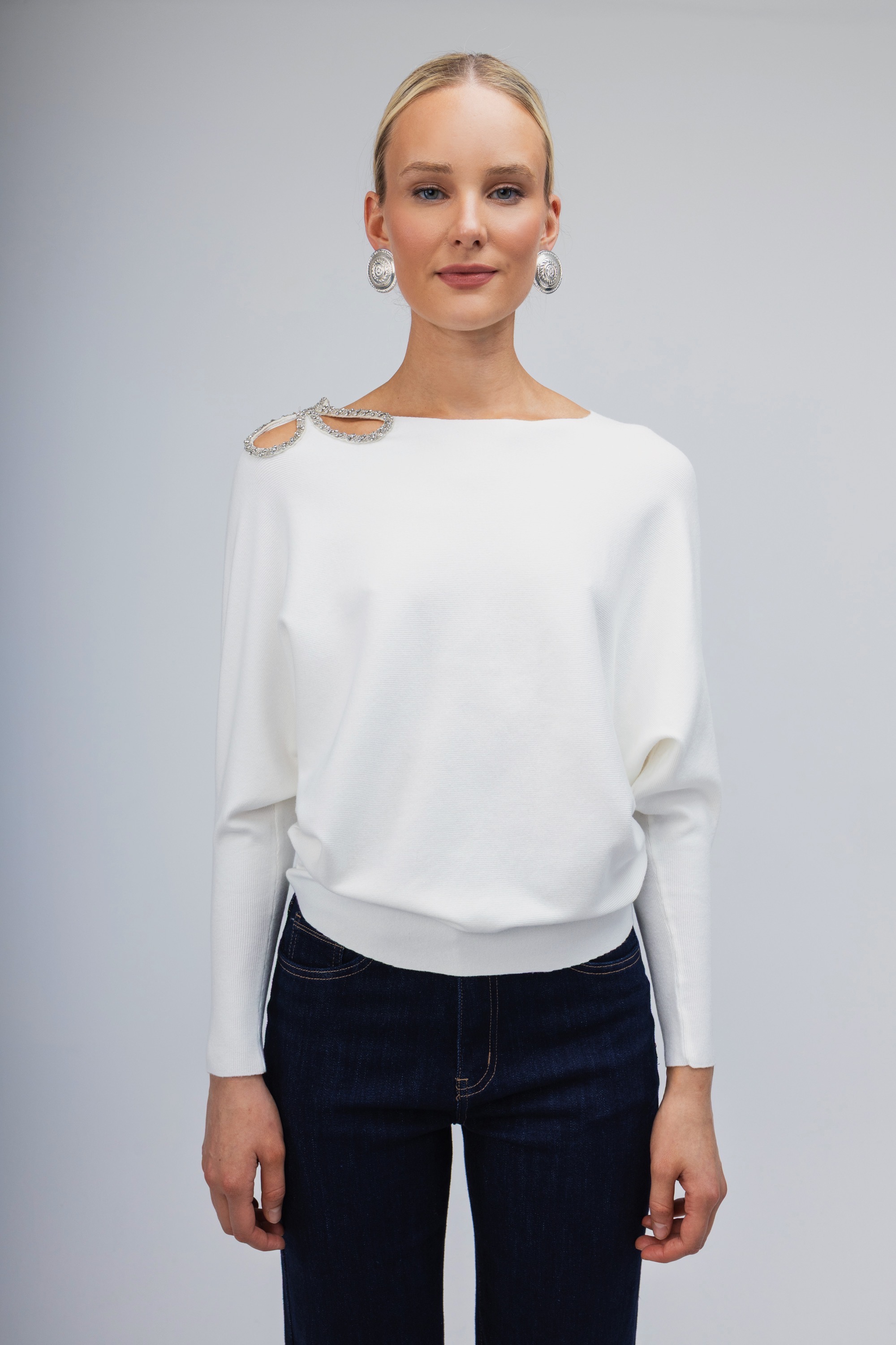 Γυναικείο πουλόβερ λευκό με σχέδιο από strass στον ώμο. Ένα μοντέρνο σχέδιο που μπορεί να αναβαθμίσει το καθημερινό σας outfit.