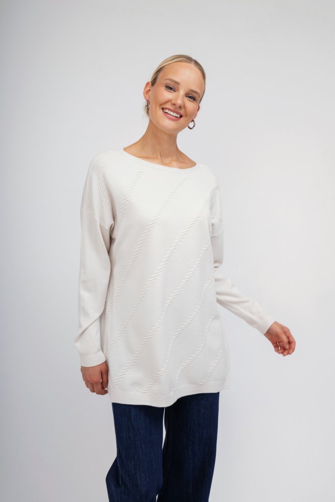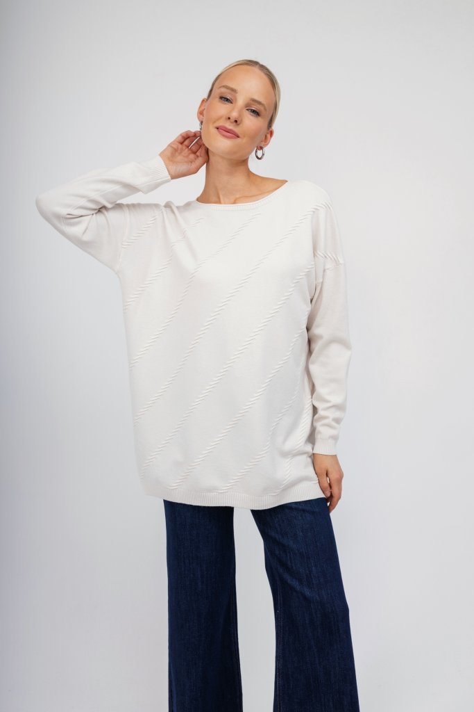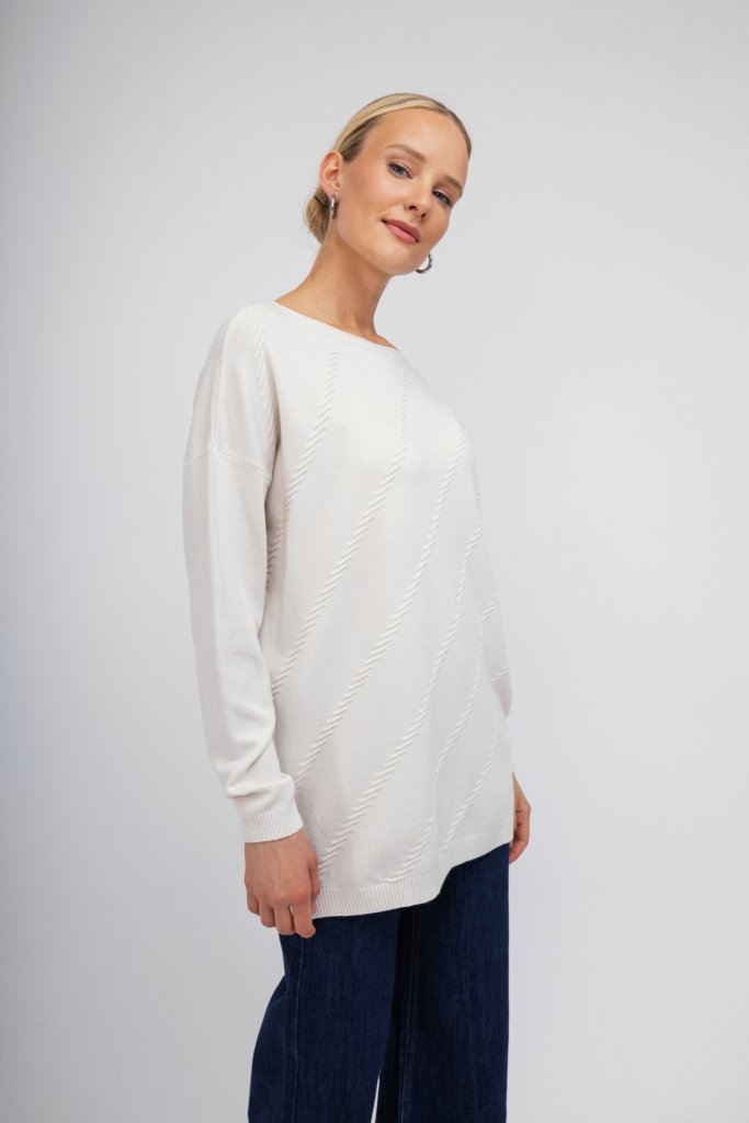 Γυναικείο Πουλόβερ λευκό με διακριτικό σχέδιο στο μήκος του. Διαθέτει άνετη εφαρμογή και έχει σχεδιαστεί από απαλό υλικό άριστης ποιότητας. Μια μονόχρωμη επιλογή που θα γίνει το αγαπημένο σας κομμάτι για τις καθημερινές σας εμφανίσεις.