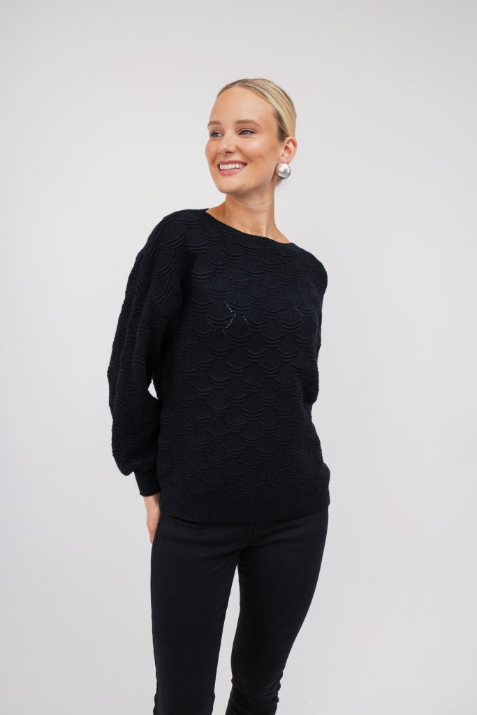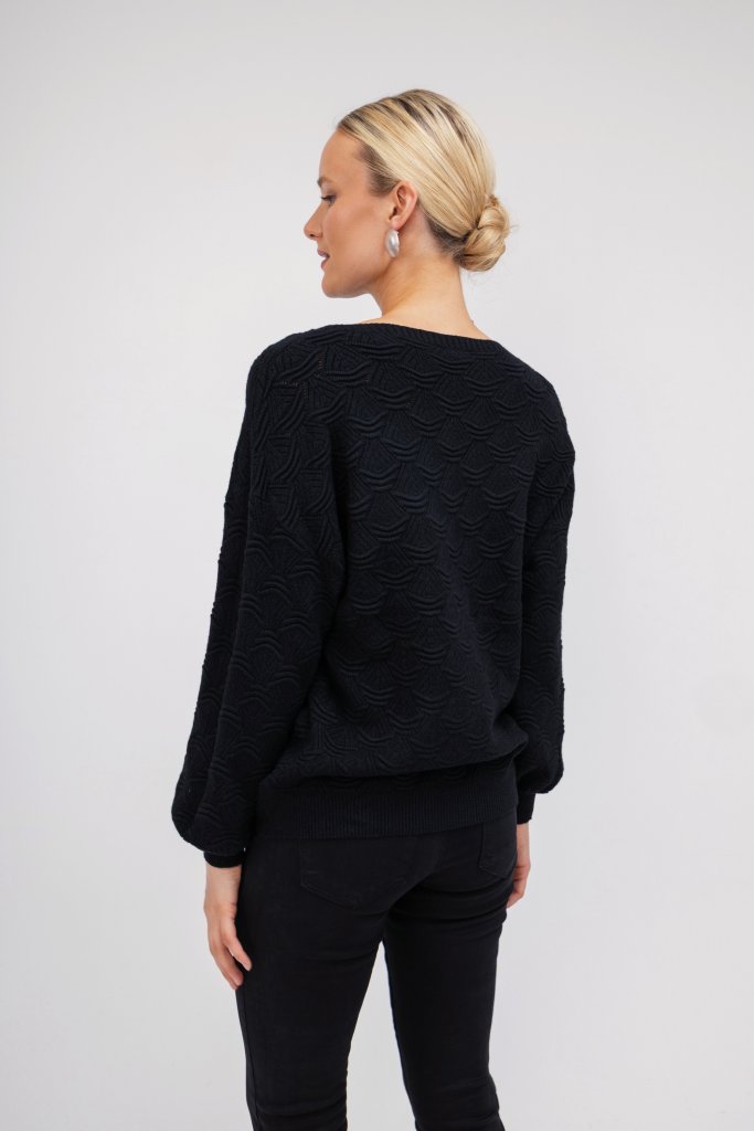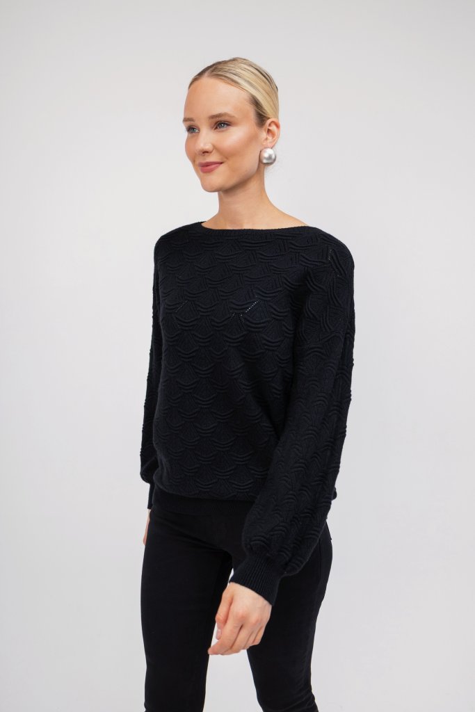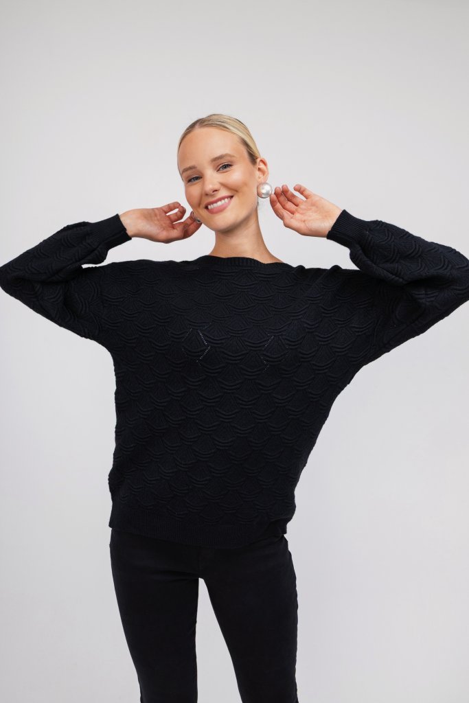 Γυναικείο μαύρο πουλόβερ με ανάγλυφο σχέδιο. Διαθέτει λάστιχο στο τελειώμα των μανικιών και κλειστή λαιμόκοψη. Ένα μονόχρωμο και ζεστό σχέδιο που θα λατρέψετε για τις κρύες ημέρες του χειμώνα.
