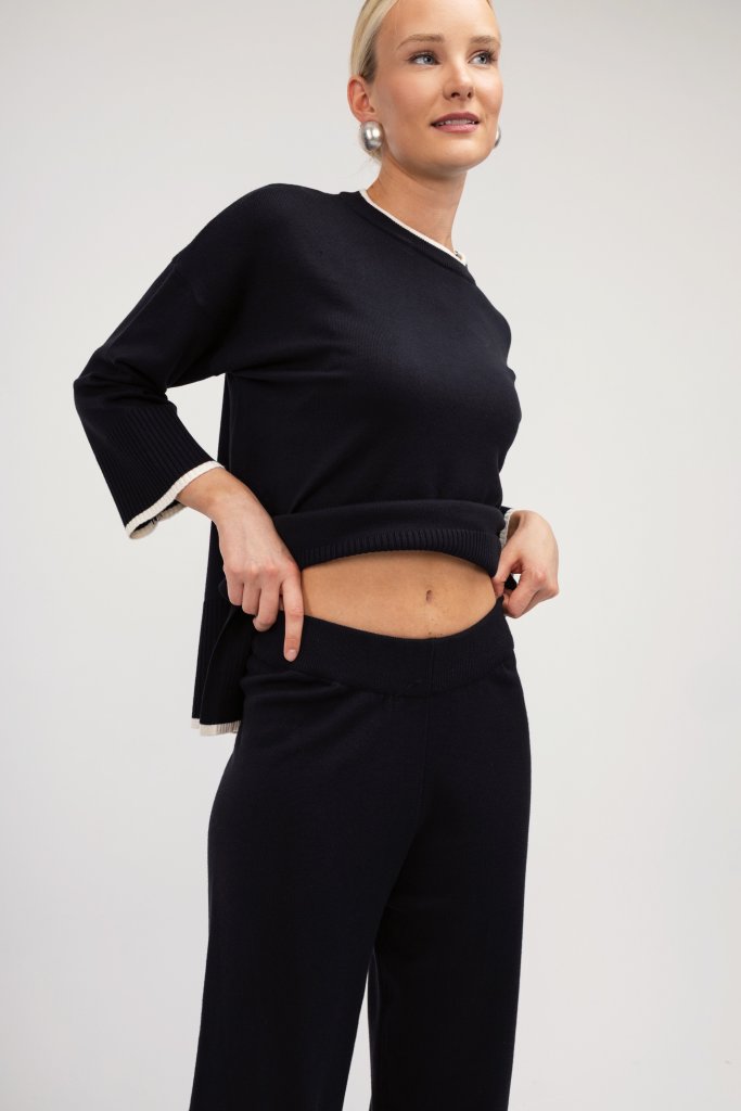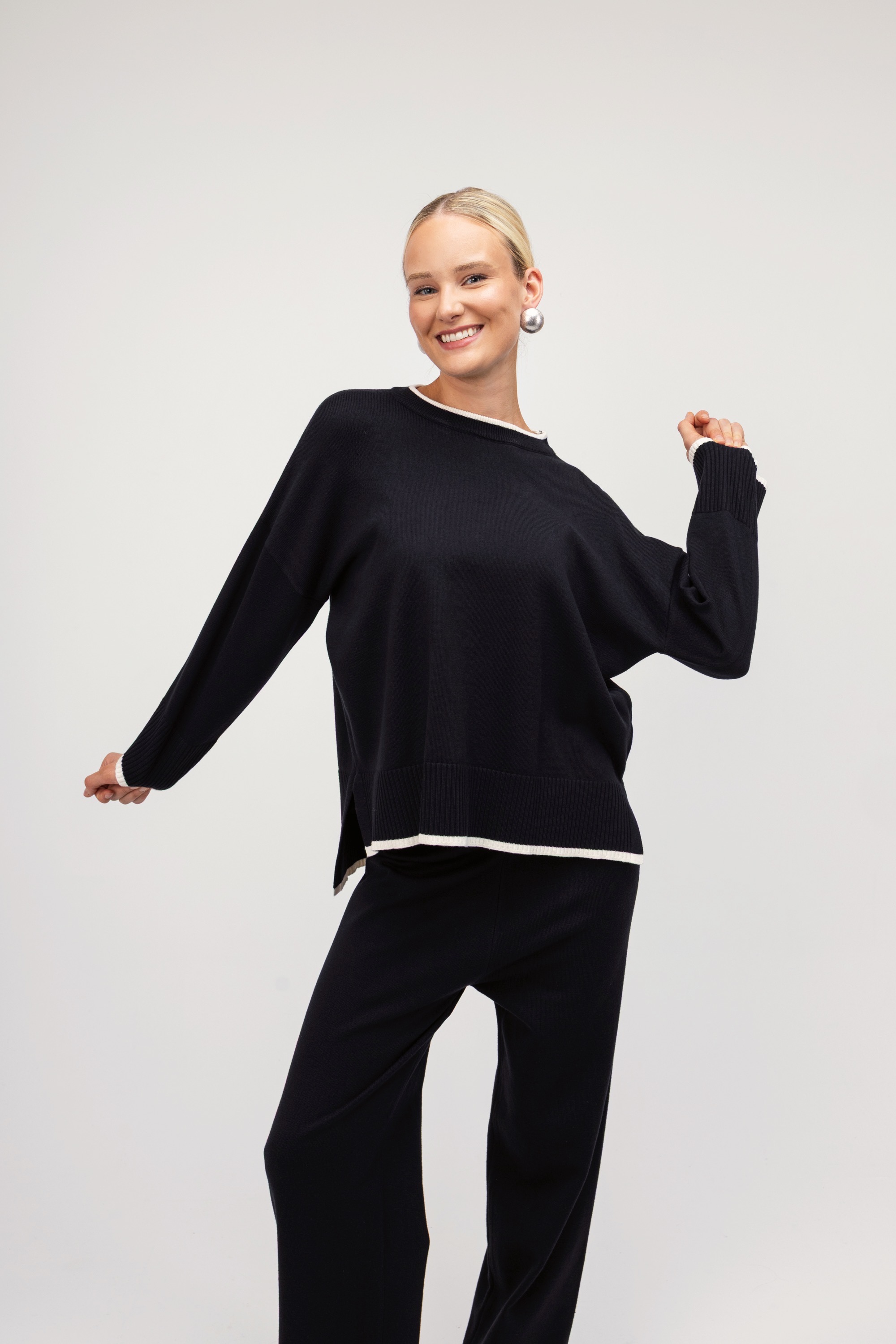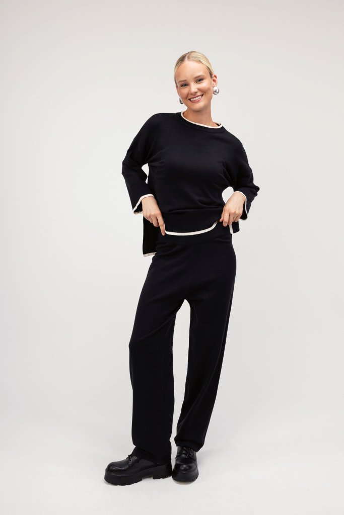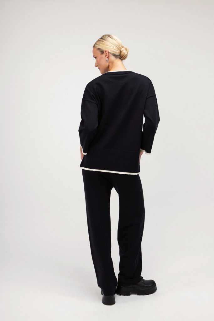 Γυναικείο Πουλόβερ μαύρο με απλό σχεδιασμό και λευκές λεπτομέρείες. Μια δημιουργία που μπορεί να φορεθεί από το πρωί μέχρι το βράδυ.