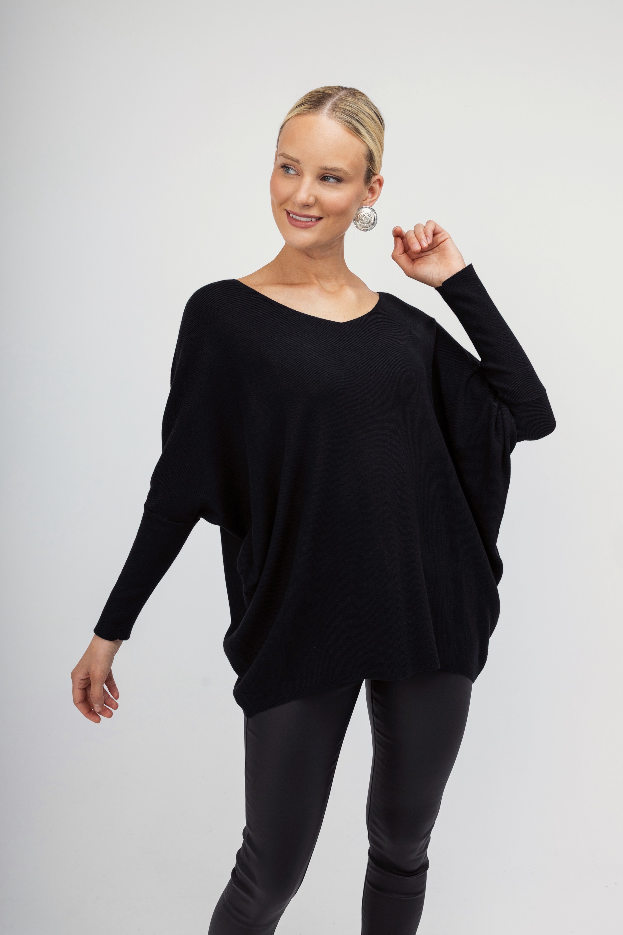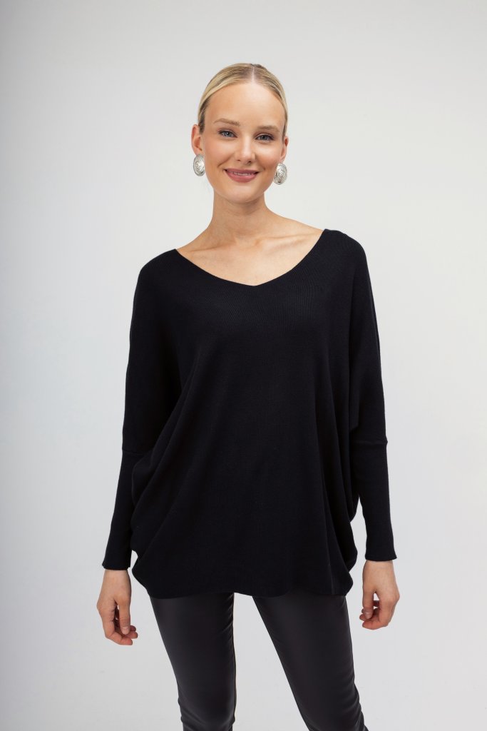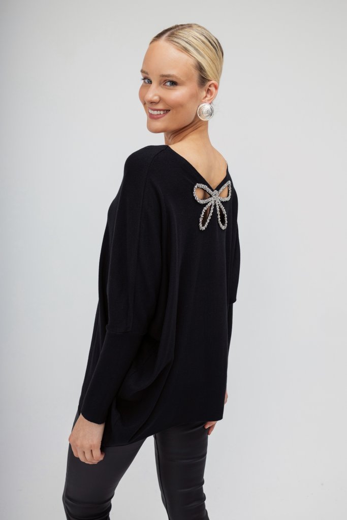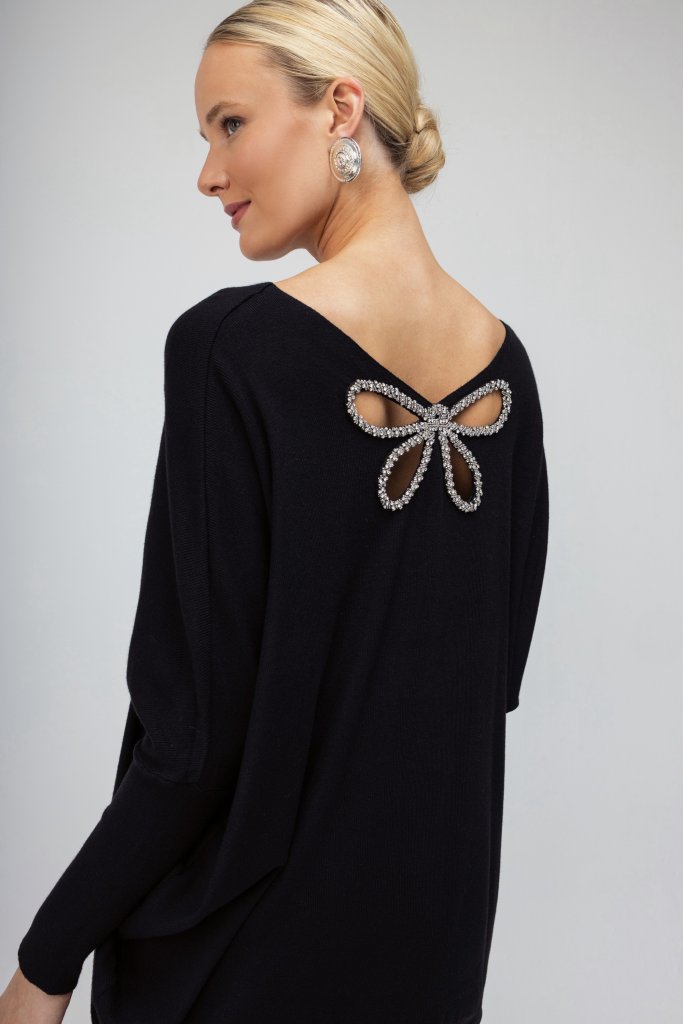 Γυναικείο πουλόβερ μαύρο σε άνετη γραμμή διακοσμημένο με strass σε σχέδιο πεταλούδας στο πίσω μέρος. Μοντέρνος σχεδιασμός που θα ανανεώσει τα καθημερινά σας outfit.