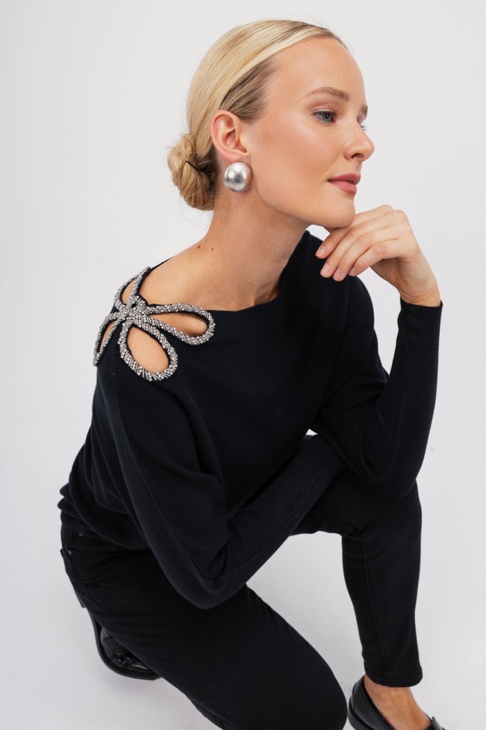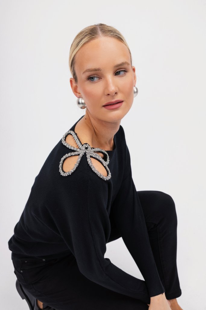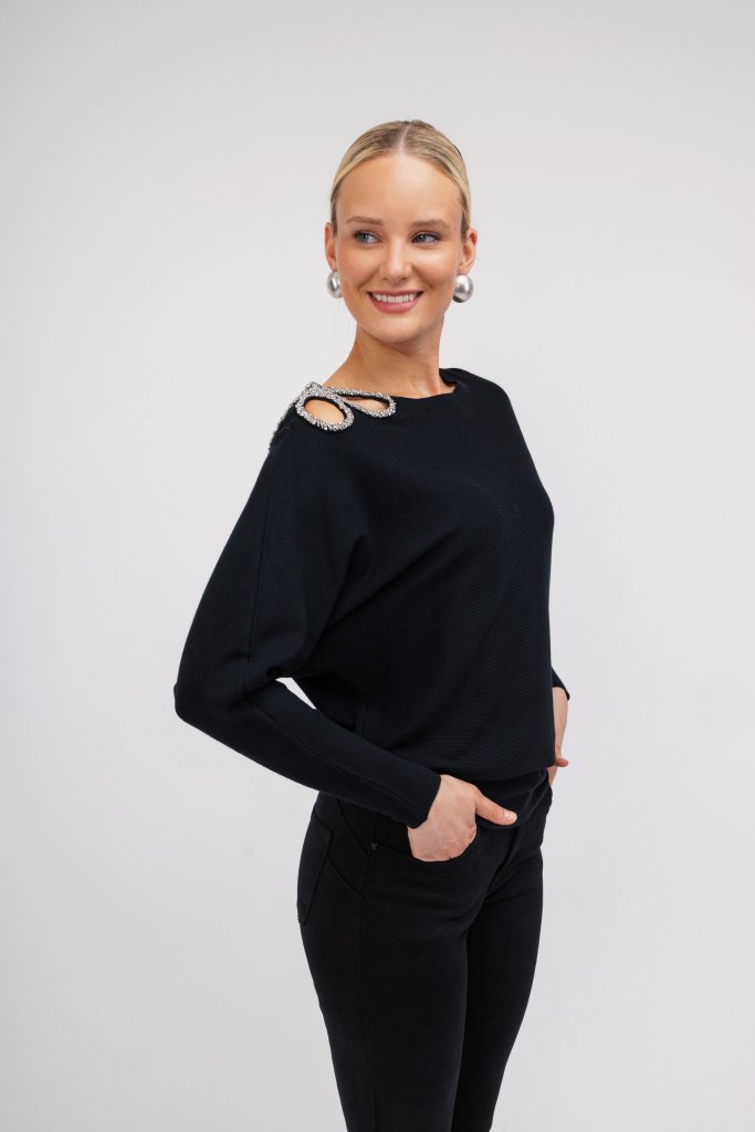 Γυναικείο πουλόβερ μαύρο με σχέδιο από strass στον ώμο. Ένα μοντέρνο σχέδιο που μπορεί να αναβαθμίσει το καθημερινό σας outfit.