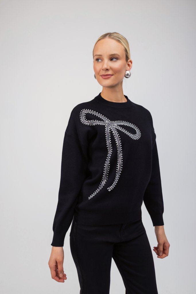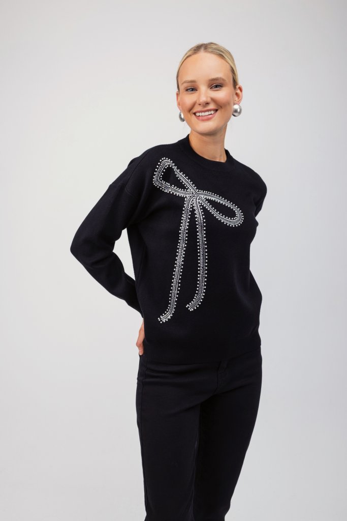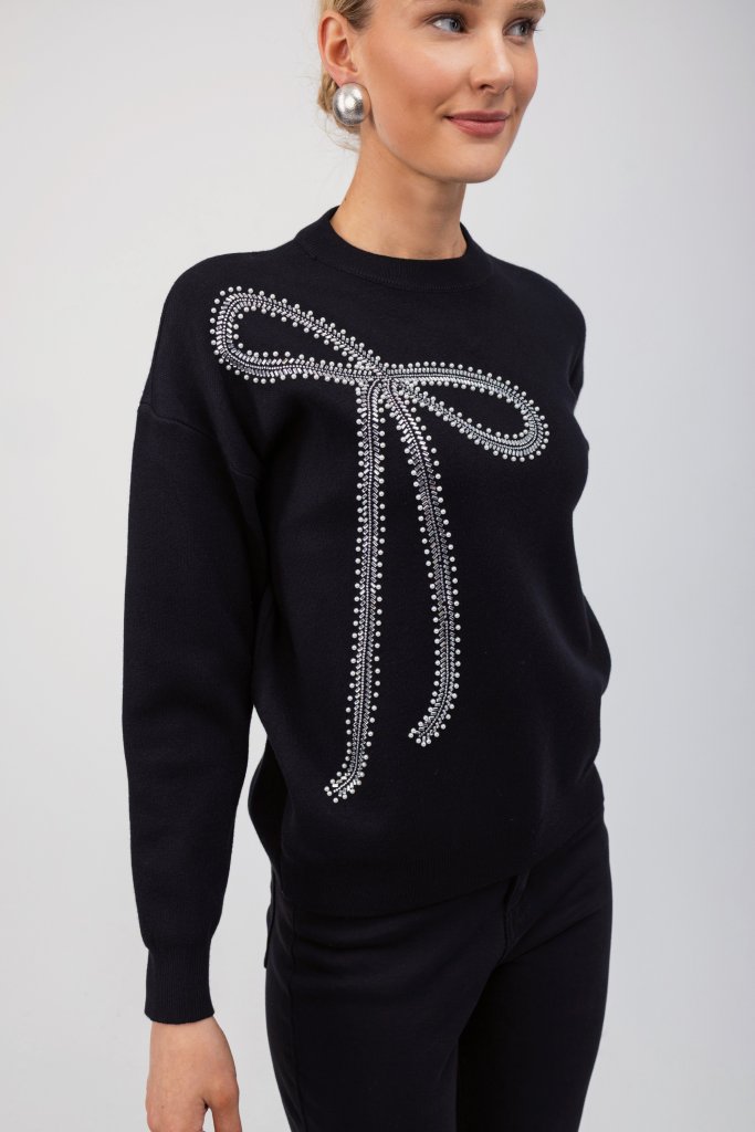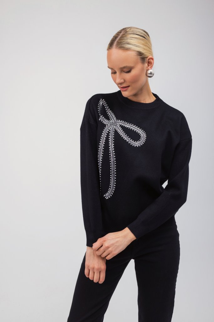 Γυναικείο Πουλόβερ μαύρο με σχέδιο φίογκο από strass. Διαθέτει λάστιχο στο τελειώμα των μανικιών και κλειστή λαιμόκοψη. Ένα χειμερινό σχέδιο που θα σας κρατήσει ζεστές και κομψές σε κάθε σας εμφάνιση.