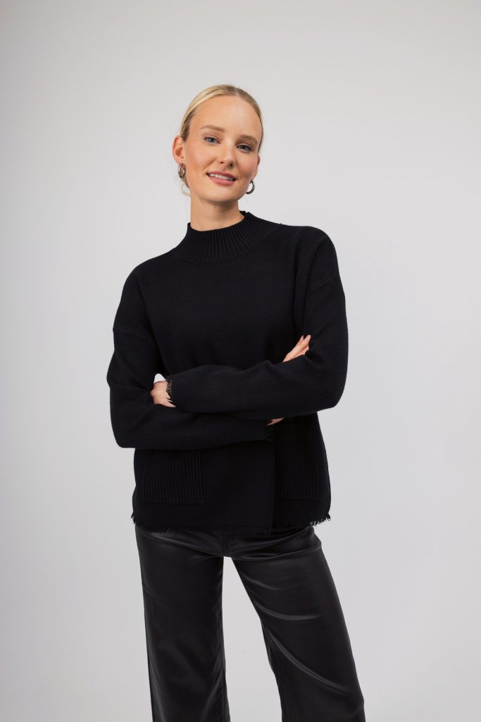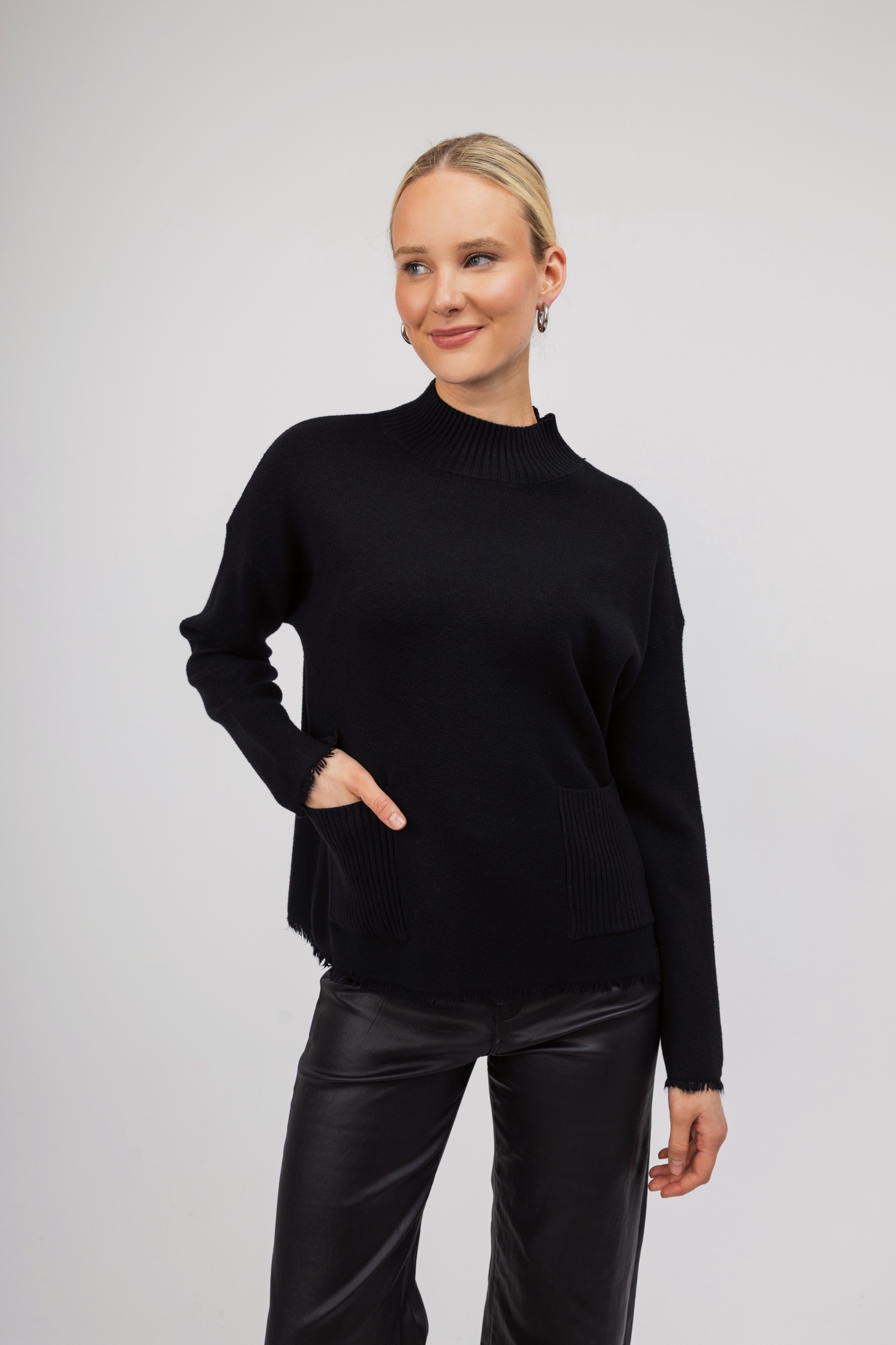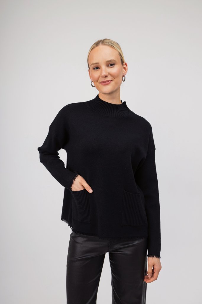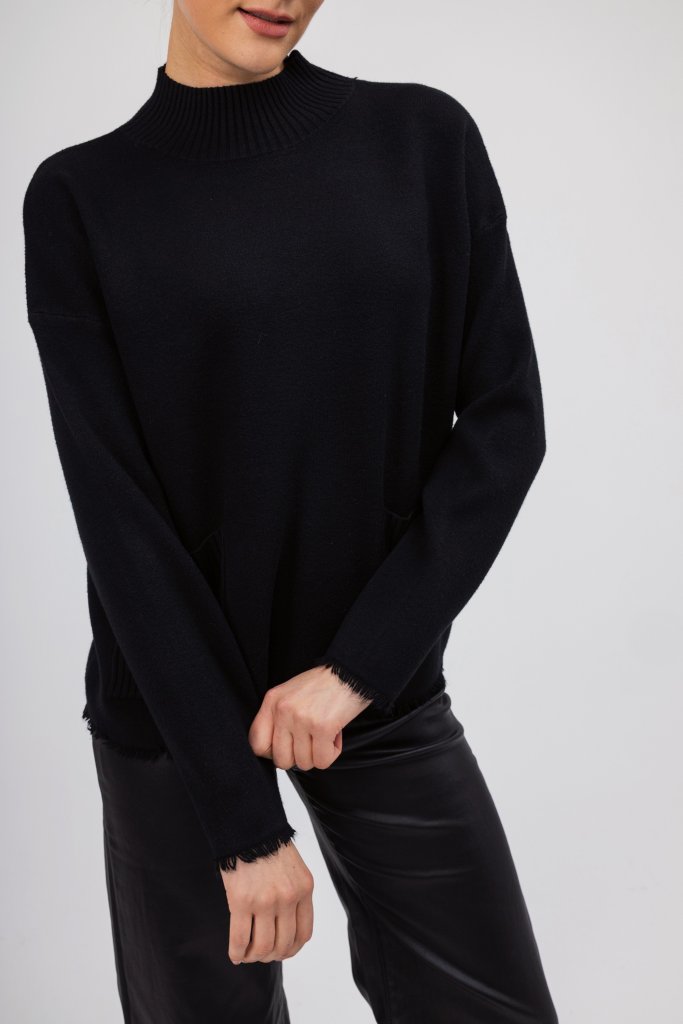 Γυναικείο πουλόβερ μαύρο με τσέπες και κλειστή, ψηλή λαιμόκοψη τύπου ζιβάγκο. Απαλό και ζεστό σχέδιο ιδανικό να φορεθεί στη δύσκολη καθημερινότητά σας.