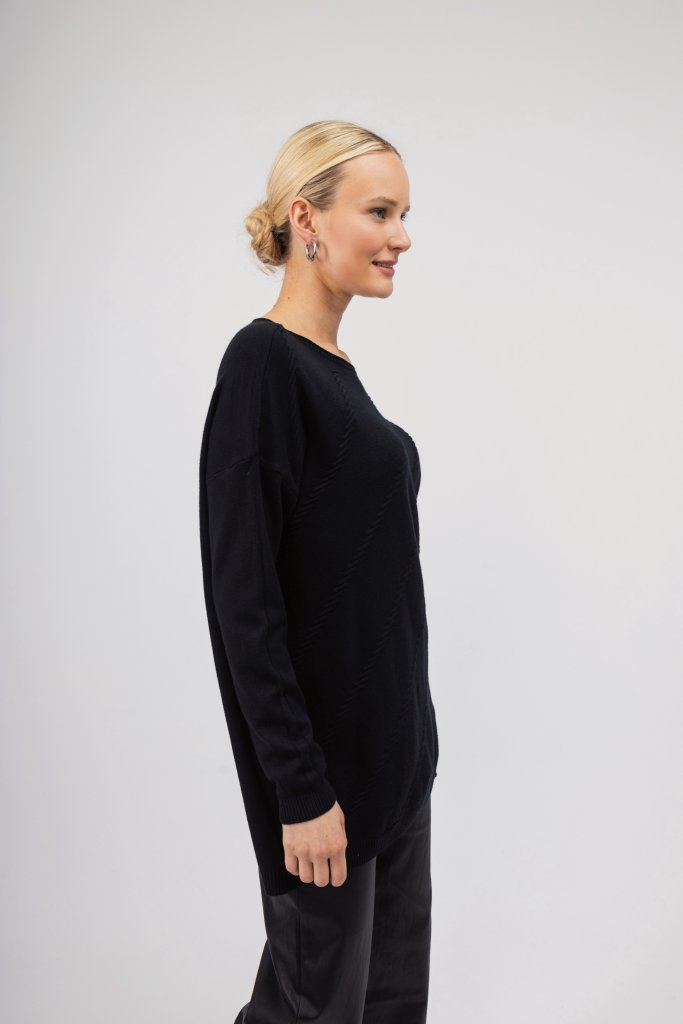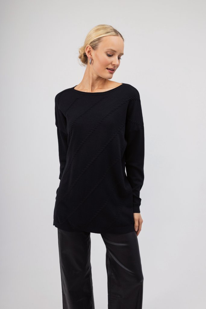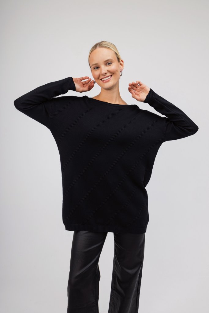 Γυναικείο Πουλόβερ μαύρο με διακριτικό σχέδιο στο μήκος του. Διαθέτει άνετη εφαρμογή και έχει σχεδιαστεί από απαλό υλικό άριστης ποιότητας. Μια μονόχρωμη επιλογή που θα γίνει το αγαπημένο σας κομμάτι για τις καθημερινές σας εμφανίσεις.