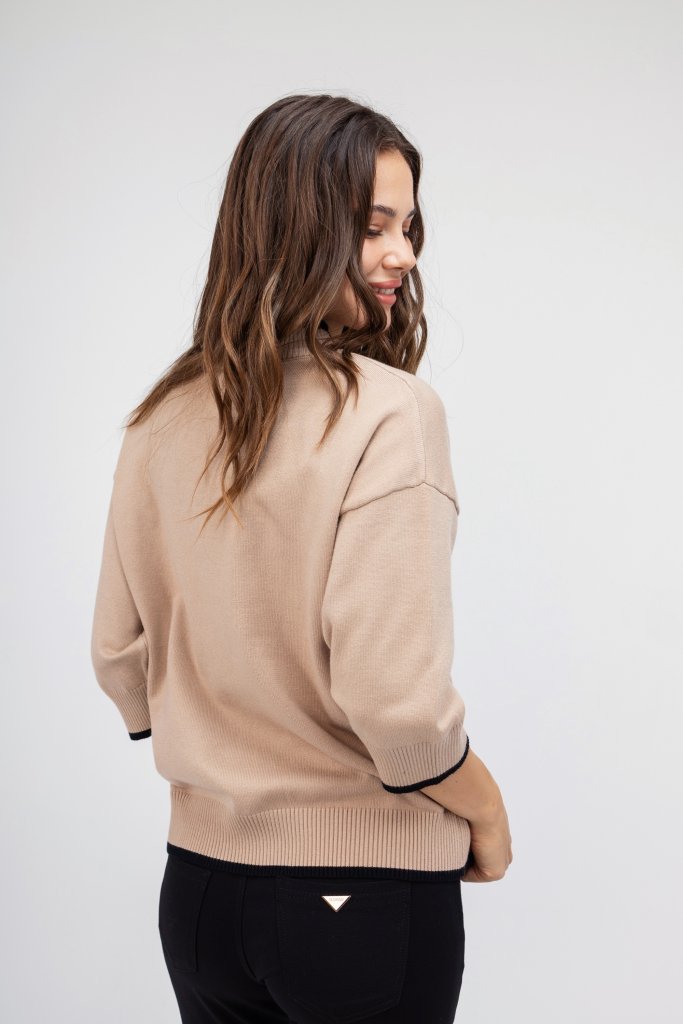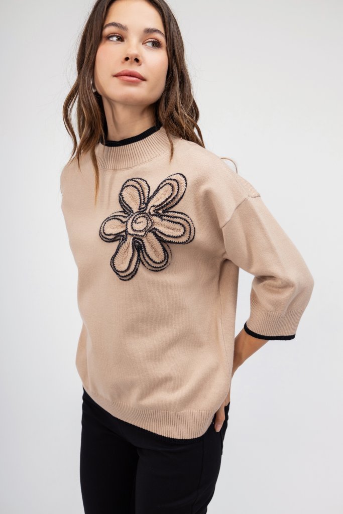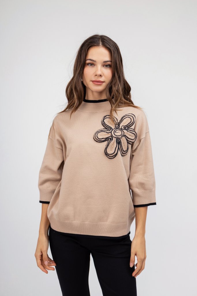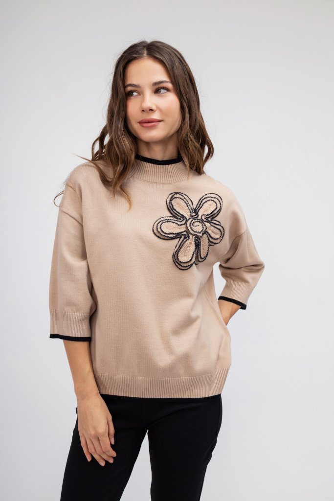 Γυναικείο πουλόβερ μπεζ με σχέδιο κεντητό λουλούδι. Διαθέτει κοντά μανίκια και μαύρες διακριτικές λεπτομέρείες. Μια κομψή δημιουργία που θα αναβαθμίσειτο χειμερινό σας outfit.