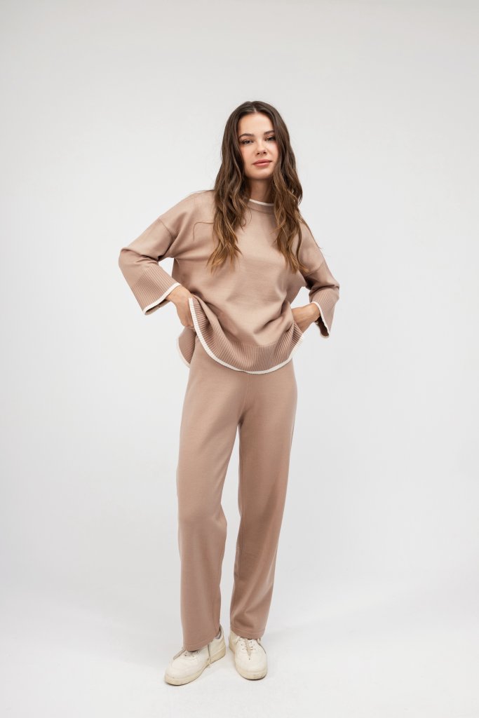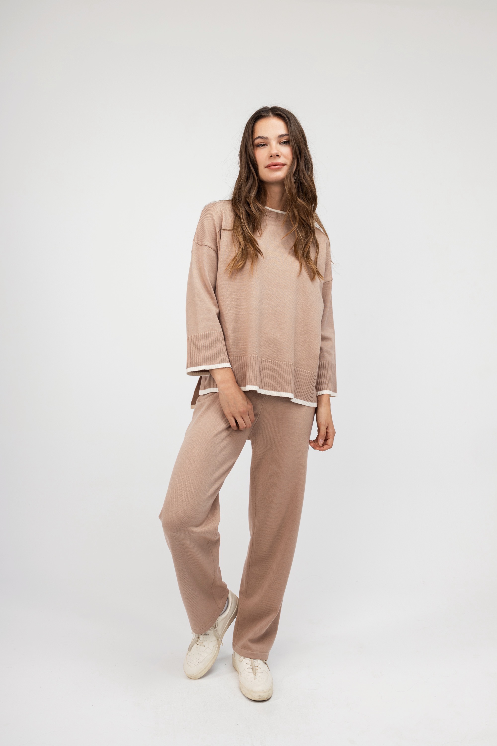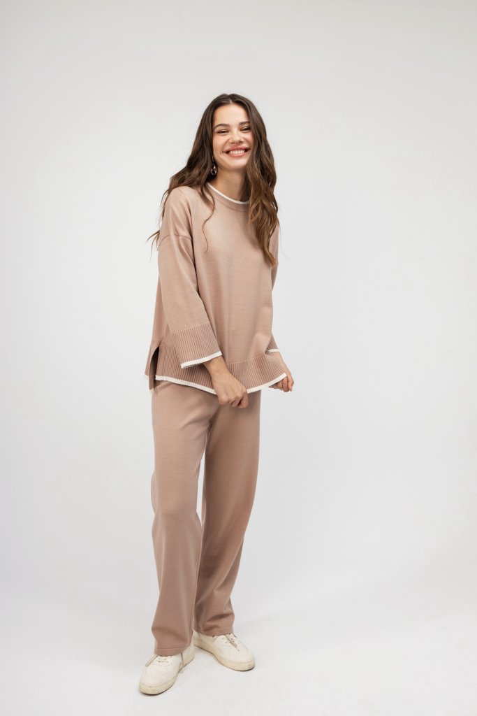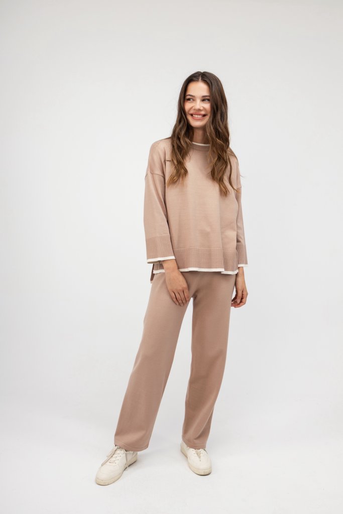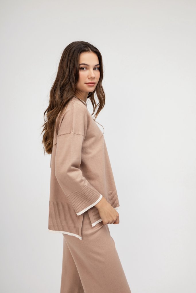 Γυναικείο Πουλόβερ μπεζ με απλό σχεδιασμό και λευκές λεπτομέρείες. Μια δημιουργία που μπορεί να φορεθεί από το πρωί μέχρι το βράδυ.