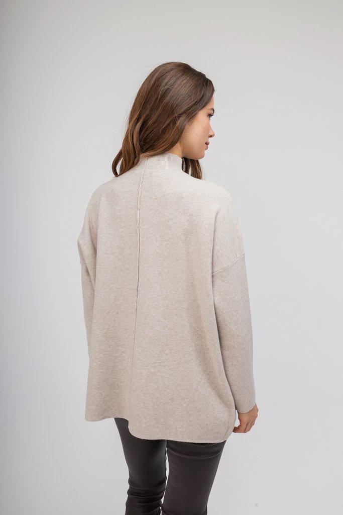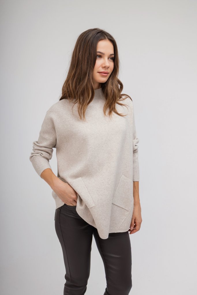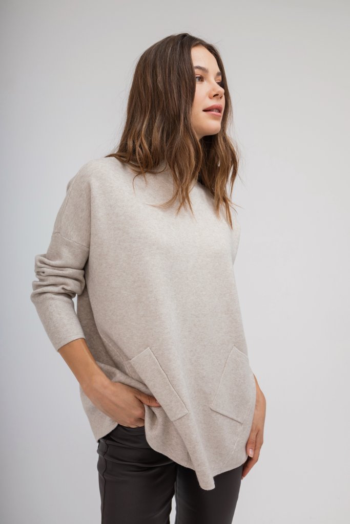 Γυναικείο Πουλόβερ ζιβάγκο μπεζ με τσέπες. Ένα μονόχρωμο και απλό σχέδιο που μπορεί να συνδυαστεί με πολλά σύνολα και να αναβαθμίσει το outfit σας.