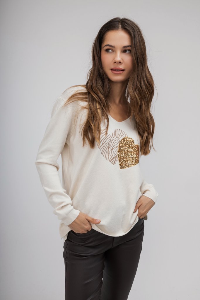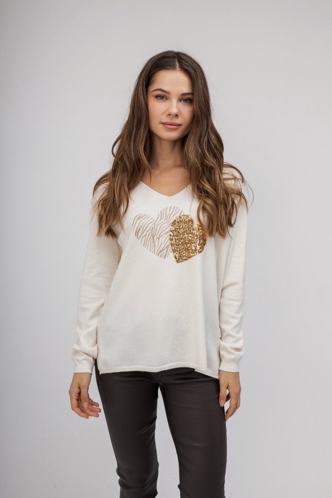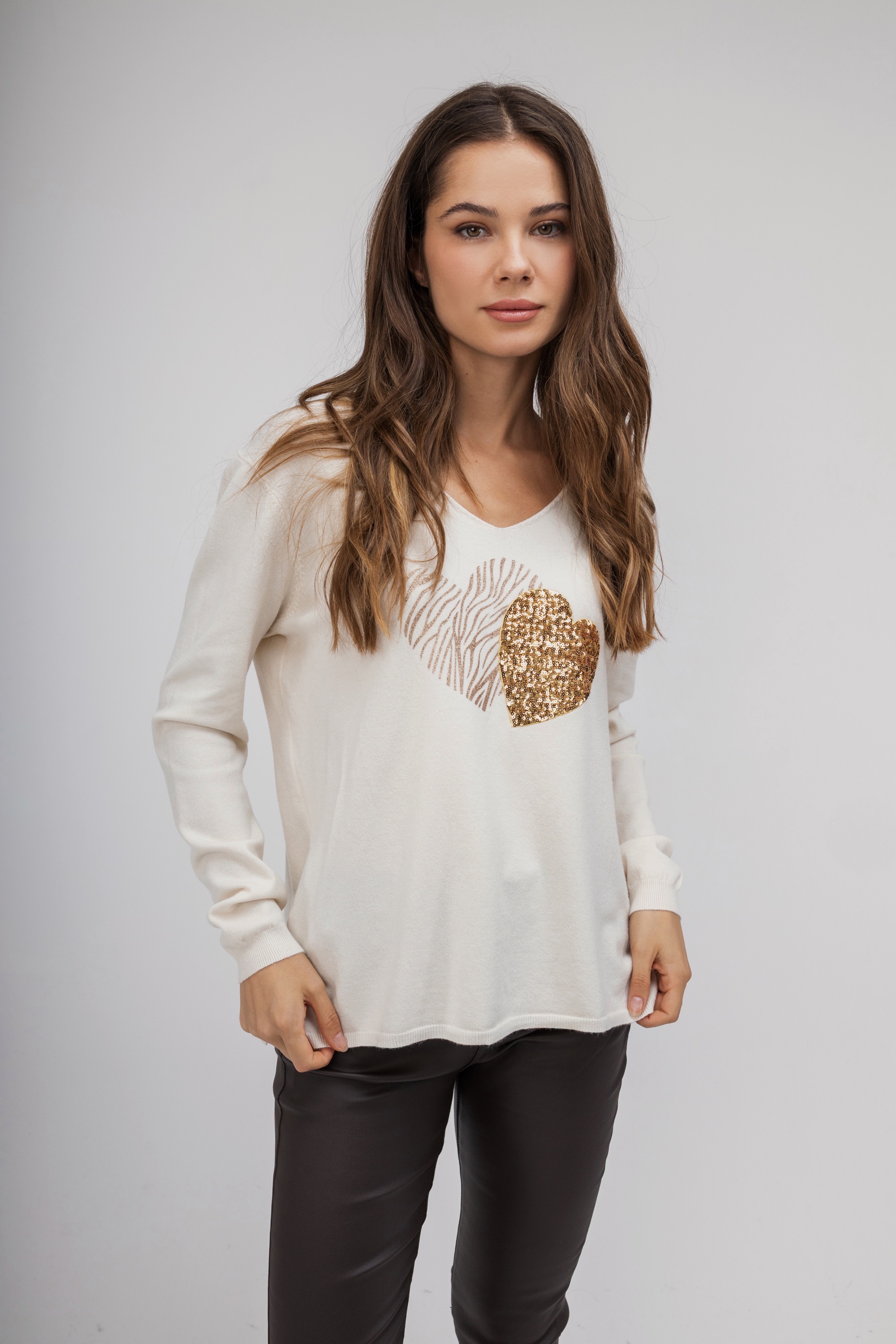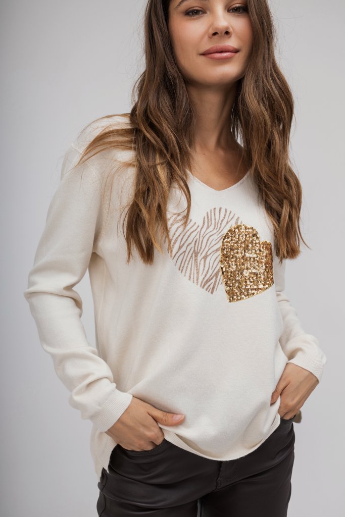 Γυναικείο πουλόβερ- μπλούζα εκρού με στάμπα καρδιά με λεπτομέρειες από παγίετες και animal print σ΄χεδιο . Ένα μοντέρνο και νεανικό σχέδιο που θα ανανεώσει το look σας.
