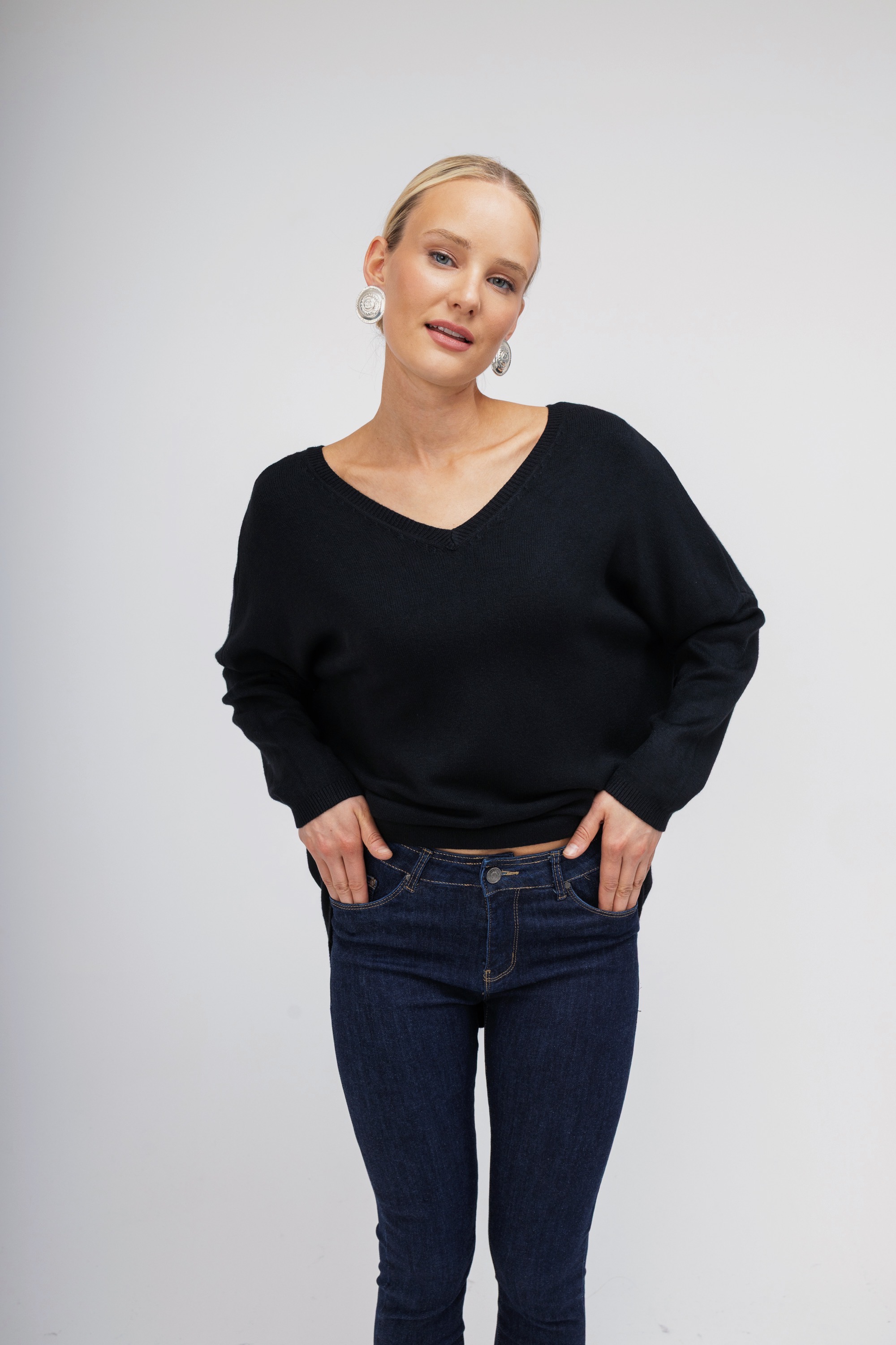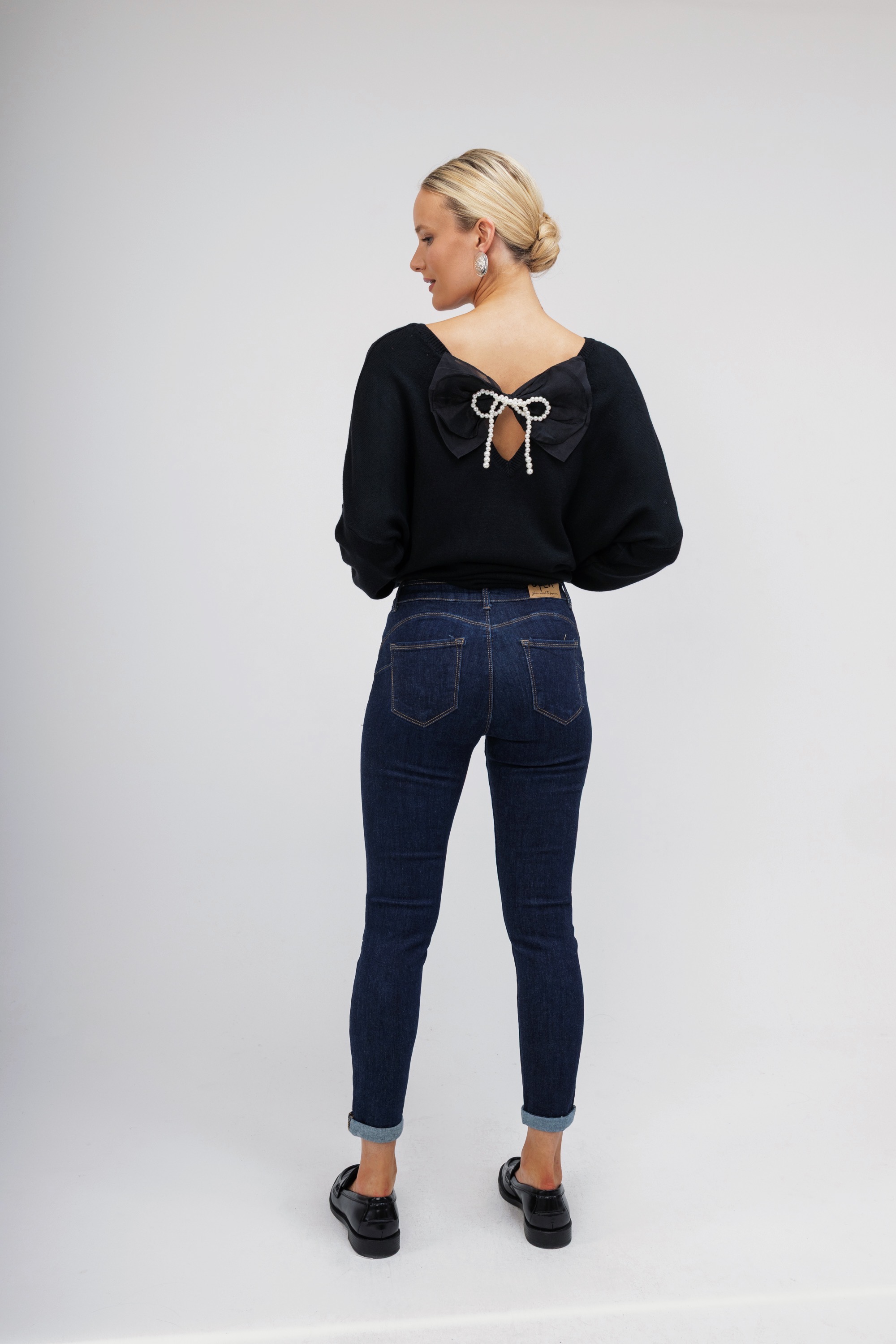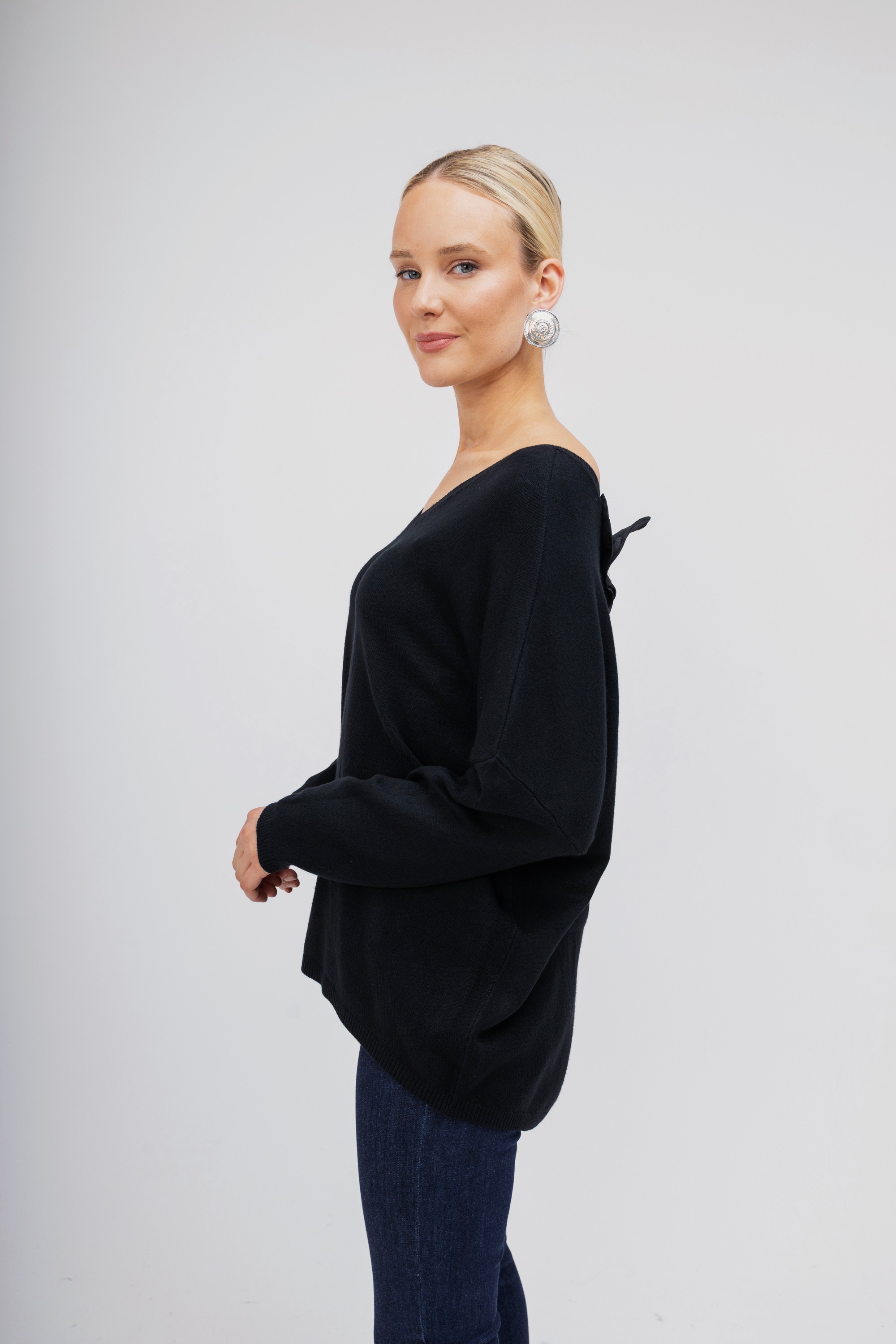 Γυναικείο πουλόβερ- μπλούζα μαύρη με εντυπωσιακό φίογκο στο πίσω μέρος και πέρλες.