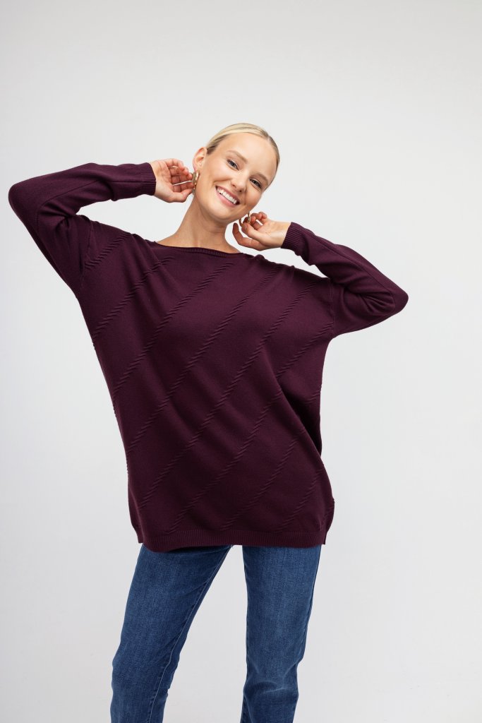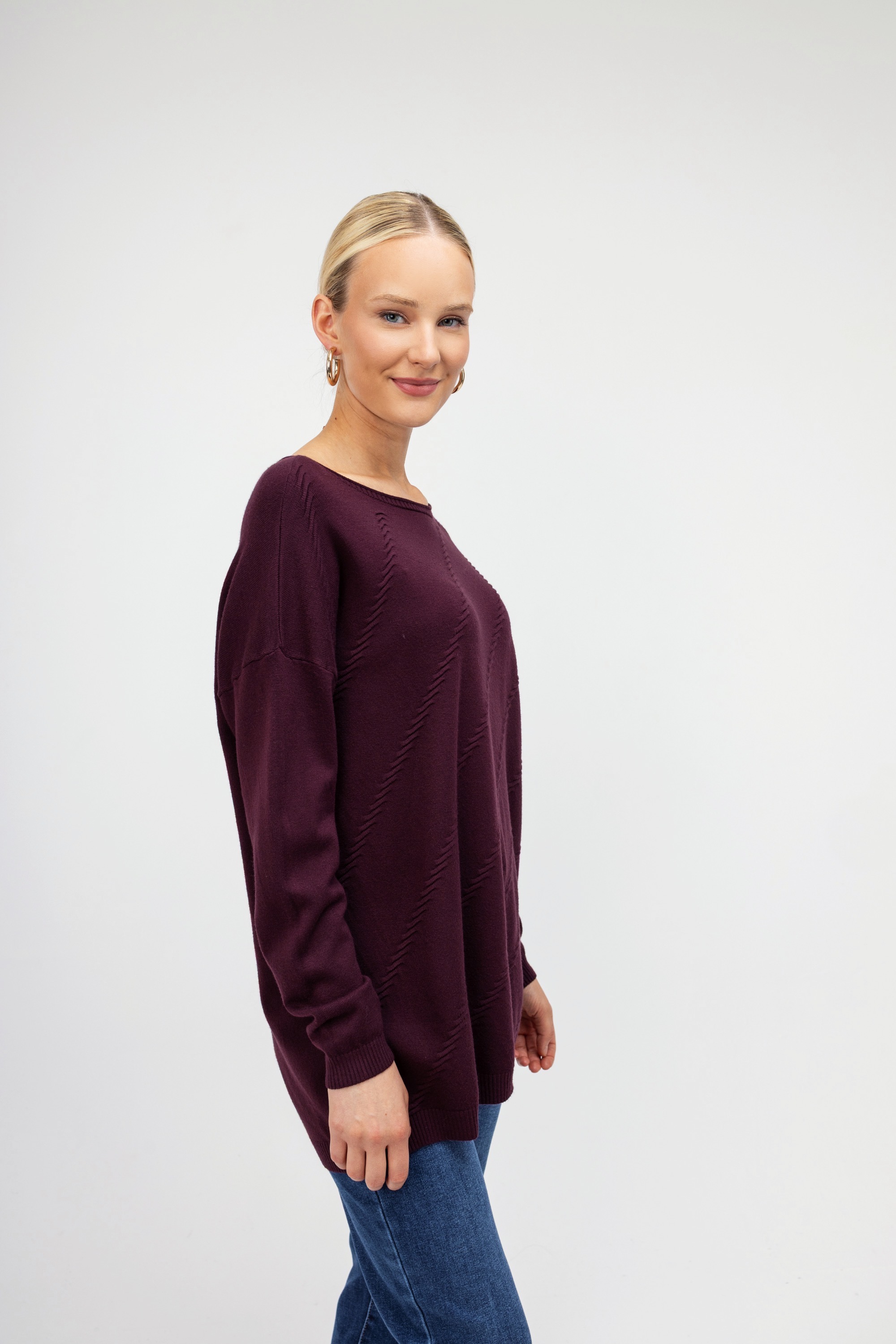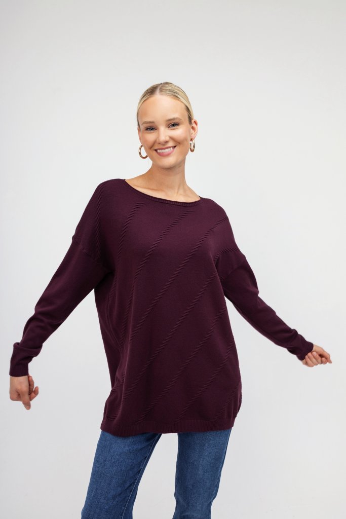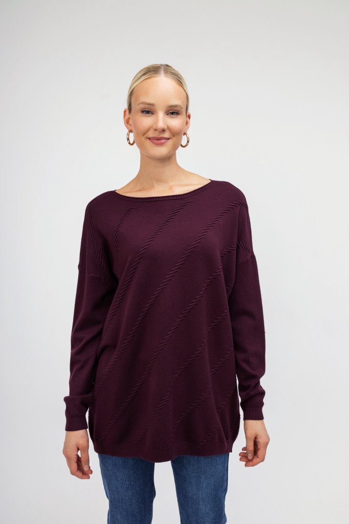 Γυναικείο Πουλόβερ μπορντώ με διακριτικό σχέδιο στο μήκος του. Διαθέτει άνετη εφαρμογή και έχει σχεδιαστεί από απαλό υλικό άριστης ποιότητας. Μια μονόχρωμη επιλογή που θα γίνει το αγαπημένο σας κομμάτι για τις καθημερινές σας εμφανίσεις.