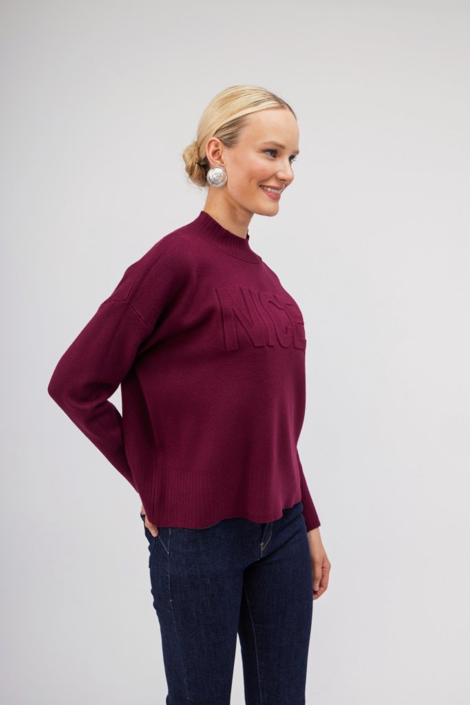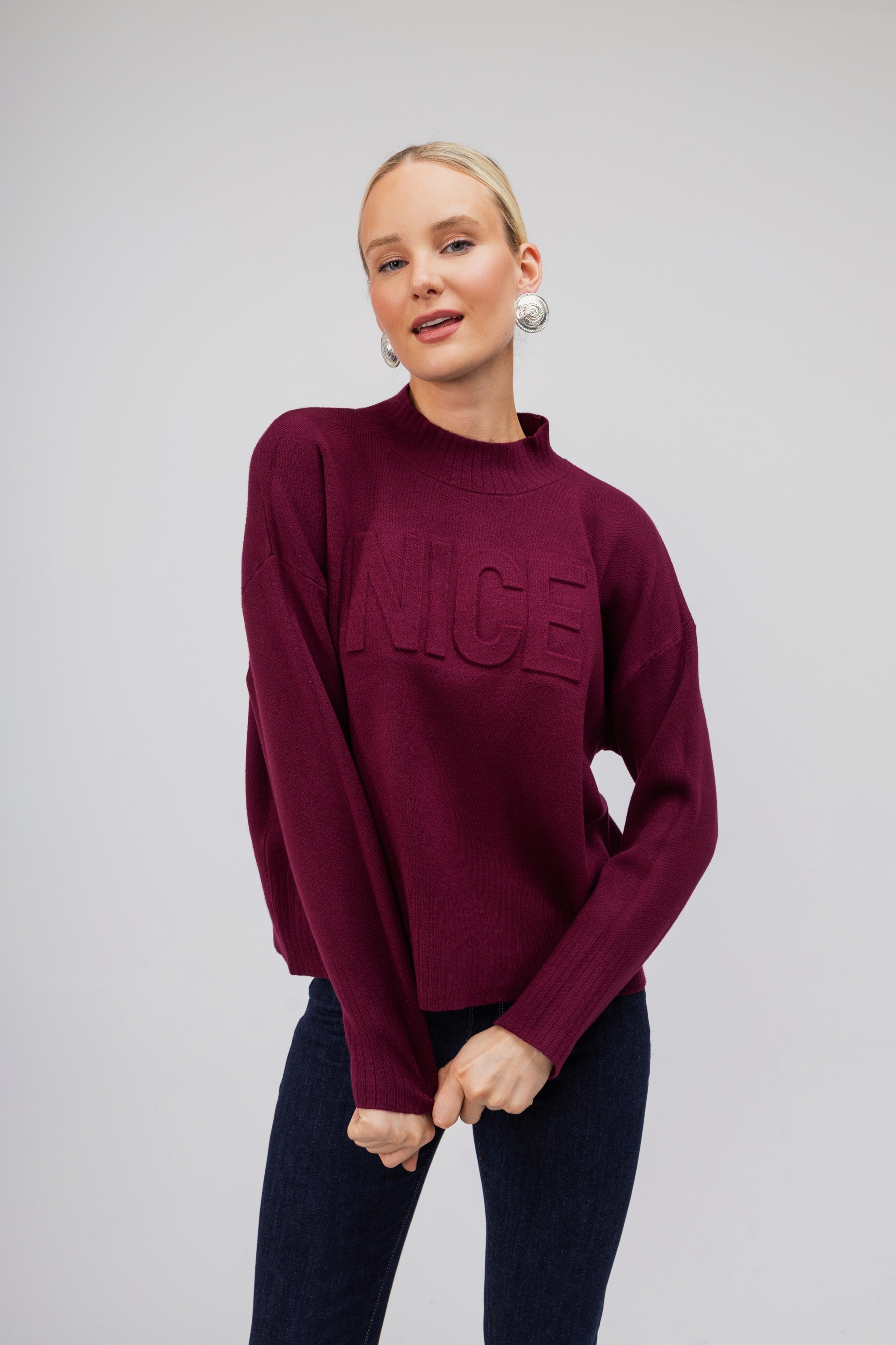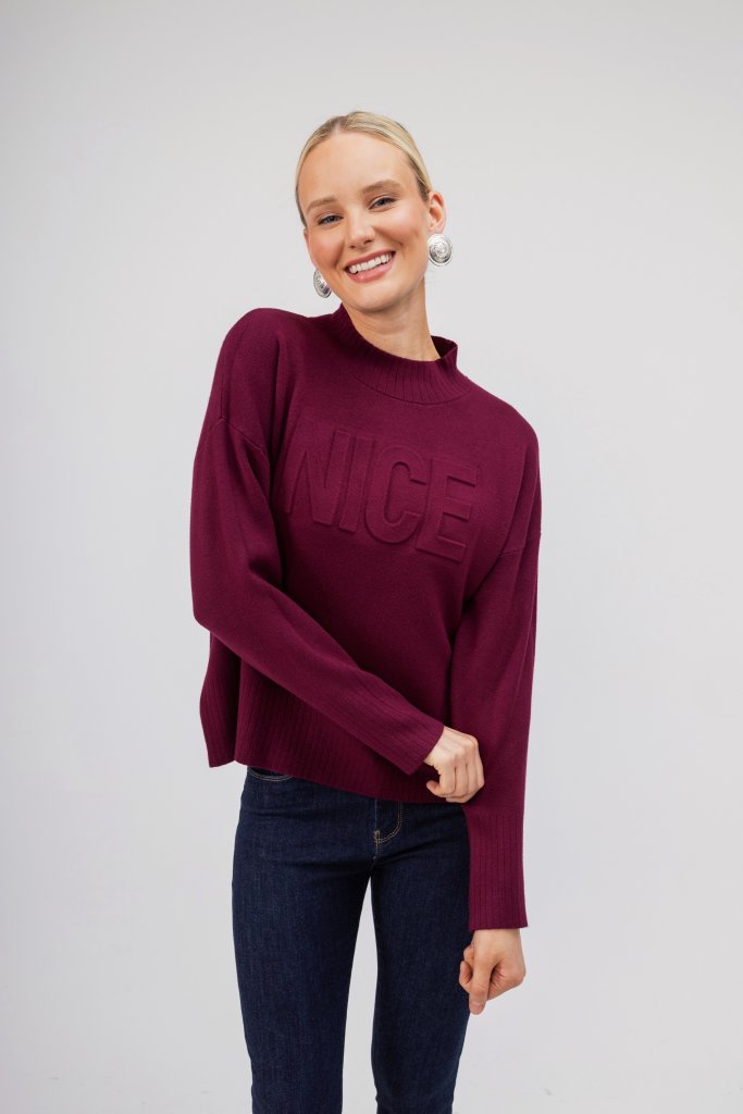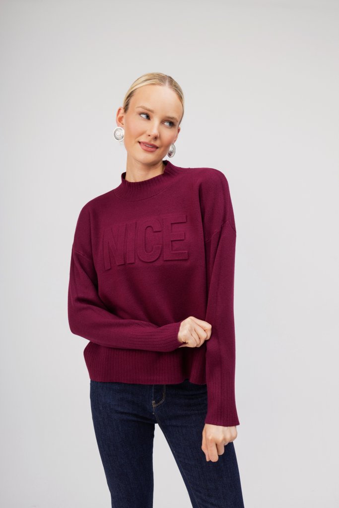 Γυναικείο μπορντώ πουλόβερ με τη λέξη Nice στο μπροστινό μέρος. Ένα απλό σχέδιο με εξαιρετικά απαλή υφή που μπορεί να φορεθεί με πολλά σύνολα και να ανανέωσει το casual στιλ σας.