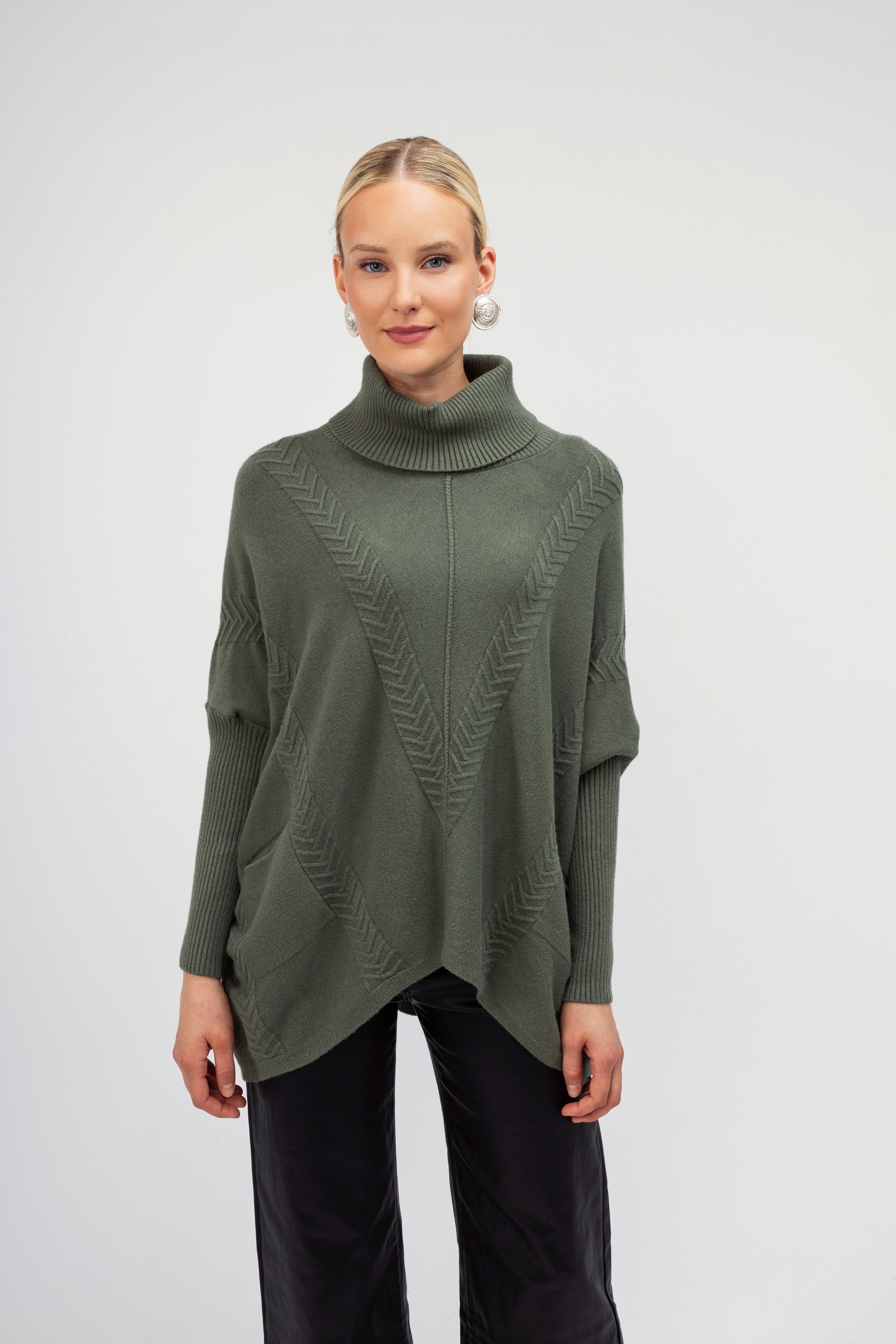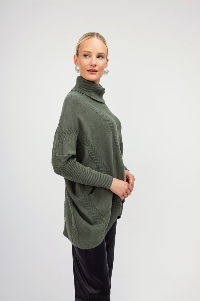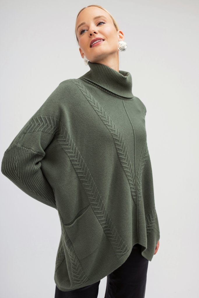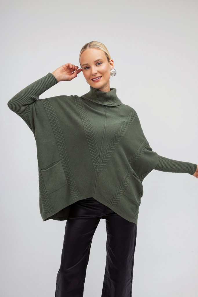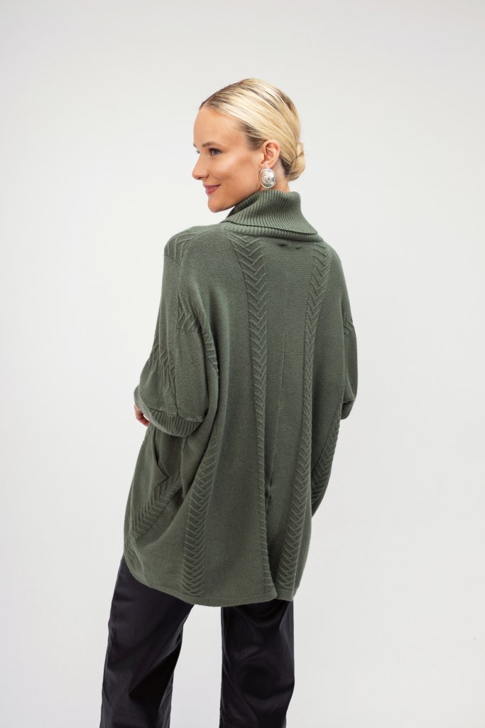 Γυναικείο πουλόβερ ζιβάγκο χακί με ανάγλυφο σχέδιο και άνετη γραμμή. Ένα μονόχρωμο σχεδιασμό που μπορεί να συνδυαστεί με πολλά χειμερινά outfit.