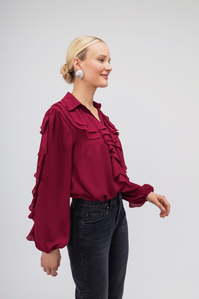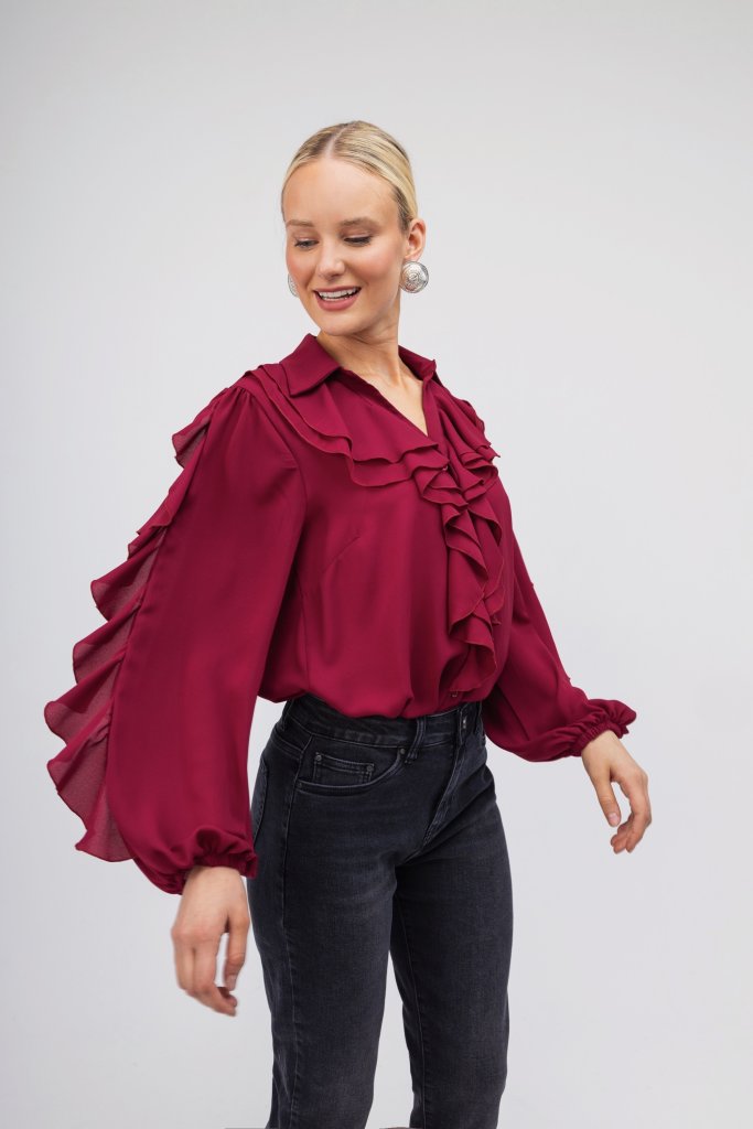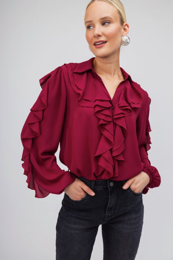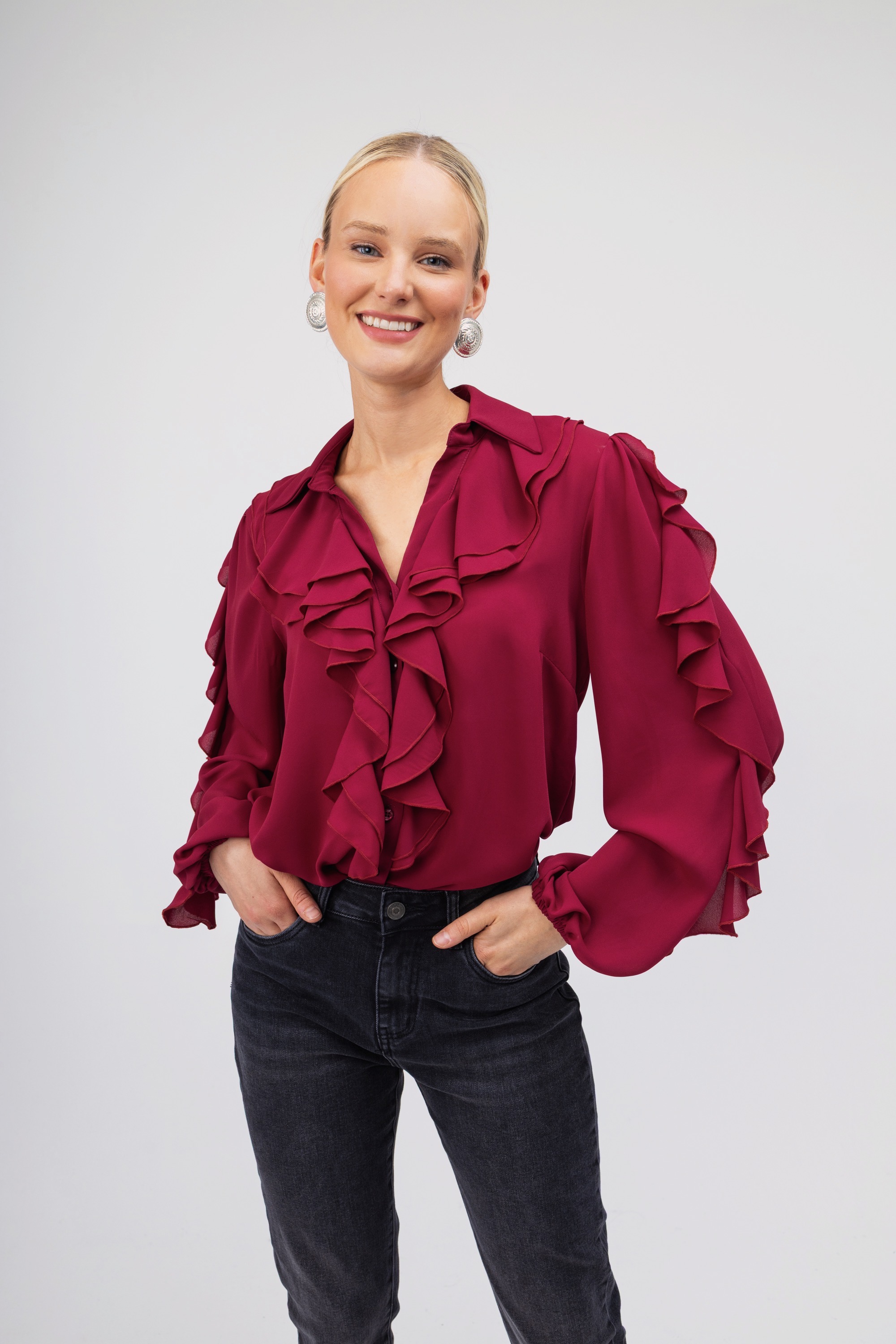 Λευκό γυναικείο πουκάμισο, διακοσμημένο με βολάν στην ίδια απόχρωση. Ένα άκρως εντυπωσιακό σχέδιο που θα σας χαρίσει το απόλυτο καθημερινό office look.