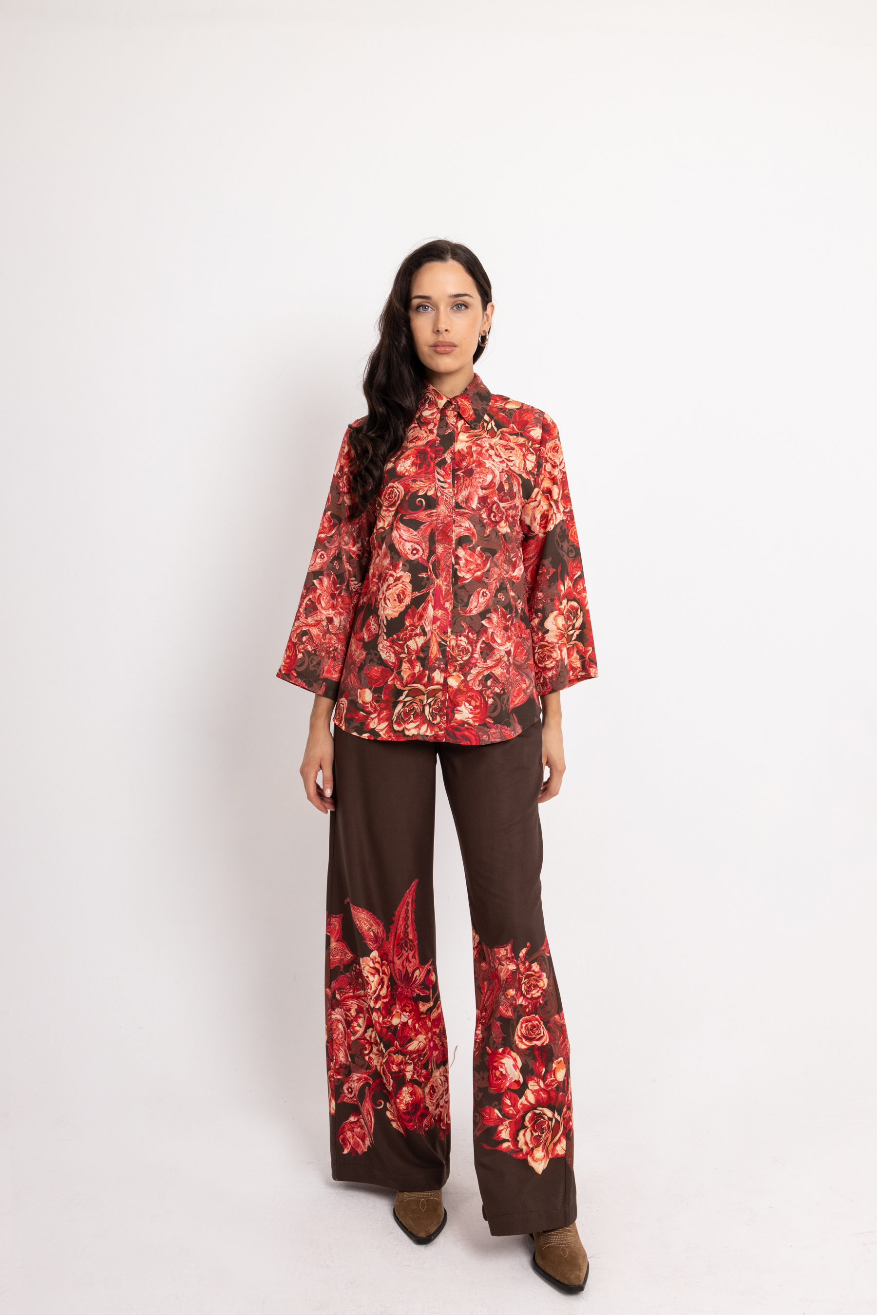 Μπλούζα-Πουκαμίσα με ιδιαίτερα σχέδια από λουλούδια κόκκινο. Διαθέτει γιακά και κλείνει με κουμπιά. Ένα μοντέρνο σχέδιο που θα ανανέωσει το outfit σας.