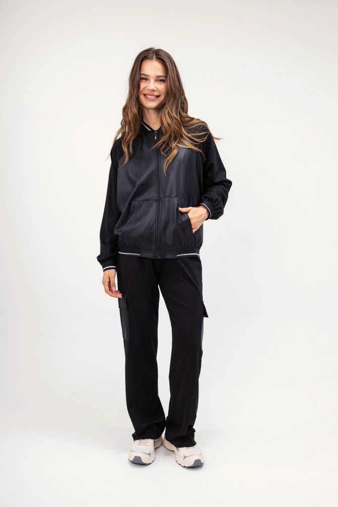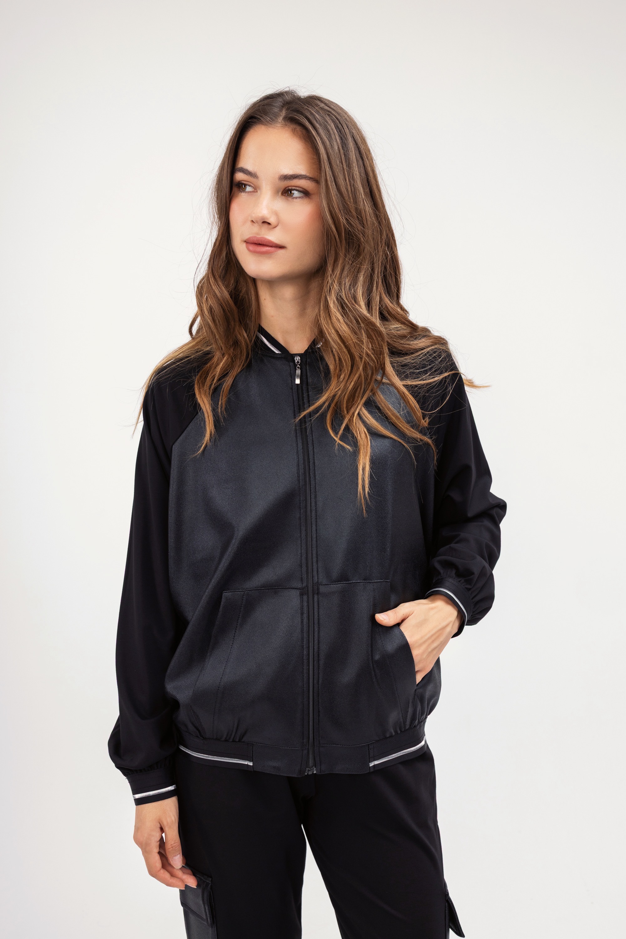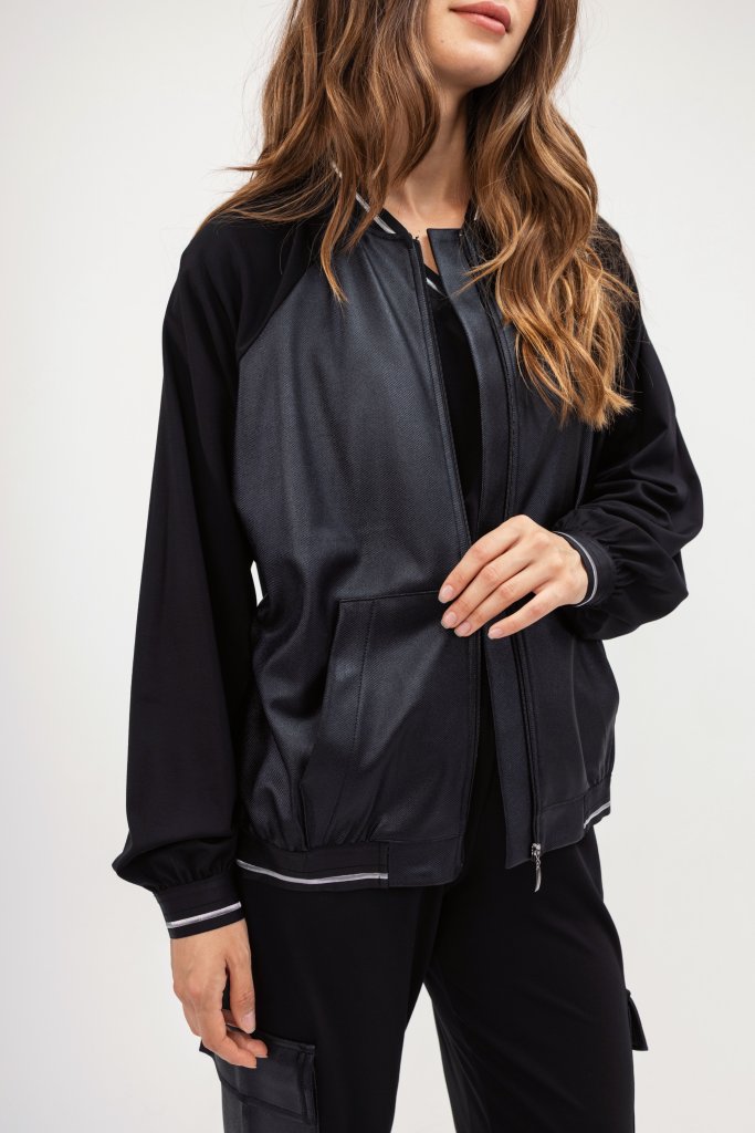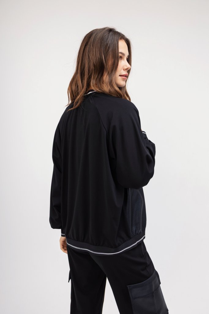 Γυναικεία ζακέτα μαύρη με ιδιαίτερο σχέδιο καθώς διαθέτει λεπτομέρειες από δύο υφάσματα. Κλείσιμο με φερμουάρ. Μια τέλεια επιλογή για να ολοκληρώσετε με τον καλύτερο τρόπο το athleisure στυλ σας.