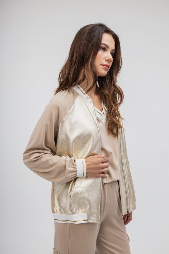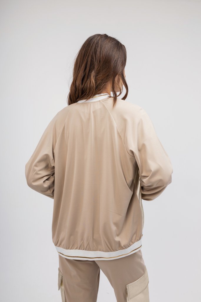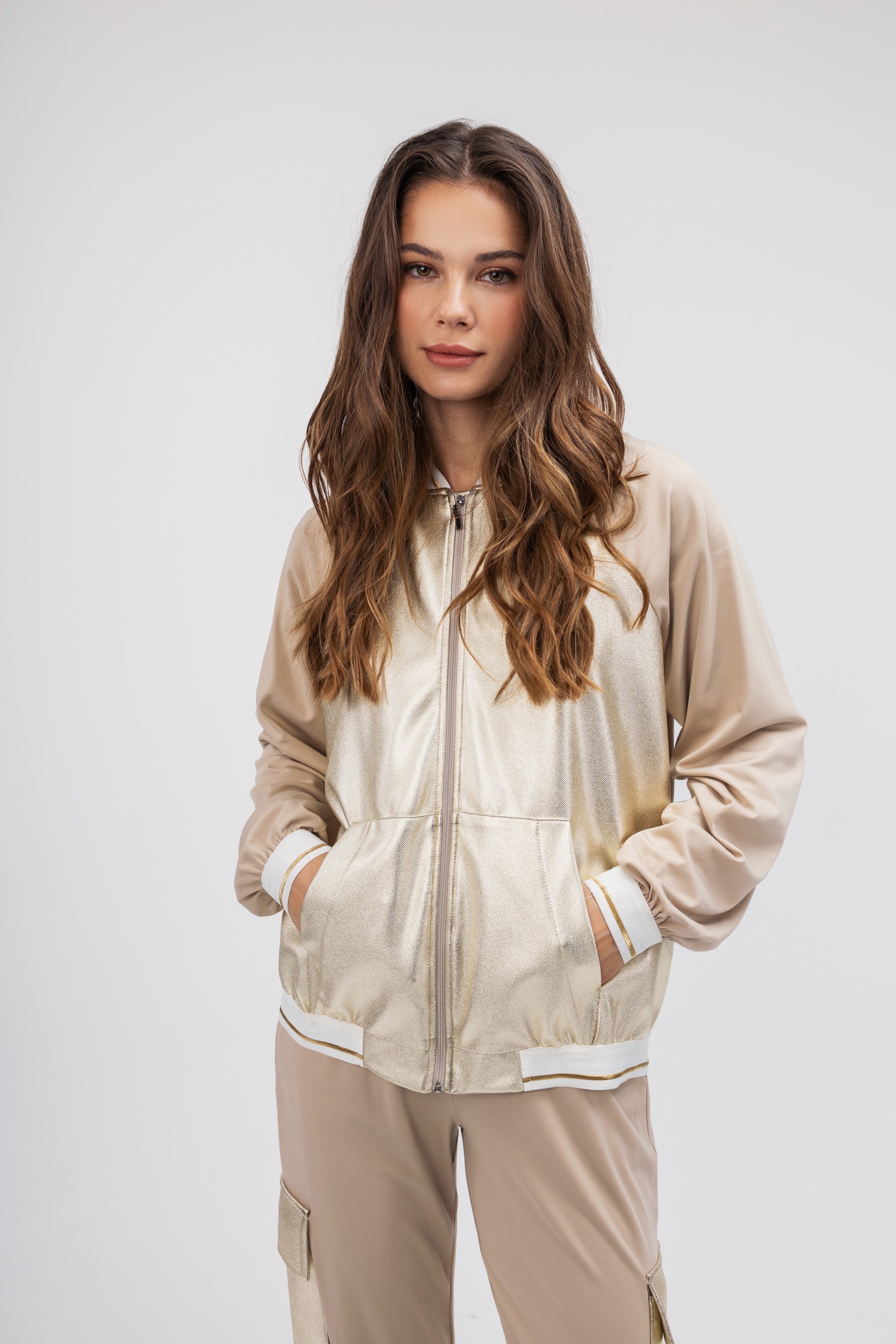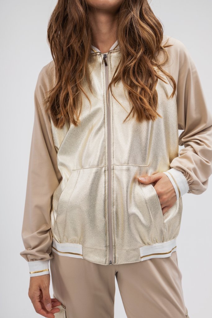 Γυναικεία ζακέτα μπεζ με ιδιαίτερο σχέδιο καθώς διαθέτει λεπτομέρειες από δύο υφάσματα. Κλείσιμο με φερμουάρ. Μια τέλεια επιλογή για να ολοκληρώσετε με τον καλύτερο τρόπο το athleisure στυλ σας.