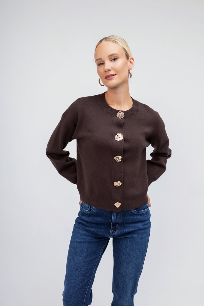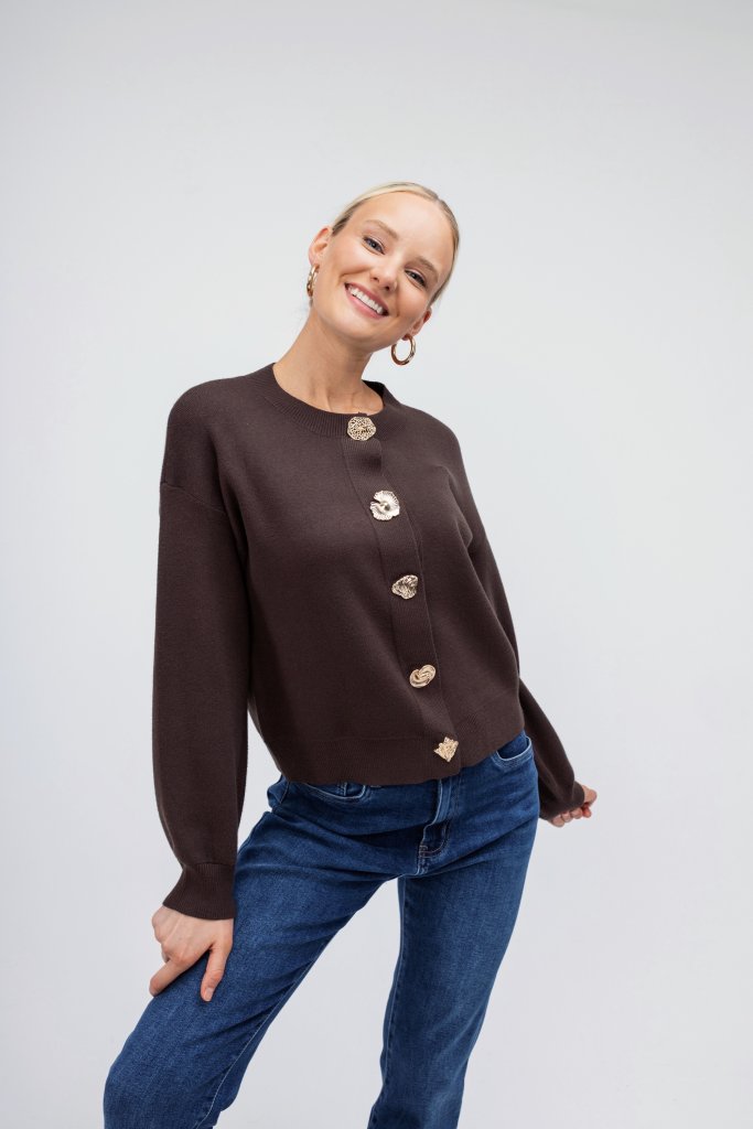 Ζακέτα-Πουλόβερ καφέ με χρυσά εντυπωσιακά κουμπιά σαν κοχύλια